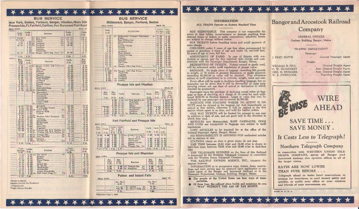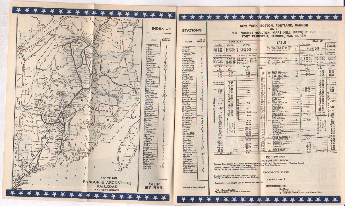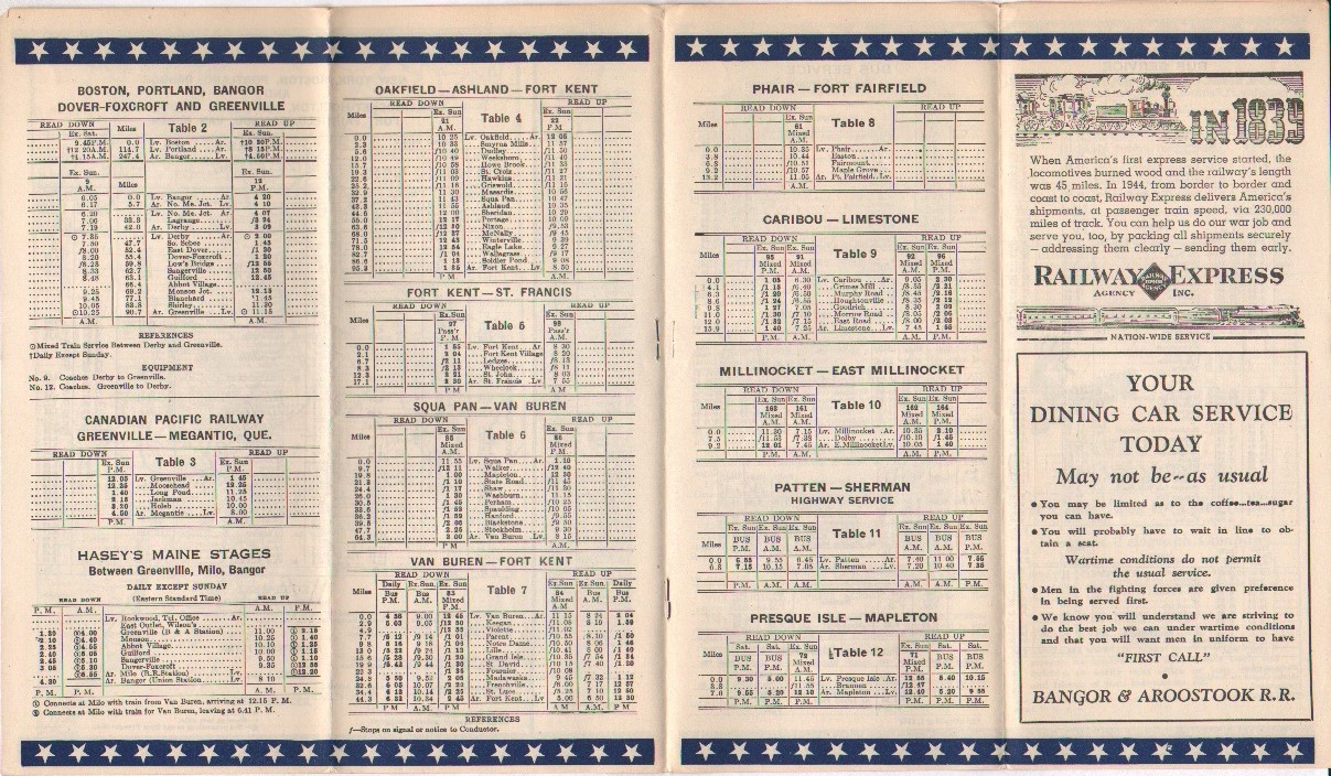 A routing change between January and April and a small addition on the bus side of things seem to be the major changes between this timetable and the last. Trains 3 and 4 are no longer following the Aroostook Flyer and Potatoland Special's route via Houlton coming up what one could describe as the East route on the way to Presque Isle, Caribou and Fort Kent. Now, Trains 3 and 4 are going up the West side of the loop in Northern Maine - via Ashland and coming into Fort Kent before going on to St. Francis. The line divided at Oakfield, the original main line to Houlton breaking to the East and the other line going more Northwest out of Oakfield. This routing is the more familiar to the modern B&A enthusiast as today, that is the only portion of the 'big loop' which remains intact and unaltered. On the one hand, it is somewhat appropriate to offer good service to all the lines which one operates on and with three trains per day to and from Caribou, one wonders how many passengers were actually on each train. Further, with wartime freight traffic, six passenger trains on the same line every 24 hours (six days a week) must have made the dispatcher's job a bit difficult at times. All these things considered, sending 3 and 4 up the westerly route makes a lot of sense. Since the mixed train from Squa Pan to Van Buren and the passenger train from Fort Kent to St. Francis were left in place, this also had the effect of increasing the level of passenger service along the western route.