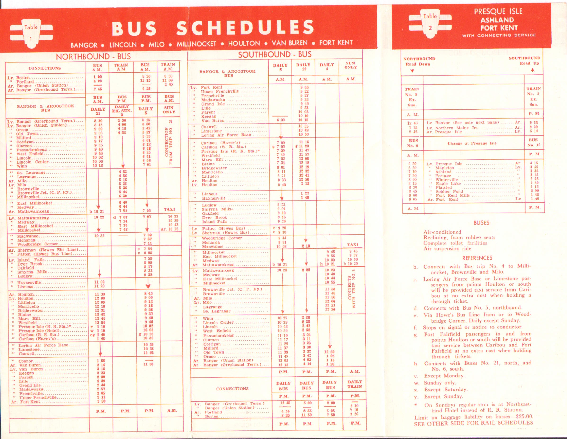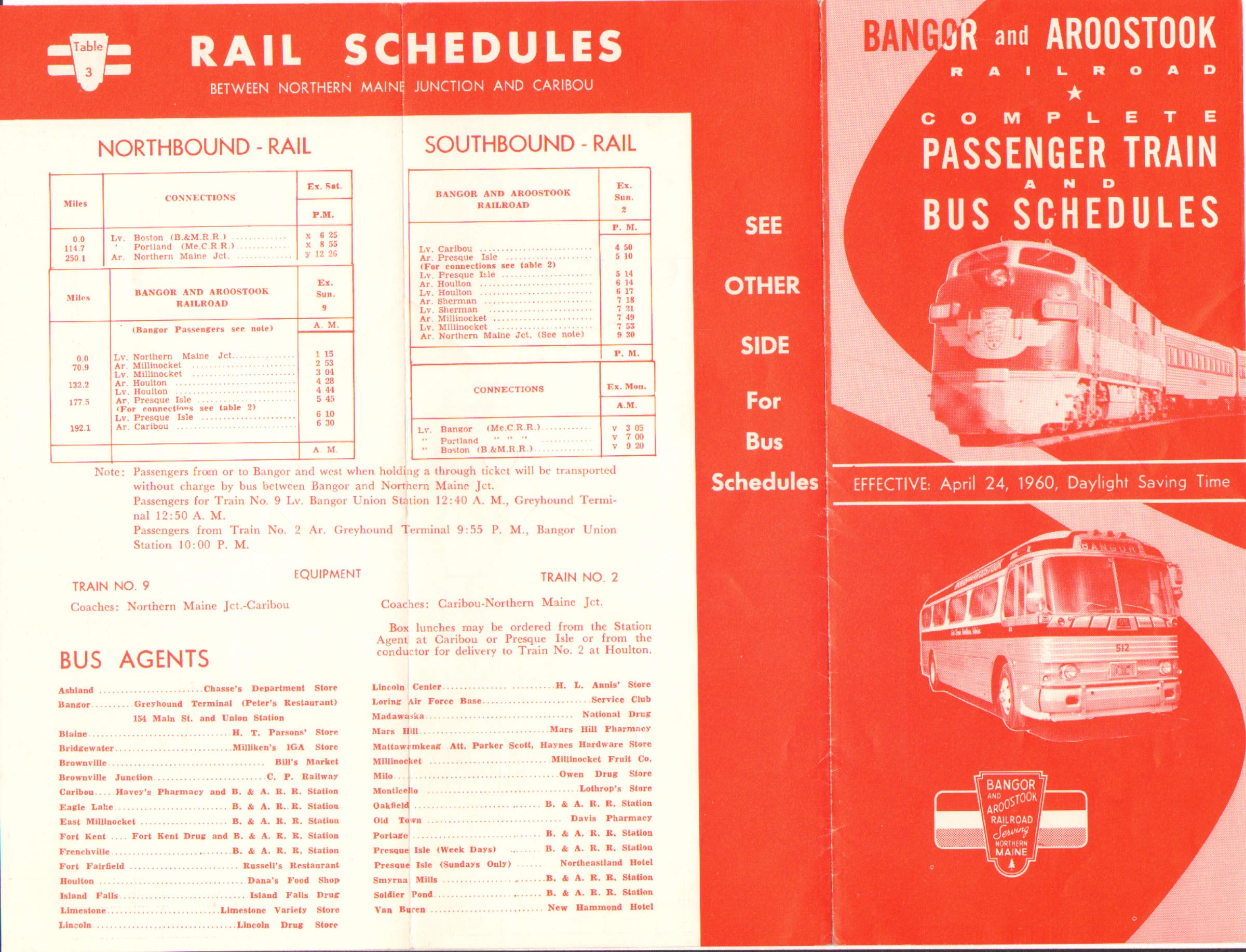 A red color scheme grabs the eye for this timetable. It would seem that some changes have been made in the last two months since the last 1960 timetable in this collection. A connection for Northbound service is now being listed - directly from the Maine Central at Northern Maine Junction. The only problem is - they will drop you there at 12:26 PM. The next train Northbound will leave at 1:15 AM. No idea what one would do at Northern Maine Junction in 1960 for nearly 11 hours. This is not a practical connection. Slightly better is the Southbound, where one will arrive at Northern Maine Junction at 9:30 PM, get a free bus ride to Bangor, arriving at Bangor Union Station at 10:00 PM and only have to pass five hours at the station before the 3:05 AM train leaves for Portland. Neither is what one would call a 'close connection'.