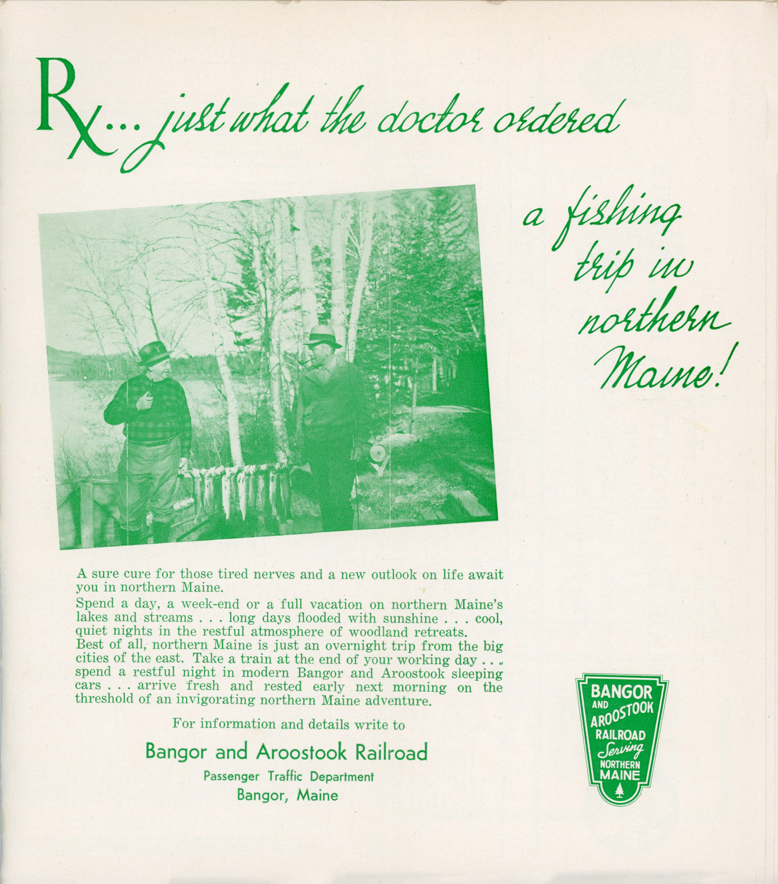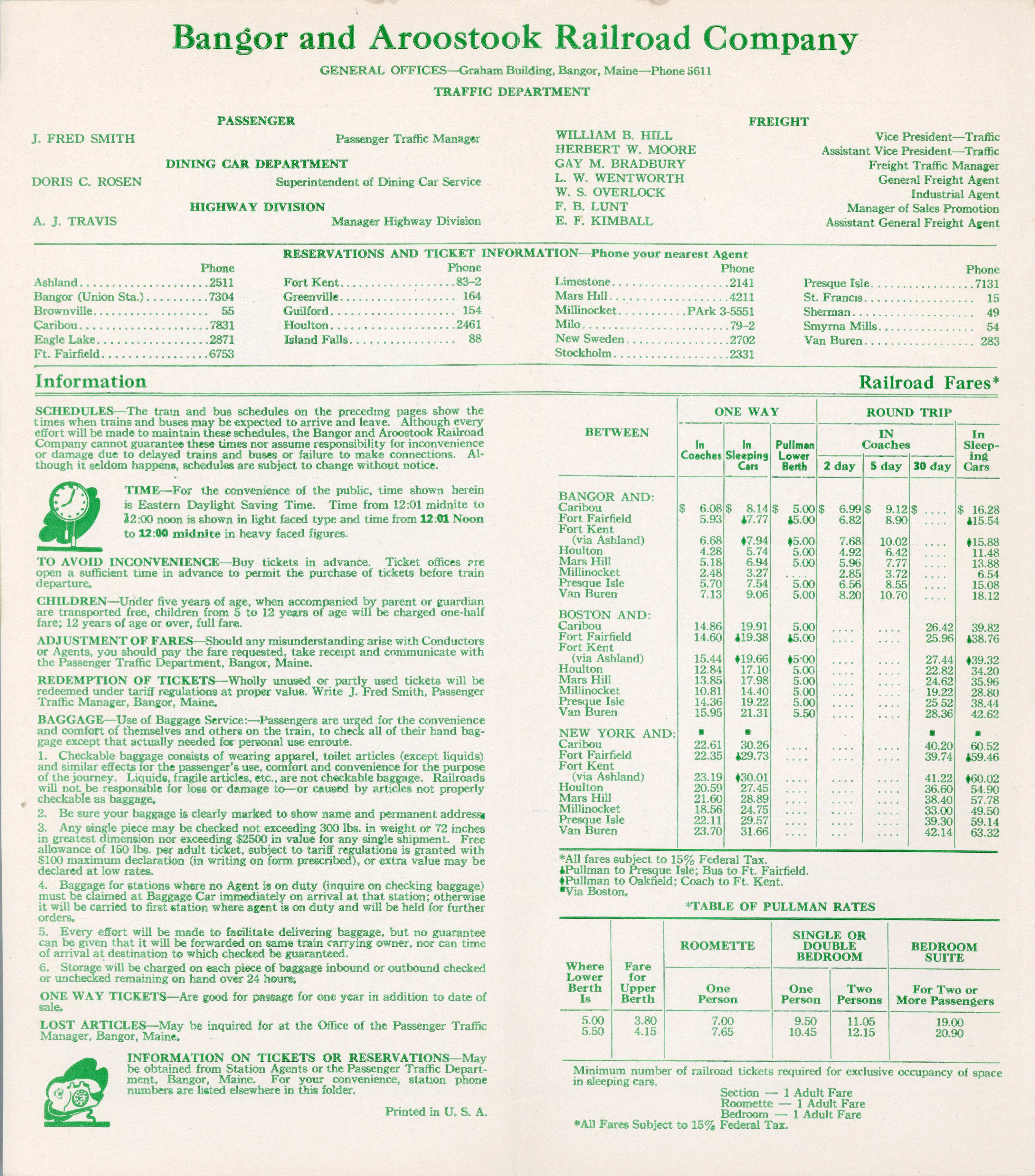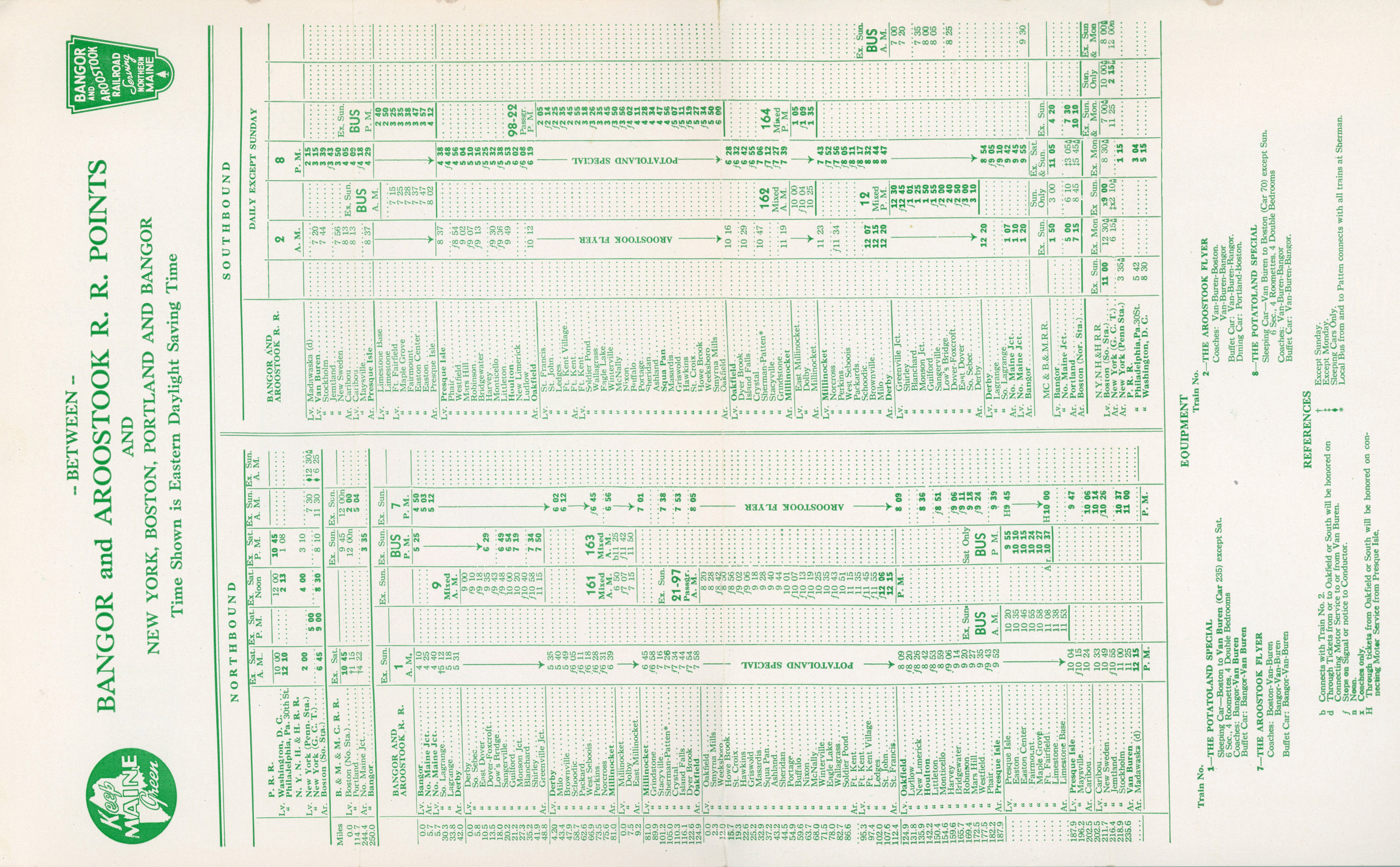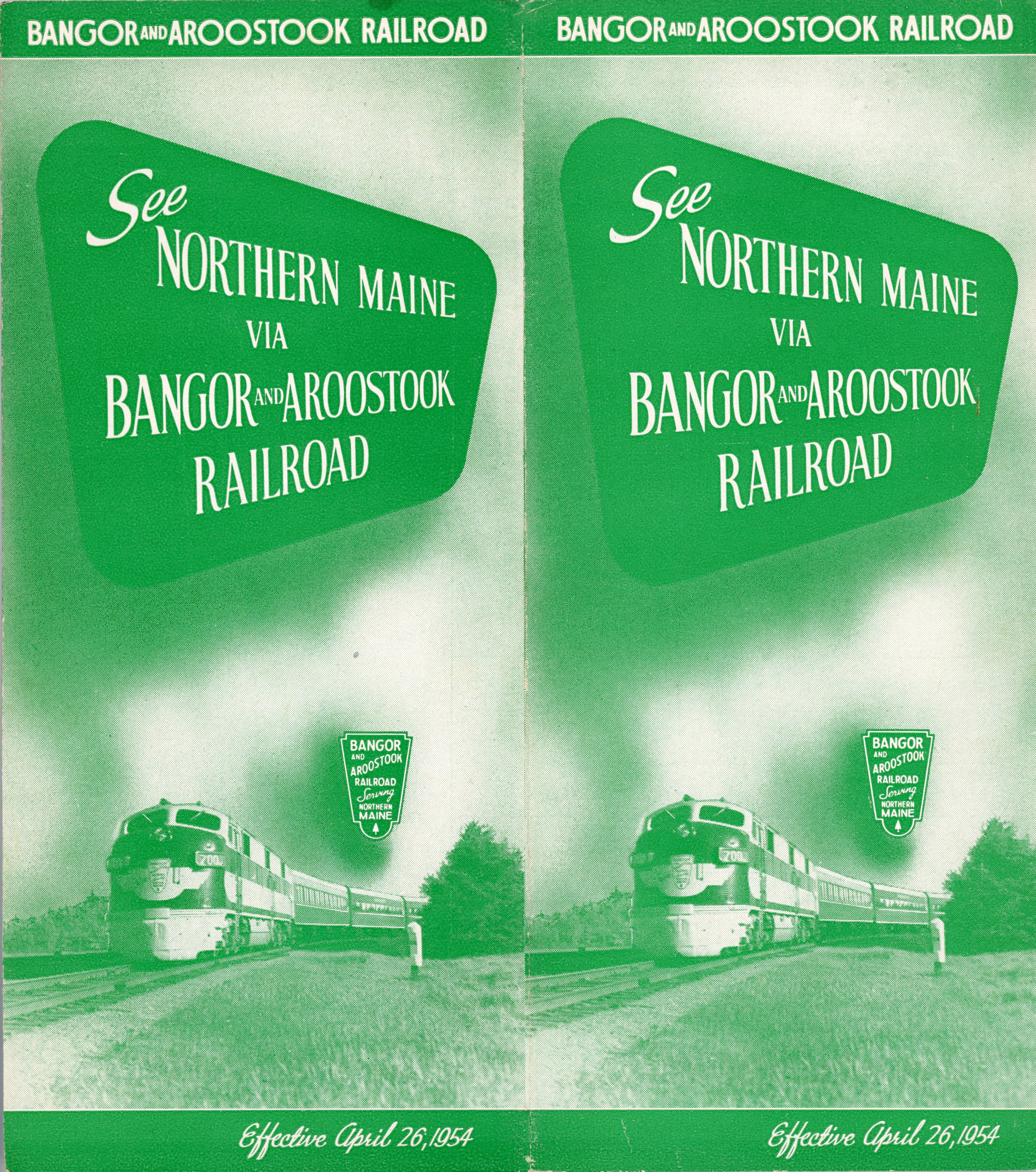 The first timetable from 1954 in this collection, green is certainly the theme. The inside double page advertisement is promoting fishing in Northern Maine. Fares are listed, the most expensive fare - a round trip sleeper from New York City to Van Buren was $63.32. That works out to $768.47 in January 2026 dollars. Although we know that the end of B&A passenger service was about 7 and a half years away, no sign of this in yet in the timetable. The Northbound Potatoland Special and Aroostook Flyer are both picking up passengers at Northern Maine Junction, but the Southbounds are running all the way to Bangor to exchange passengers.