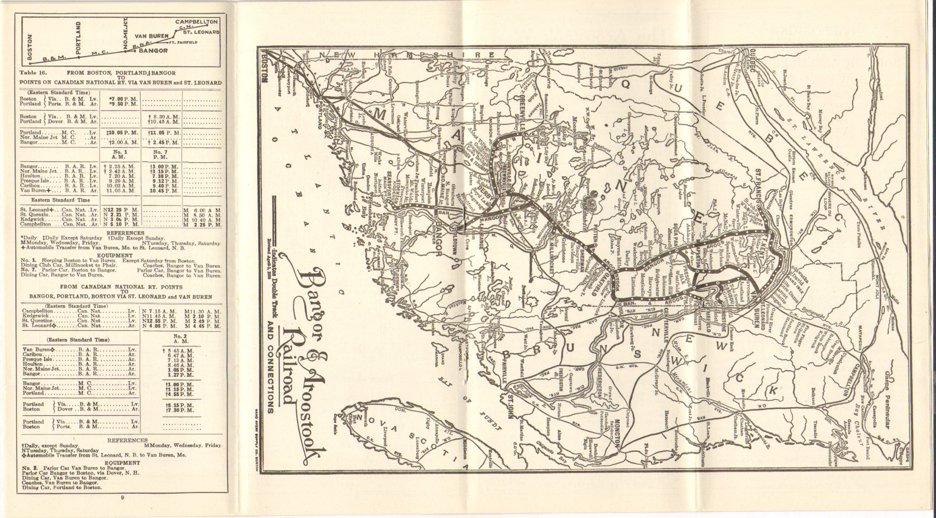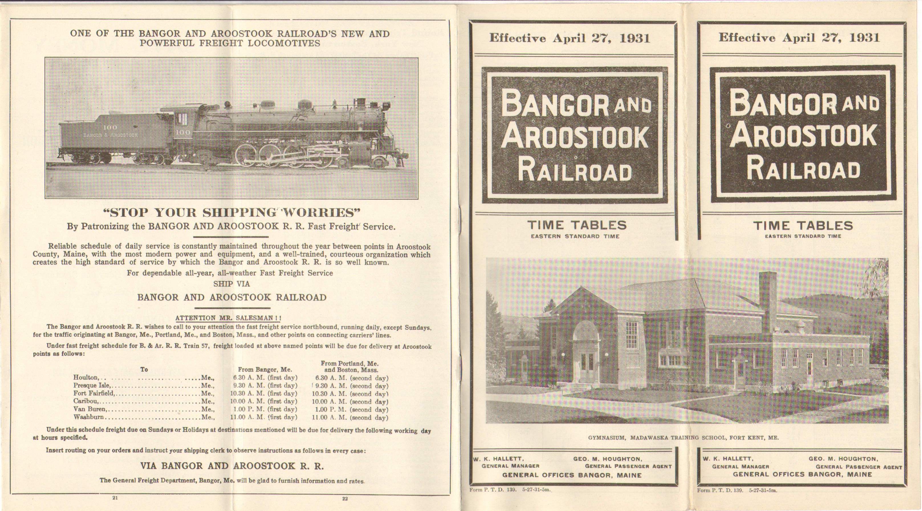The first timetable in this collection from 1931 follows the familiar format now in use for several editions. The photo on the covers is of the 'Gymnasium, Madawaska Training School, Fort Kent, ME'. Today we know this school as the University of Maine at Fort Kent, a name adopted in 1970. The now familiar Fast Freight advertisement featuring locomotive 100 continues to grace the inside double page.