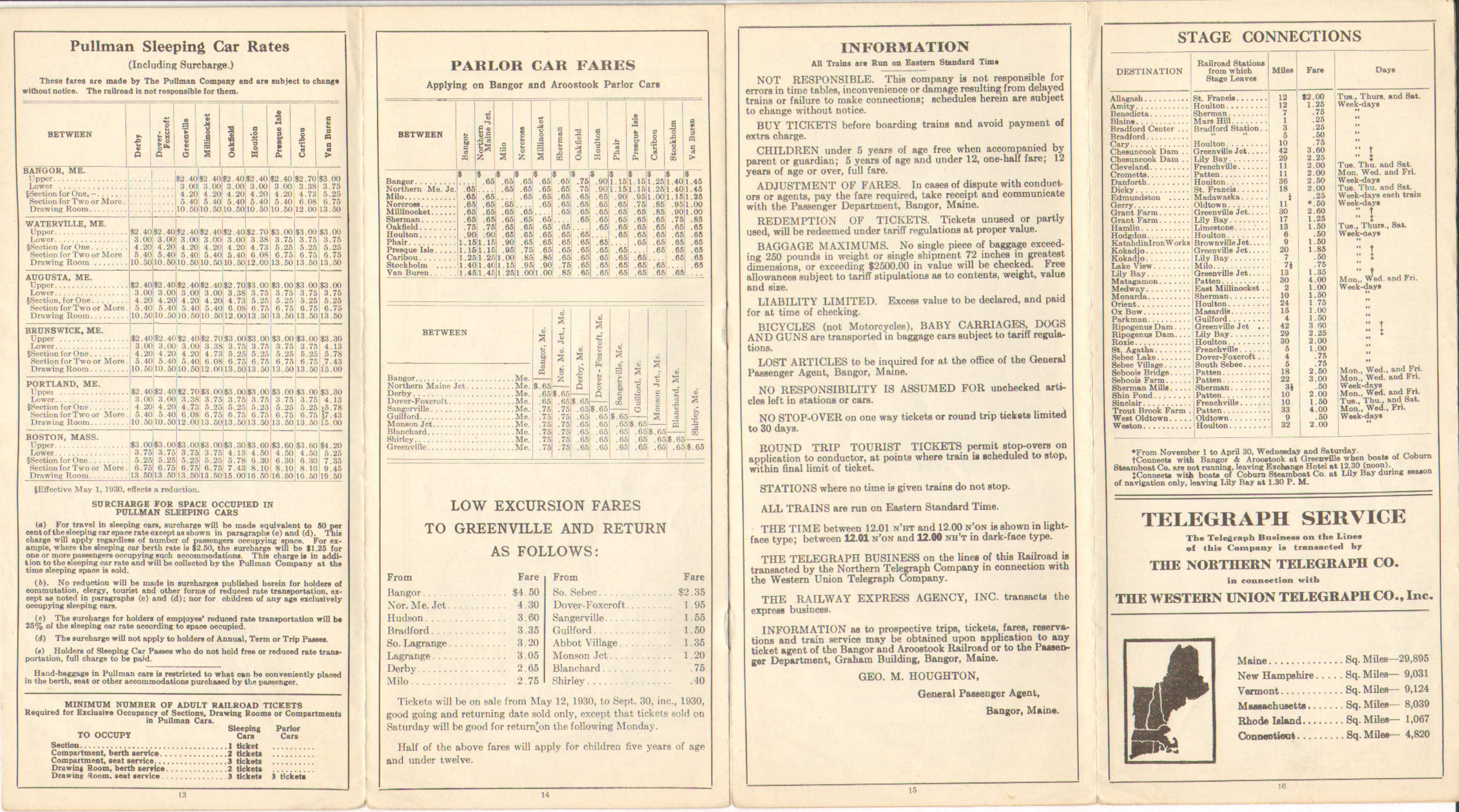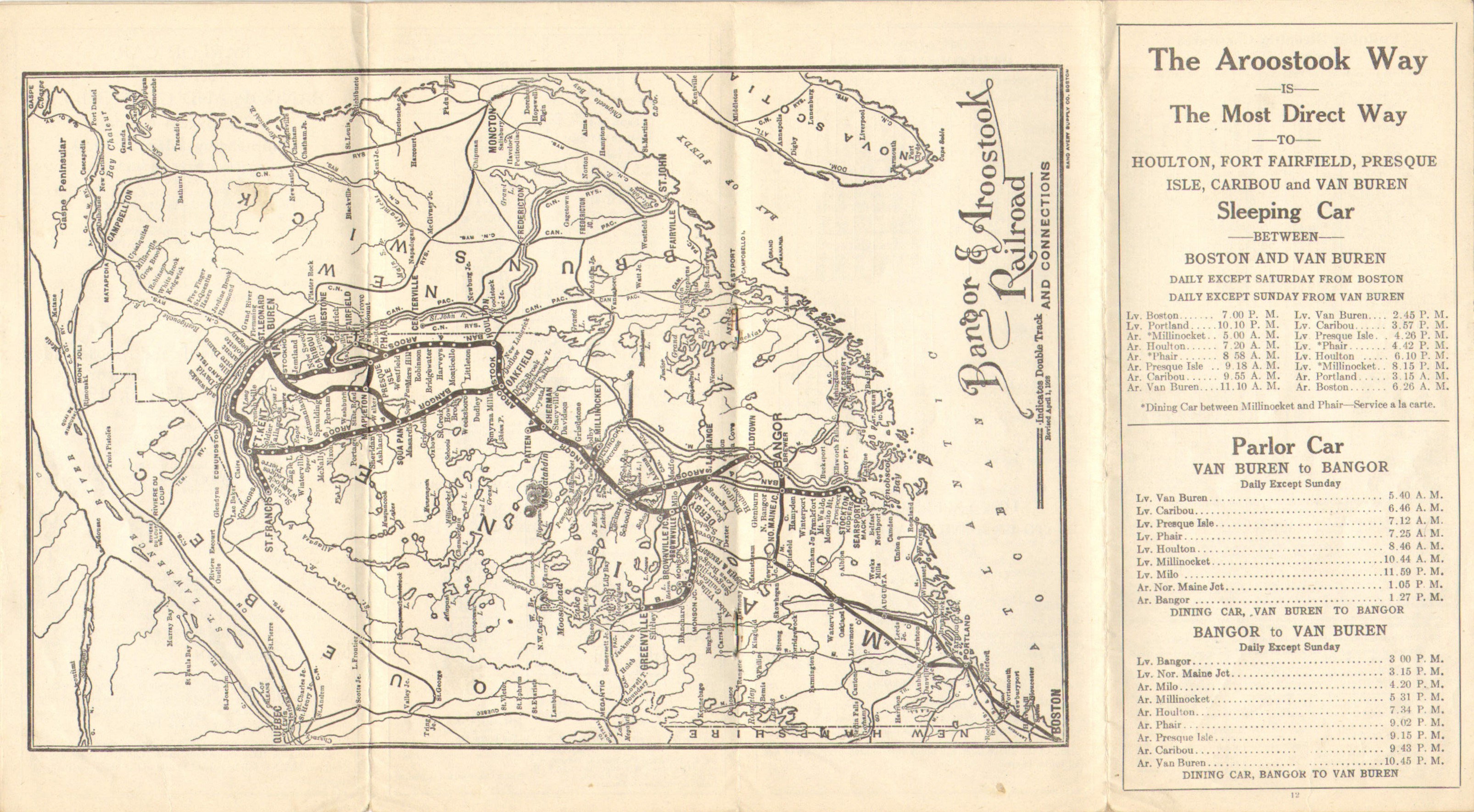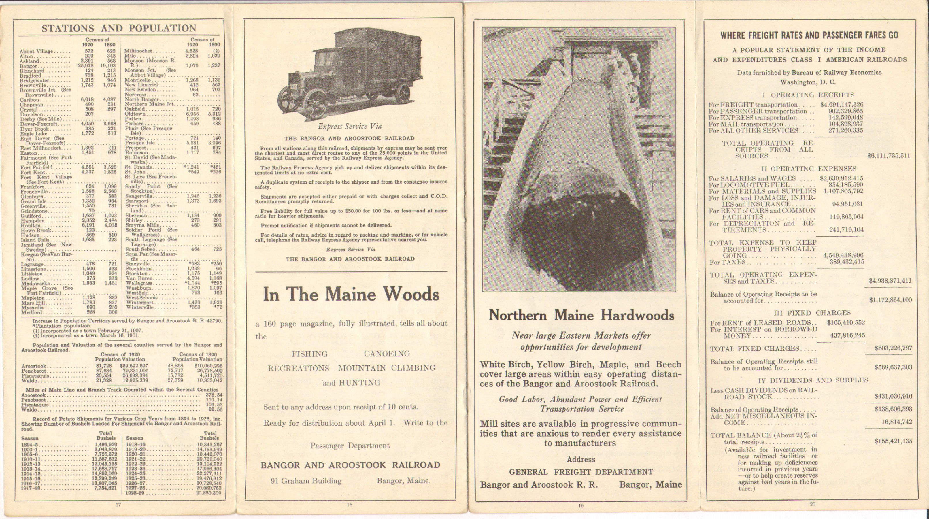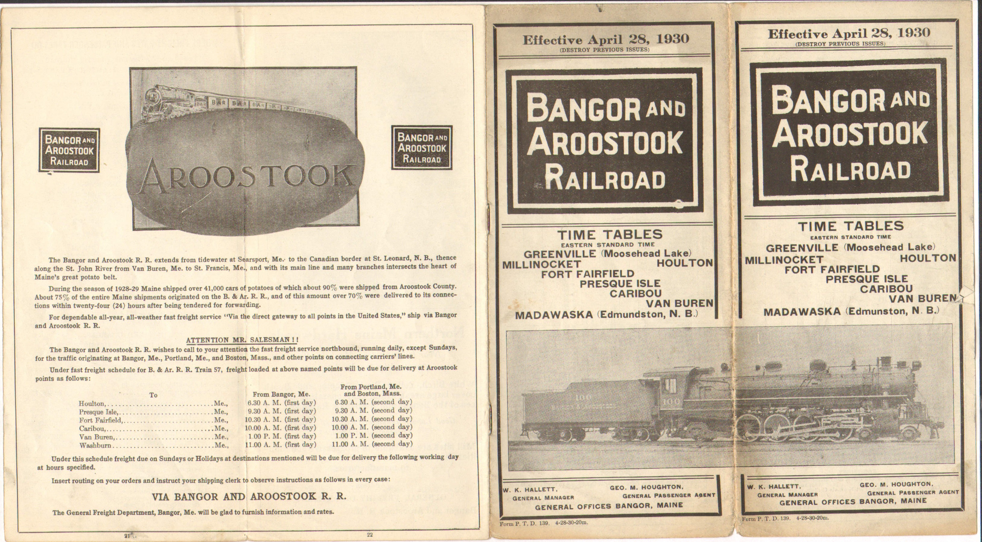 With the same format as the last several timetables, this one brings a builders photo of #100 on the covers. Built in November of 1929 along with three others, representing the latest in steam power. Eventually there would be a total of 10 of those 4-8-2s, all from Alco. Potatoes are still the subject of the inside double page, Sleeping Car and Parlor Car service is being promoted as the way to travel along with the Pullman cars. In the Maine Woods is still available for 10 cents and the railroad is advertising Hardwoods out of Northern Maine. Page 20 is now devoted to an understanding of the finances behind railroading.