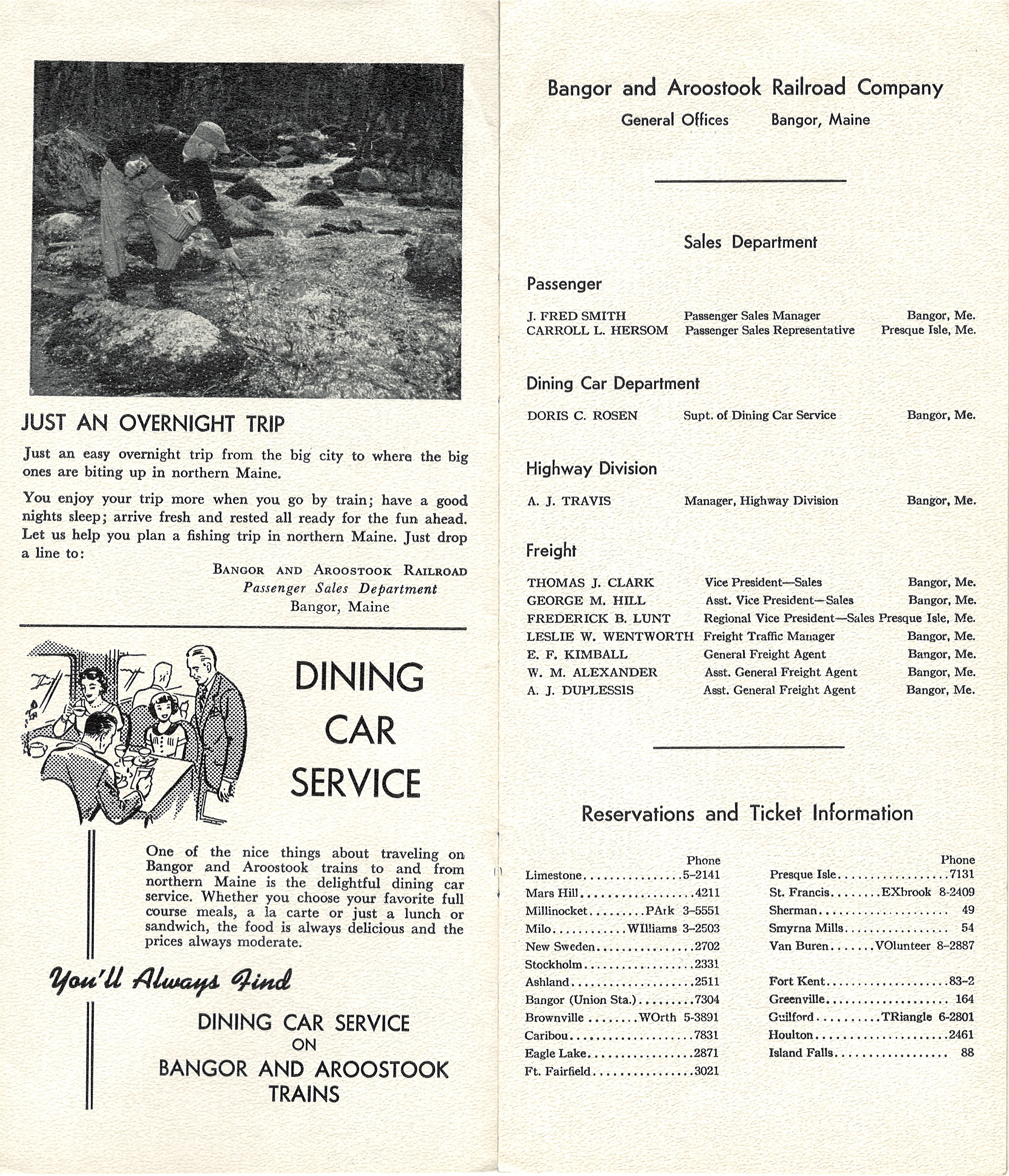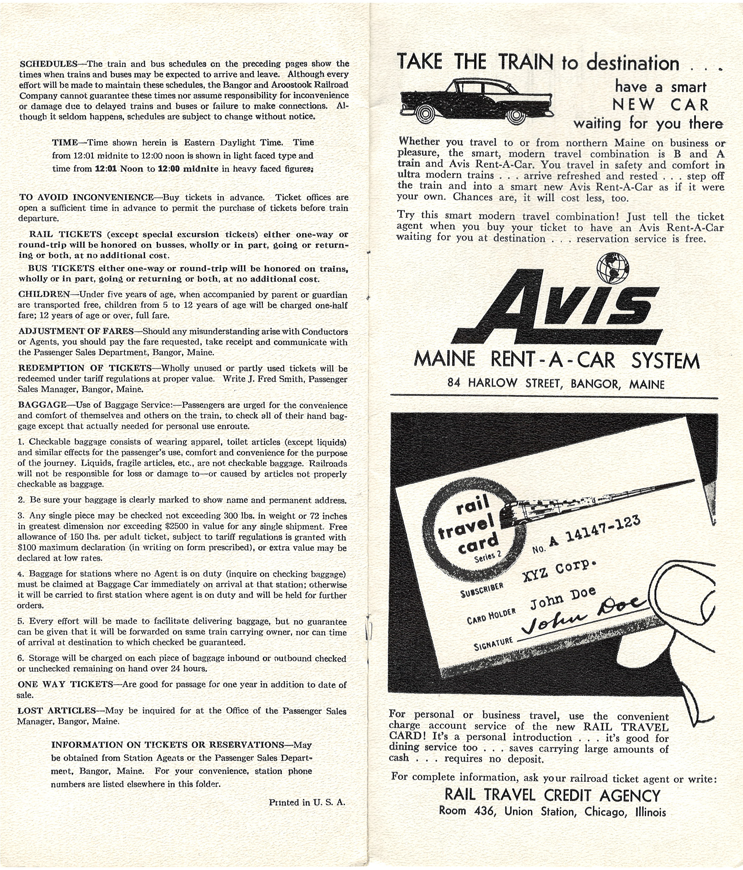 Currently (February 2026) this collection is missing any timetables from 1956. Therefore we cannot conclusively say when this format, a radically different look from the 1955 timetable went into effect. We can say that the look changed again in October 1958. Unlike most of the timetables in this collection, this one is stapled - creating a two page experience all the way through, with no large fold out. The blue and black cover is striking. On the inside we find that overnight trips to Northern Maine are being pushed (a very old theme for these timetables, but a good one) Dining car service will always be found on B&A trains. Sadly, that would prove not to be true.