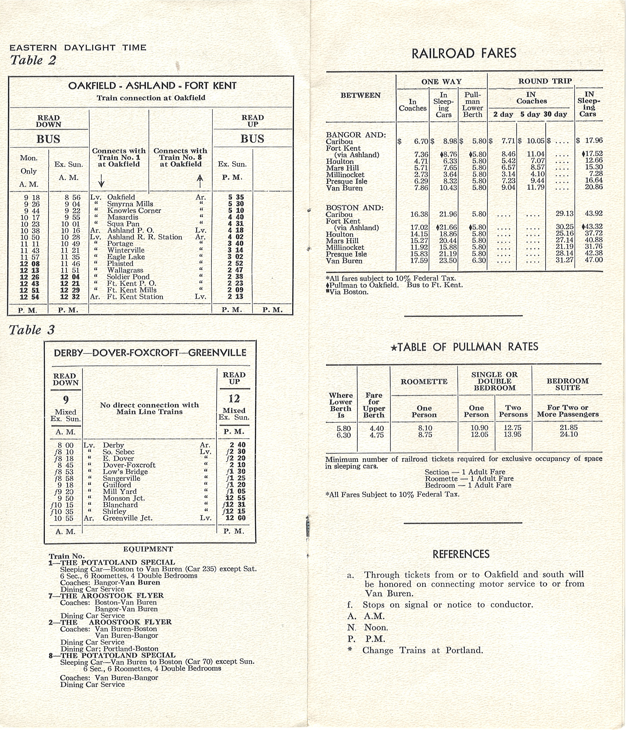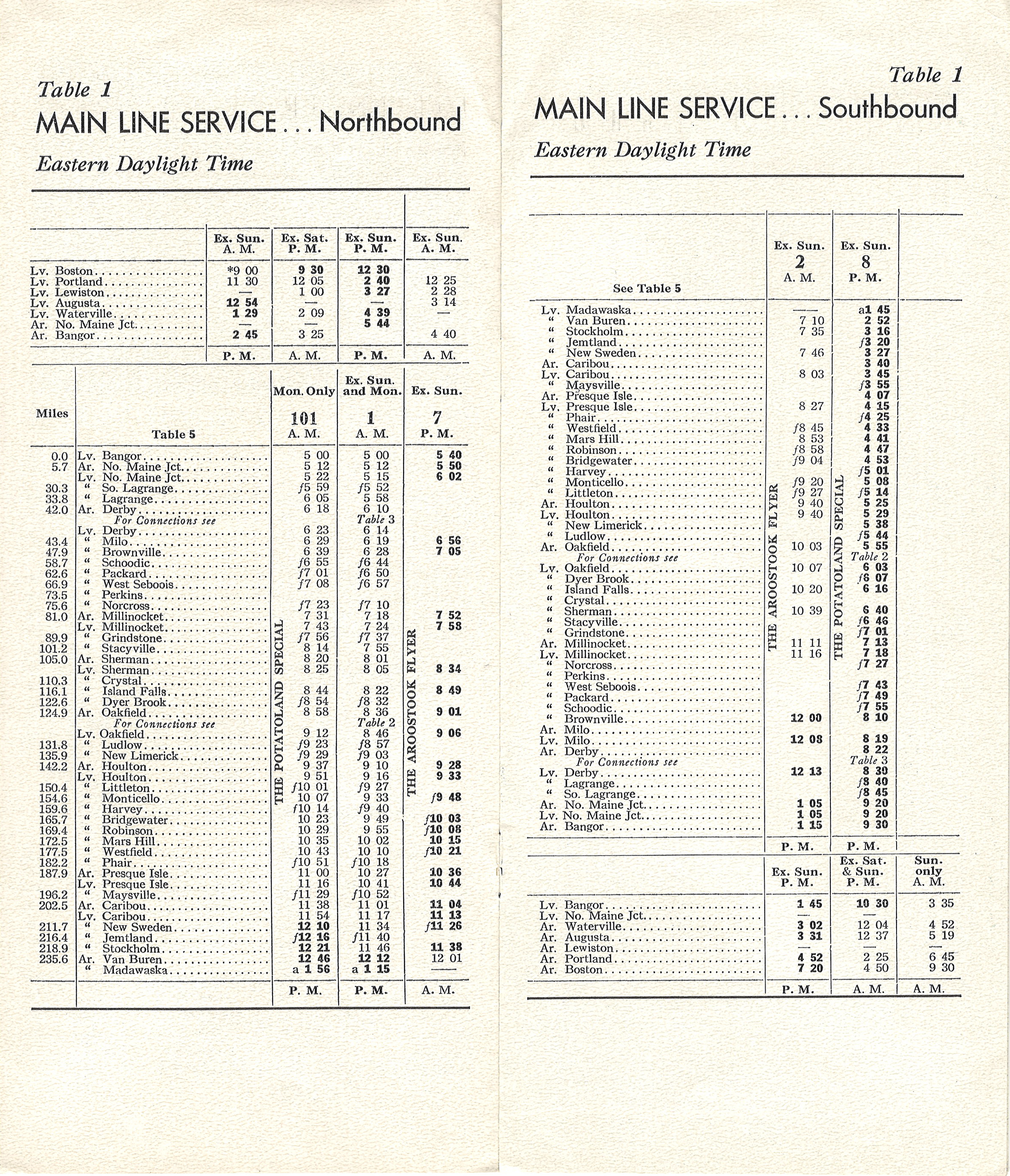 In terms of schedules, the daily-except-Sunday two trains per day, the Potatoland Special and The Aroostook Flyer schedule is now well established. There is a different schedule for the Northbound Potatoland on Mondays, although the reason for this is not clear. The long established trains #9 and #12, the mixed trains between Derby and Greenville remain intact. Even in what is supposed to be a rail-only timetable the bus between Oakfield and Fort Kent (via Ashland) is listed as there are no trains going that way.