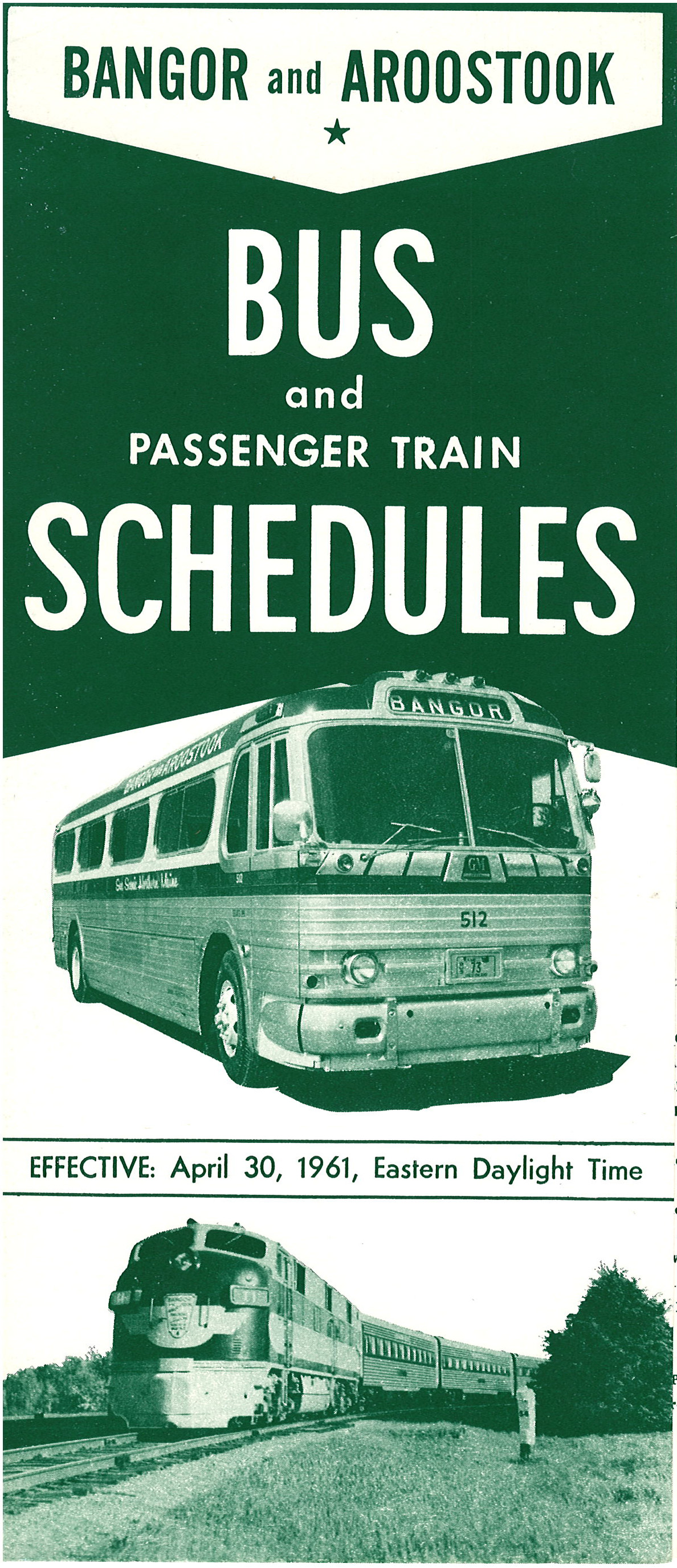 Six months before this timetable was released (See the October 1960 timetable elsewhere on this site) the title flipped. Instead of being Train and Bus - it became Bus and train. The emphasis is not lost on us as this is believed to be the last timetable the Bangor and Aroostook released showing passenger trains. The timetables for several years had been operating on a Spring / Fall pattern for releases. Since the last passenger train was run on September 4, 1961 and the October 29 1961 timetable is bus only, here we have it. The end of an era: The last B&A timetable showing a passenger train.