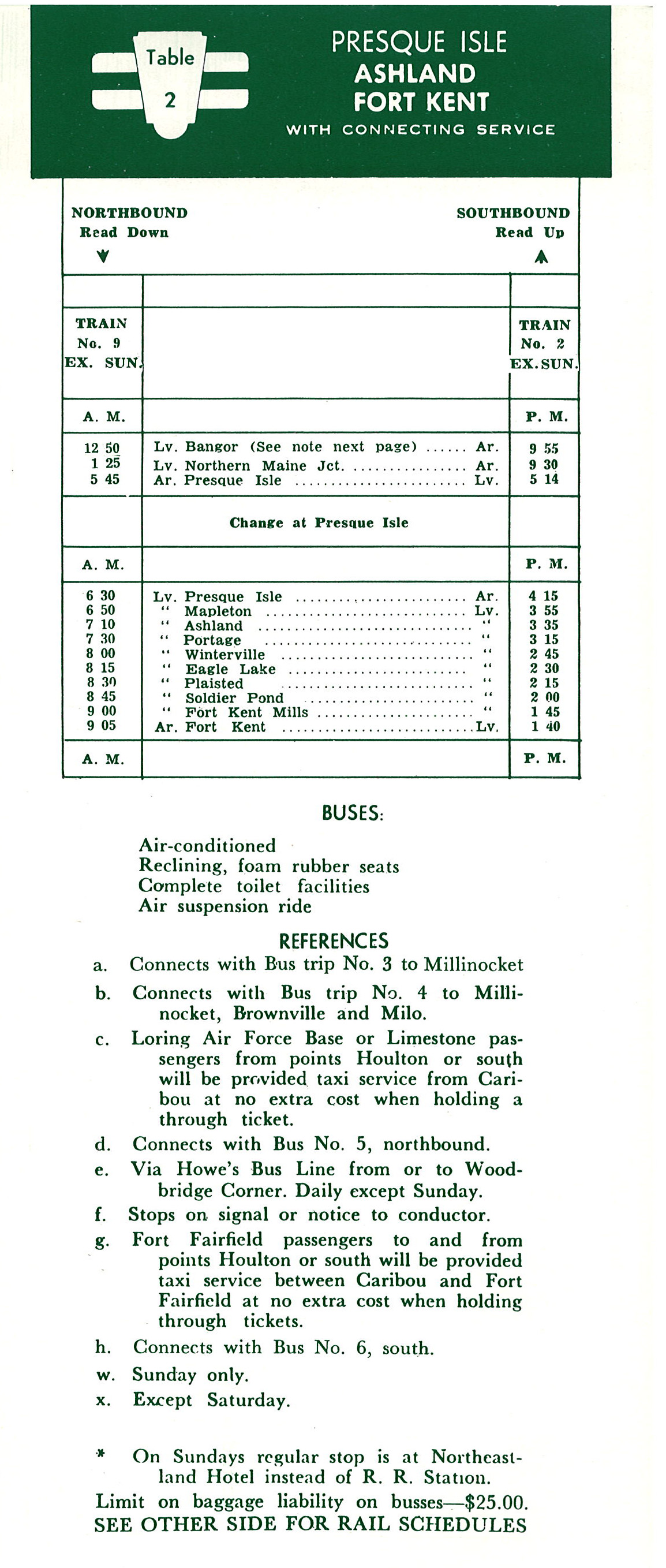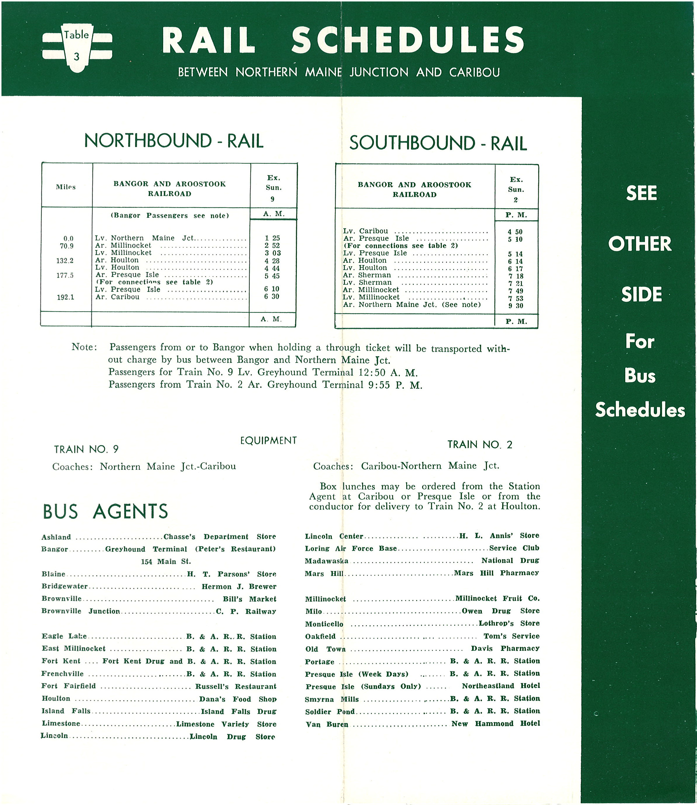 The rail schedule is relegated to the back page - literally the last thing someone sees. The schedule shows one round trip per day - with box lunches available only on the Southbound return trip. Even the rail page has buses on it - the way to get from Northern Maine Junction to the Bangor bus depot - was via bus. Further that page also contains a list of bus agencies - just showing how far the train has fallen.