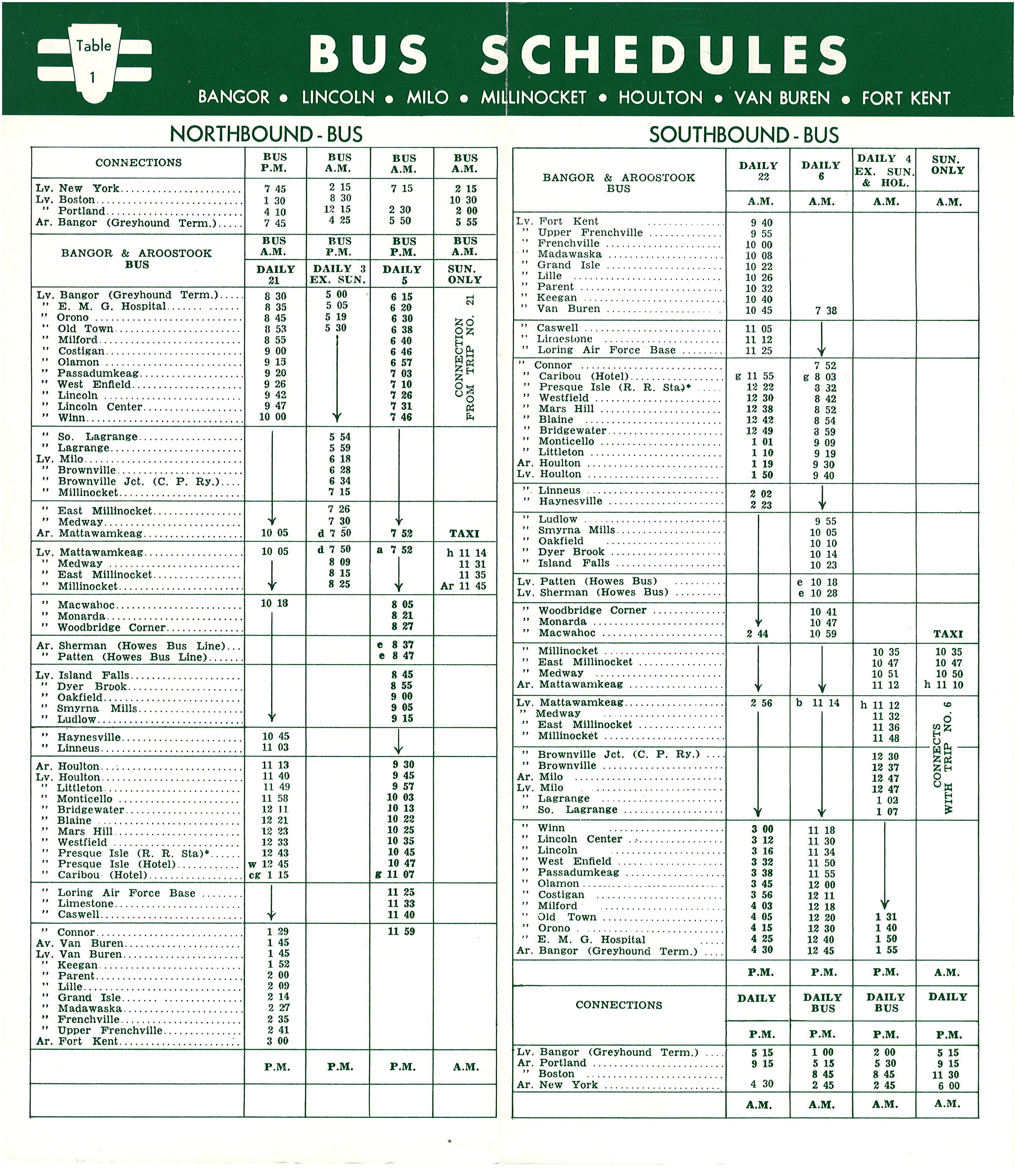 Opening it up - we have the large two page bus schedule - showing two daily and one daily-except-Sunday bus trips offered. The third column on the inside page (table #2) shows the Presque Isle to Fort Kent bus service, working off the passenger trains to Presque Isle and offering daily-except-Sunday service.