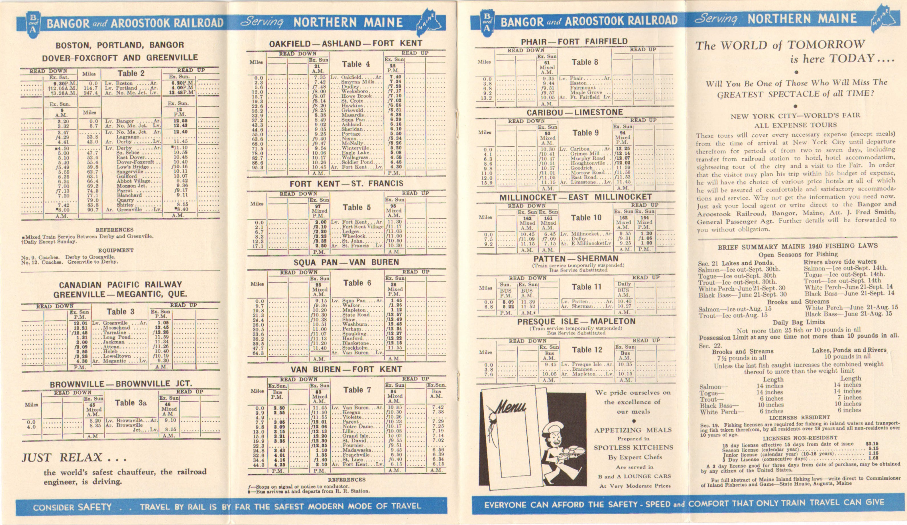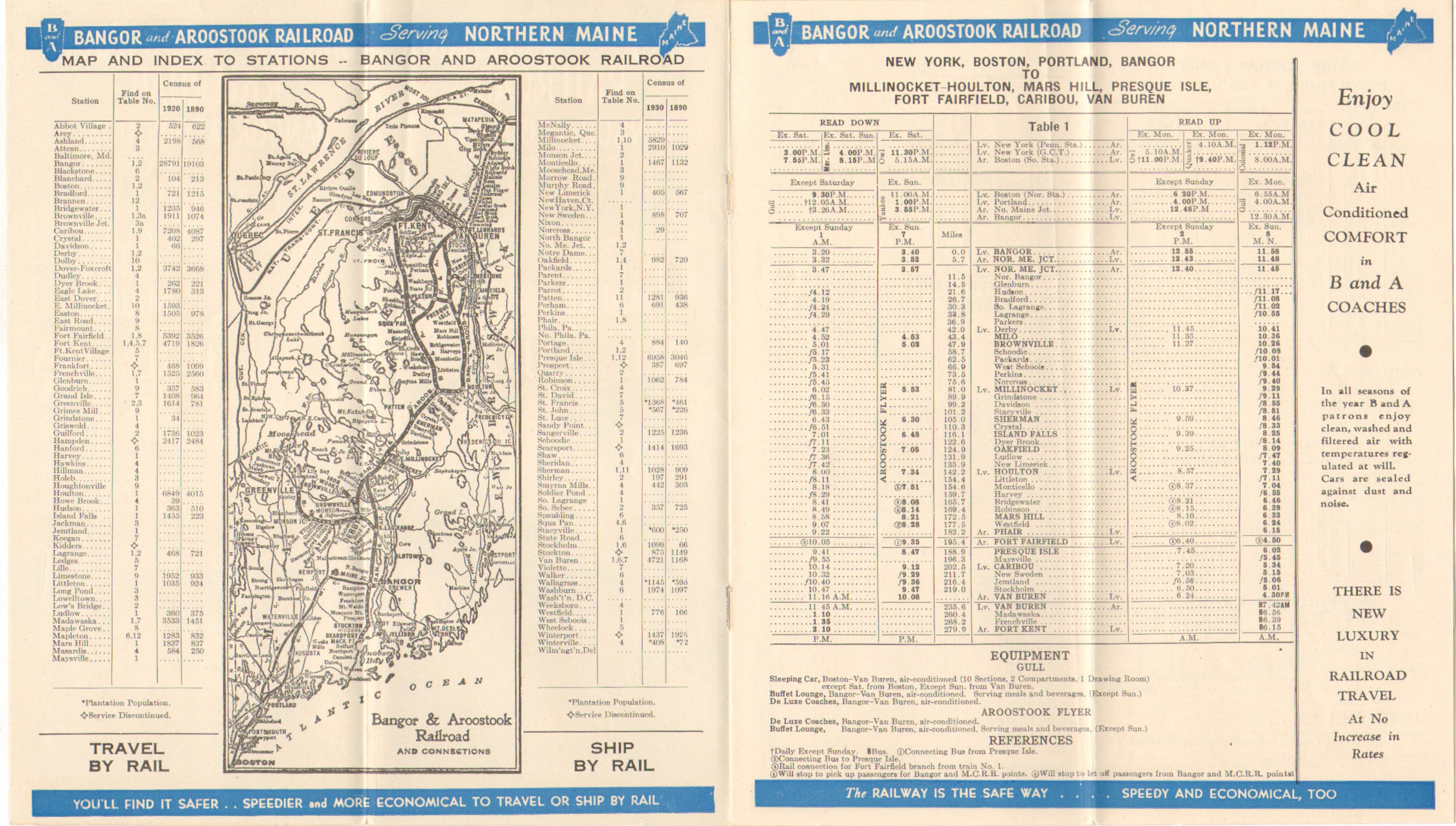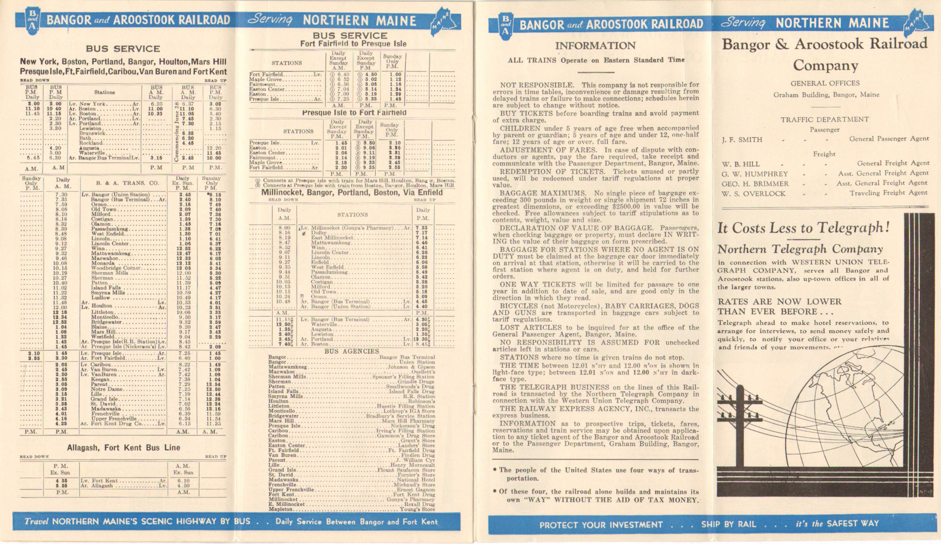 With only one noticeable change from the previous, this is a near clone of the previous timetable from June 1940. The large change comes in the bus section, where the service from Millinocket to Bangor is now only listed as going via Enfield. Previously, both routings were listed as the new one had not taken effect.