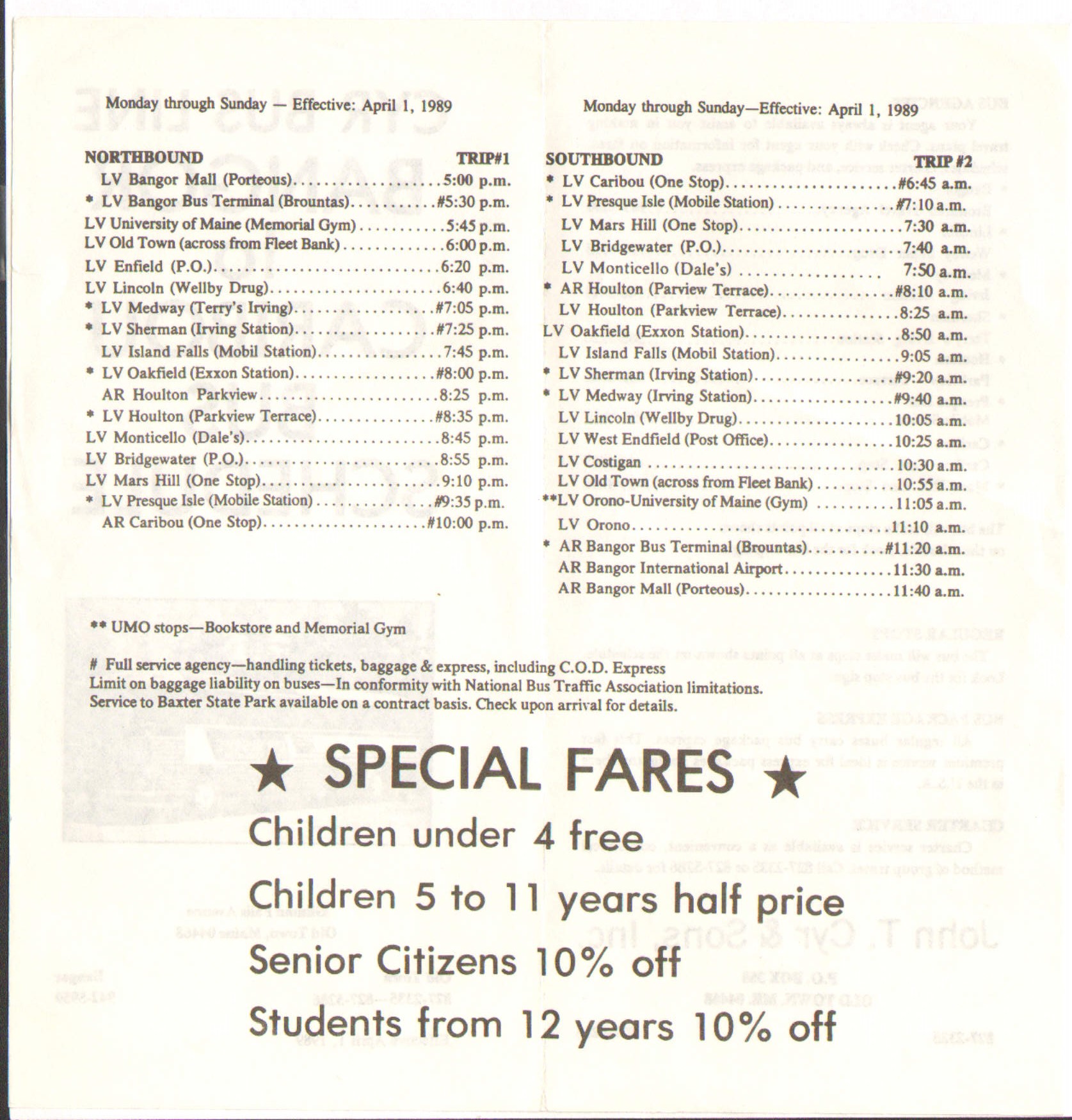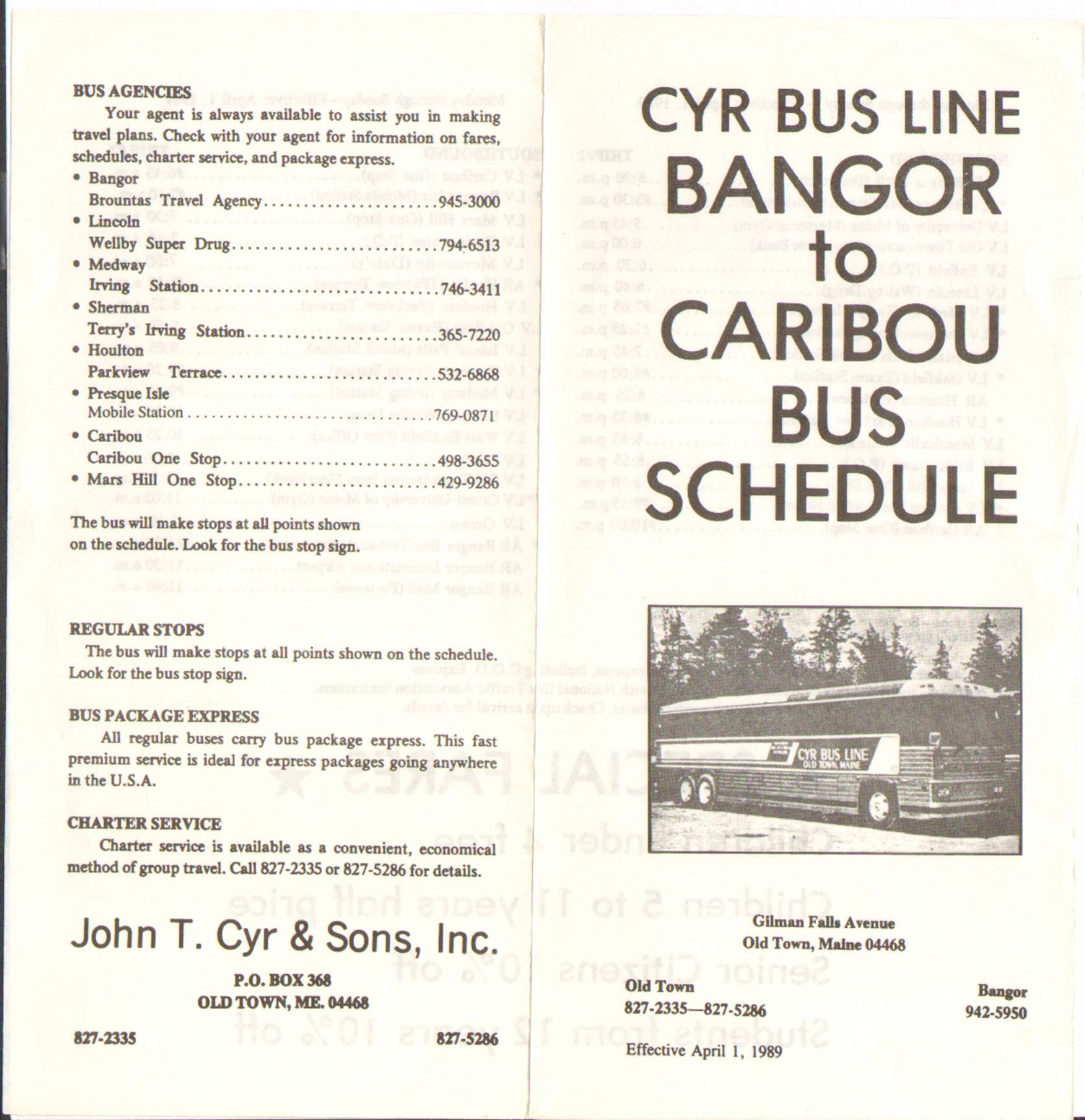 Technically, this is not a Bangor and Aroostook timetable. Bus service was discontinued on January 21st, 1984. Cyr Bus Line stepped into the gap that the B&A left and this is their timetable. With changes mostly on the Bangor end, such as adding stops at the Airport and Bangor Mall, the Northern end reads very much like a Bangor and Aroostook bus timetable.