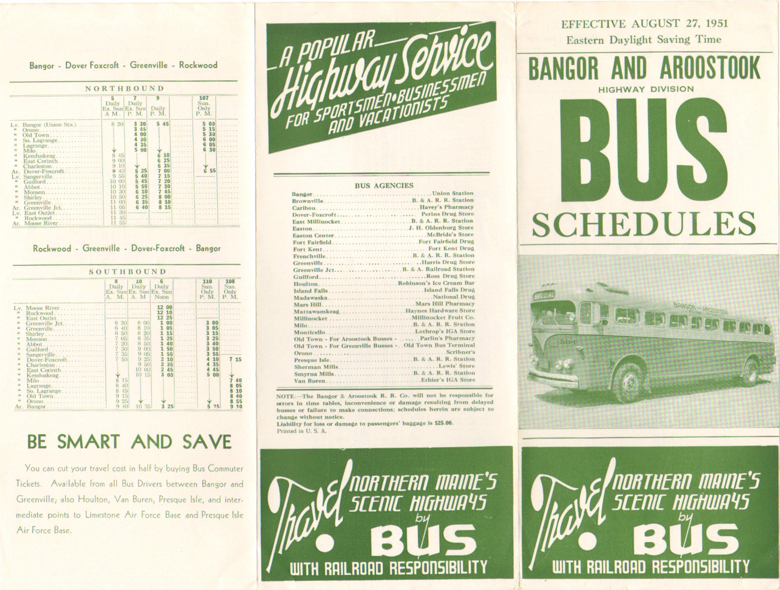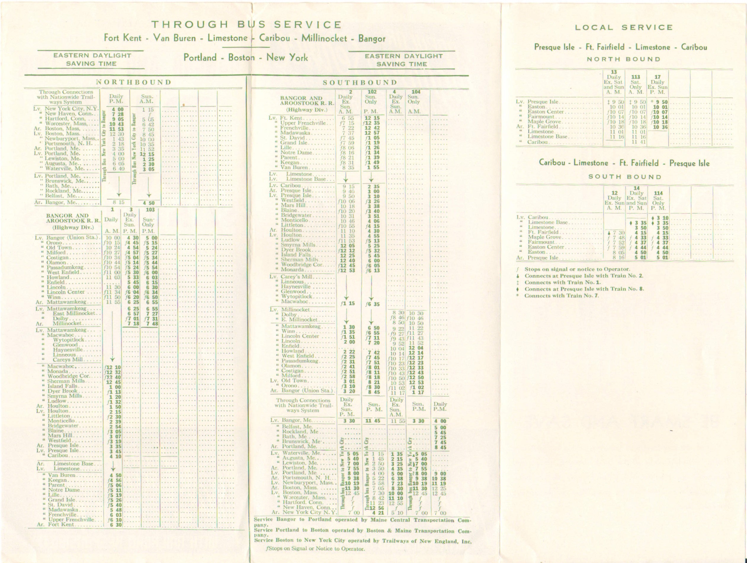 The bus service is continuing to improve and change - now we have service as far as Moose River, extending the coverage far beyond what the railroad ever had with its passenger trains. Buses are now running seven days a week (although the times change on Sundays) all the way from Bangor to Moose River and return. Connections and through bus service from New York City all the way to Bangor is offered with connections all the way to Fort Kent possible. Local service is still running six days a week between Caribou and Presque Isle, but Limestone and Fort Fairfield are included in this service.