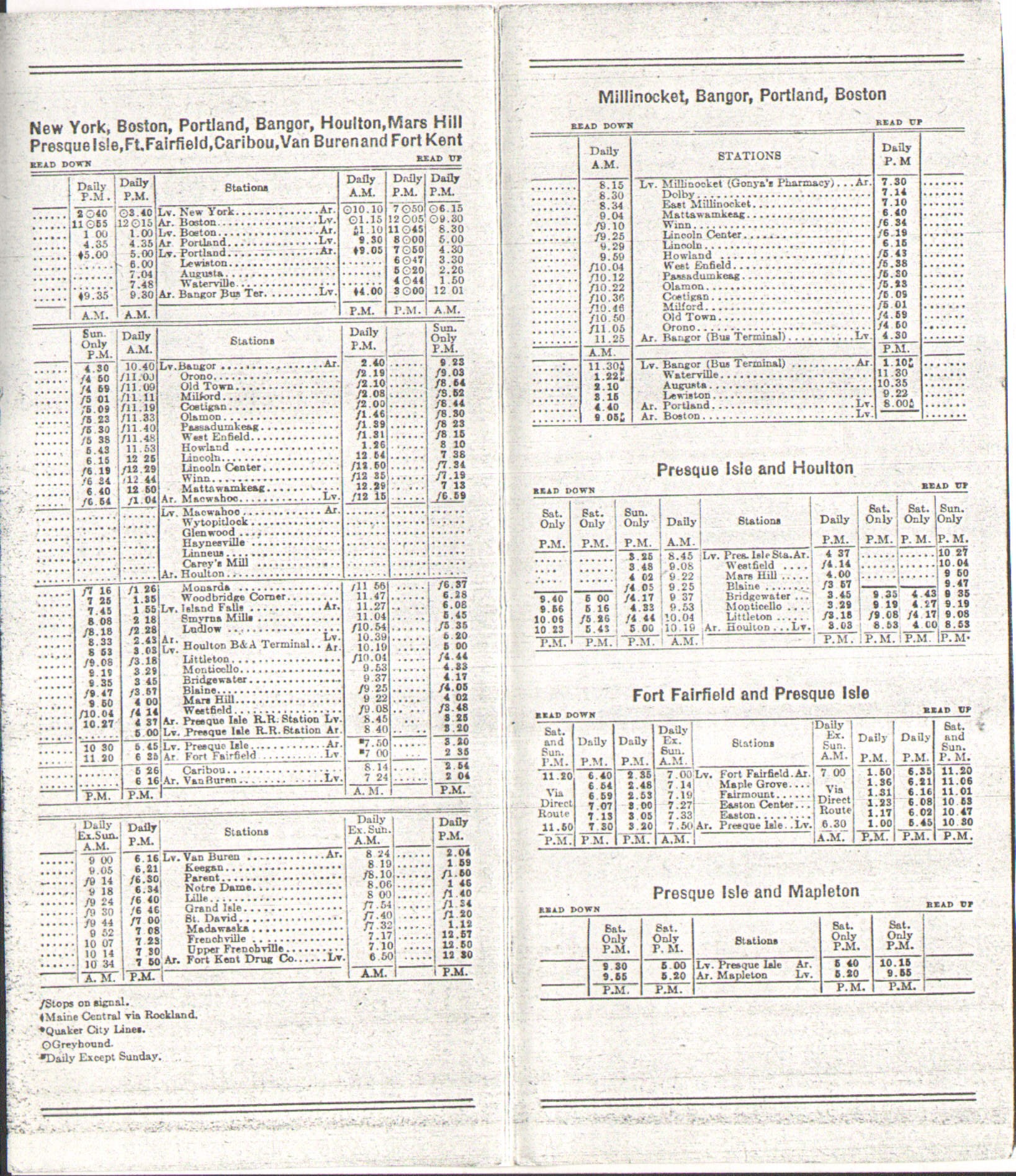 This appears to be a photocopy of an original, so no comments about the color will be made. One can see that the railroad's bus division is playing to a public which is used to the railroads, even using the term 'railroad responsibility' when referring to the quality of the bus service. Interestingly, although the buses had been covering the passenger service between Sherman and Patten literally for years at this point, no mention of that service is included in the bus timetable. It remains in the Rail section of the joint rail and bus timetables as well. The through service will take you as far as Fort Kent, but the local service in the county seems to be based out of Presque Isle - Mapleton, Houlton and Fort Fairfield are all reached via Presque Isle. Millinocket however gets daily service right out of Bangor.