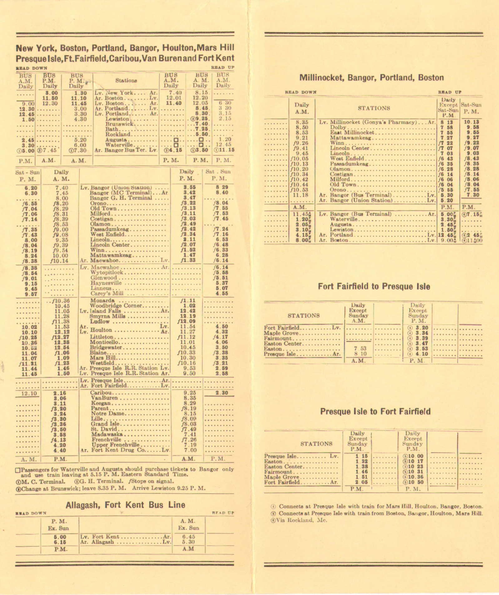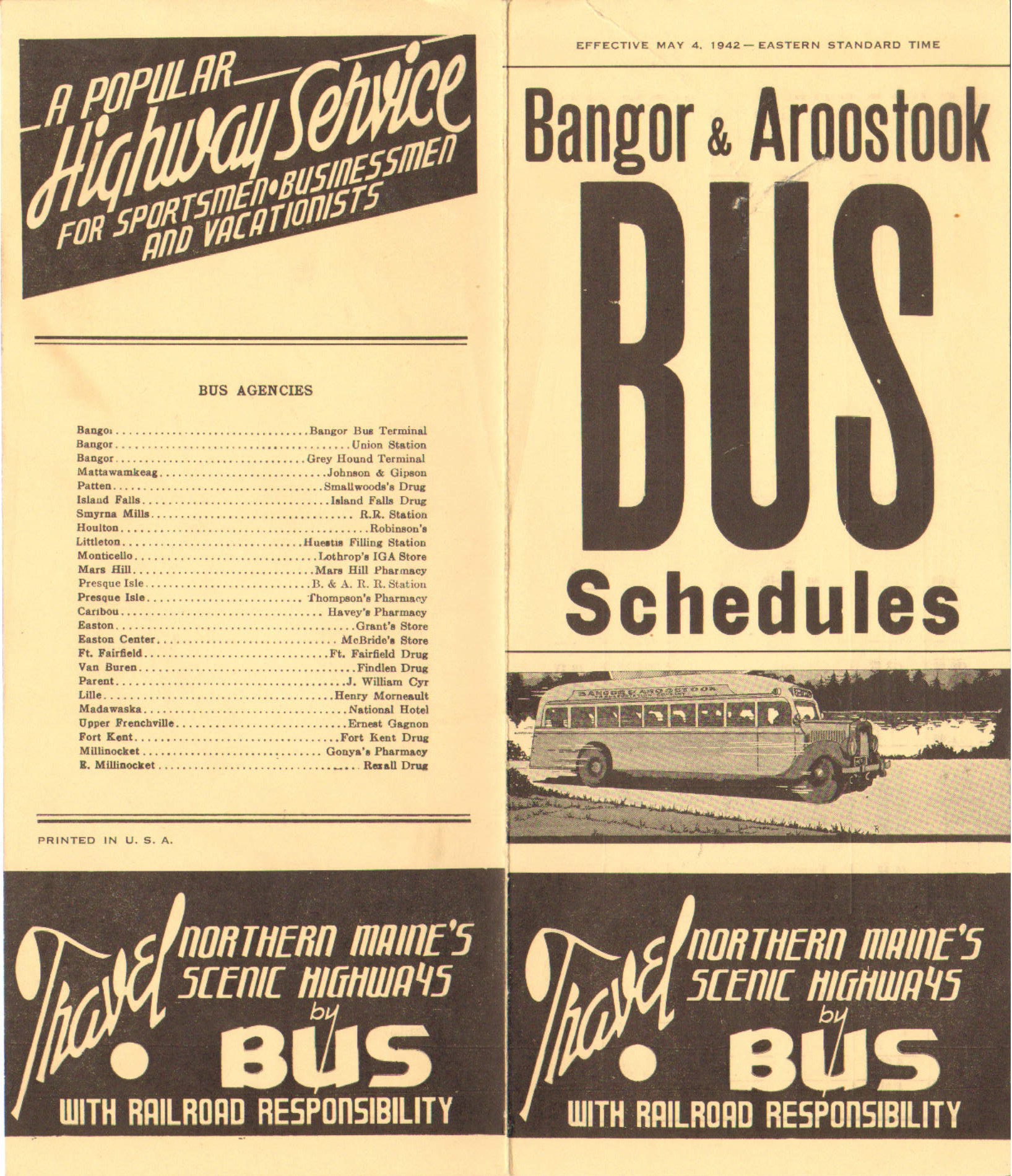 Another standalone bus timetable, this one is quite different from the last one in this collection. A return to a more simple look, the information appears identical to that in the railroad timetable of the same date. Oddly enough, the Patten and Sherman service in the railroad timetable is not mentioned in the bus only timetable at all.