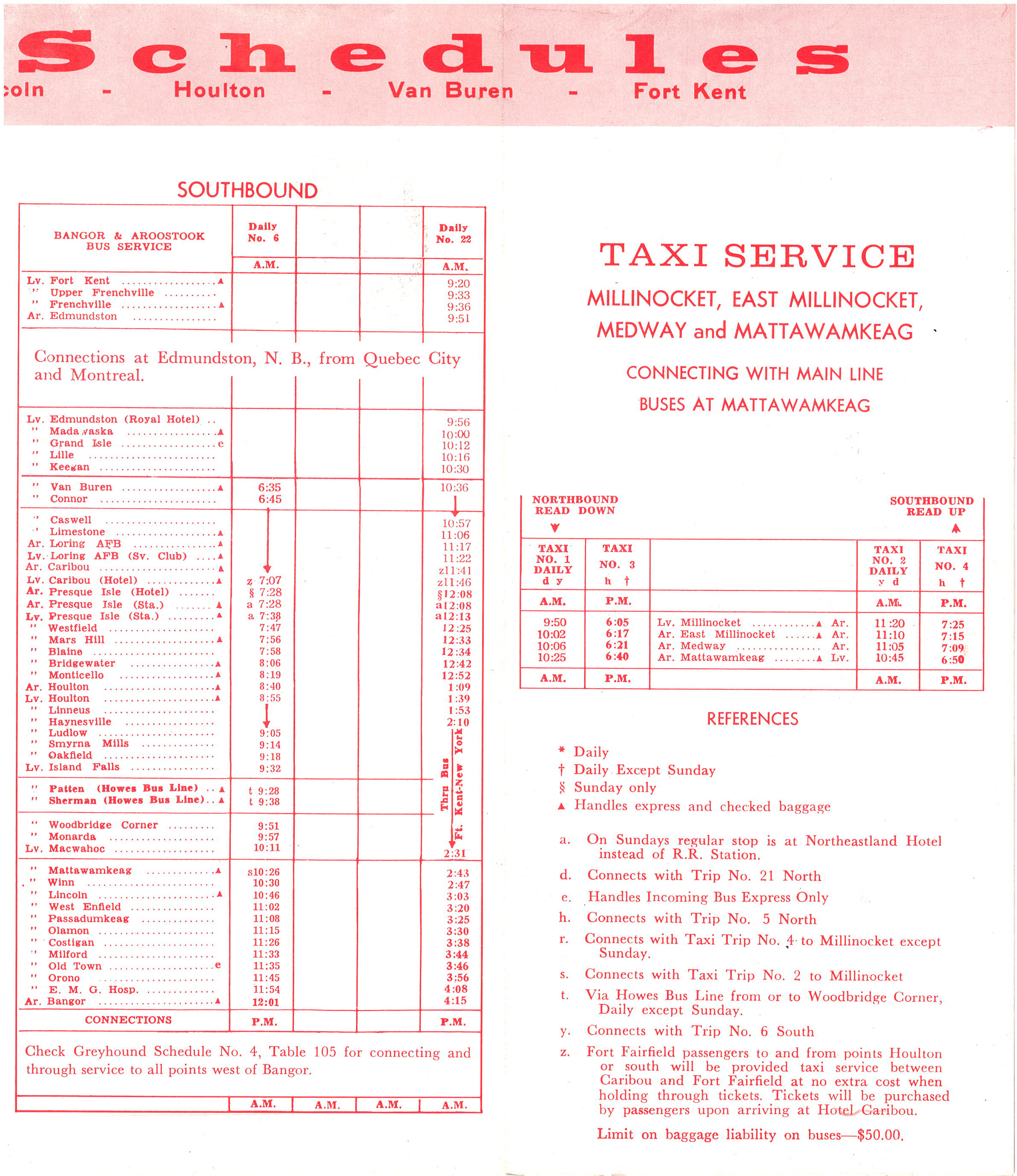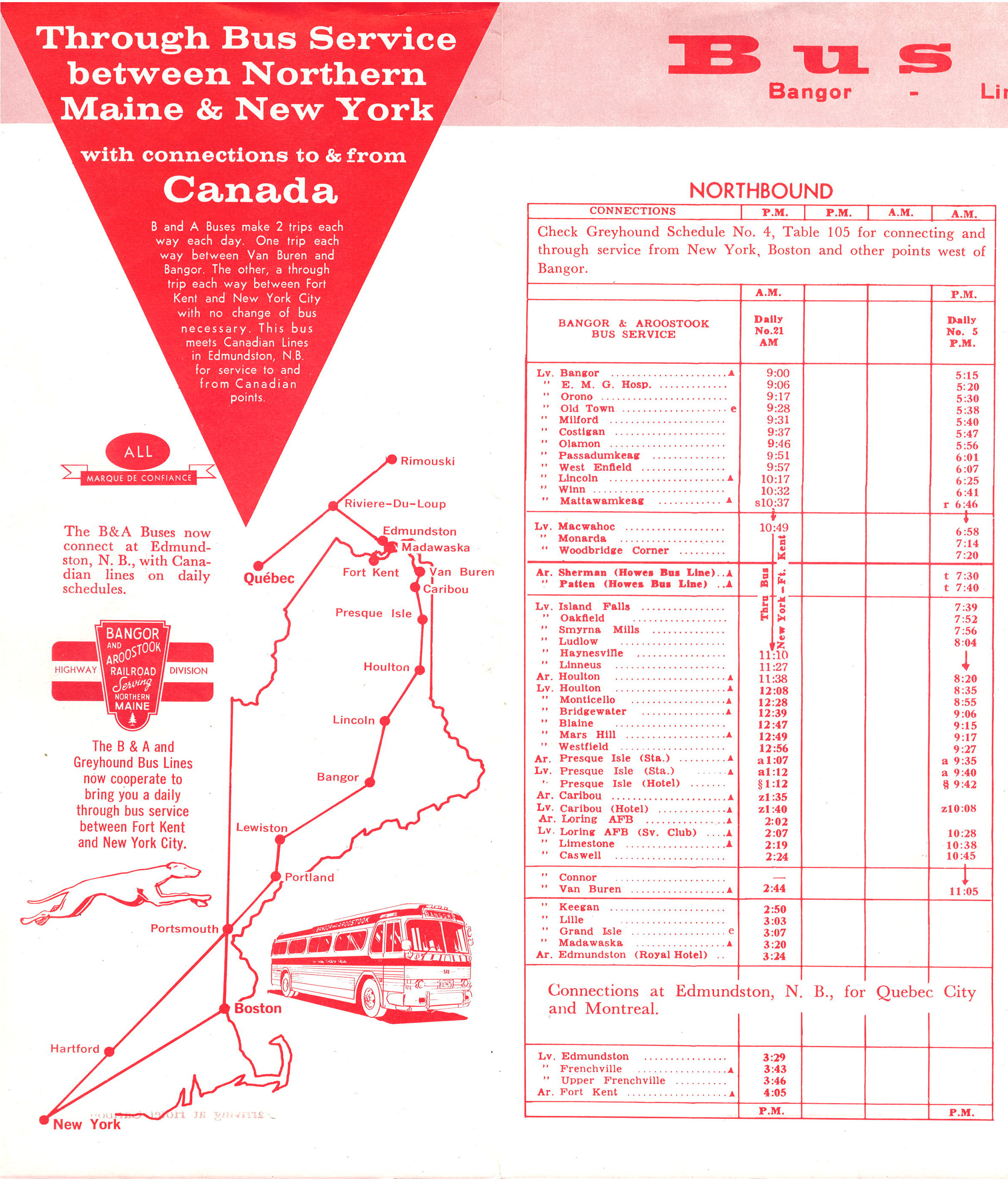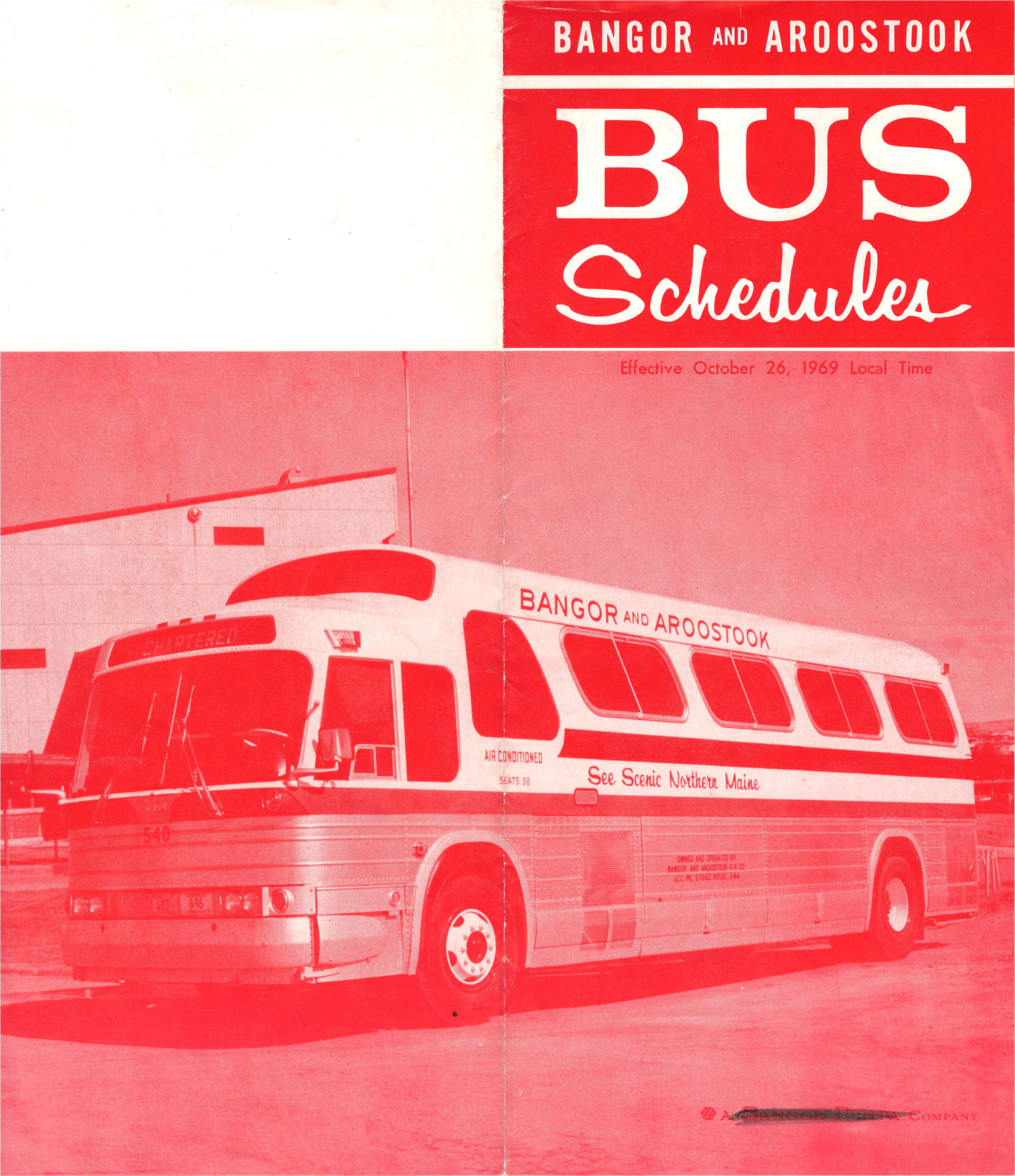With its red tint, this timetable cover is almost too much for the eyes. Opening up the covers we are treated to a photo of bus 540 in front of the Bangor Auditorium. Inside, the schedule is quite similar to those before and after. We are reminded of the connections both the North via Canadian Lines and South via Greyhound. Charter service and package express remain talking points and taxi service is listed as well.