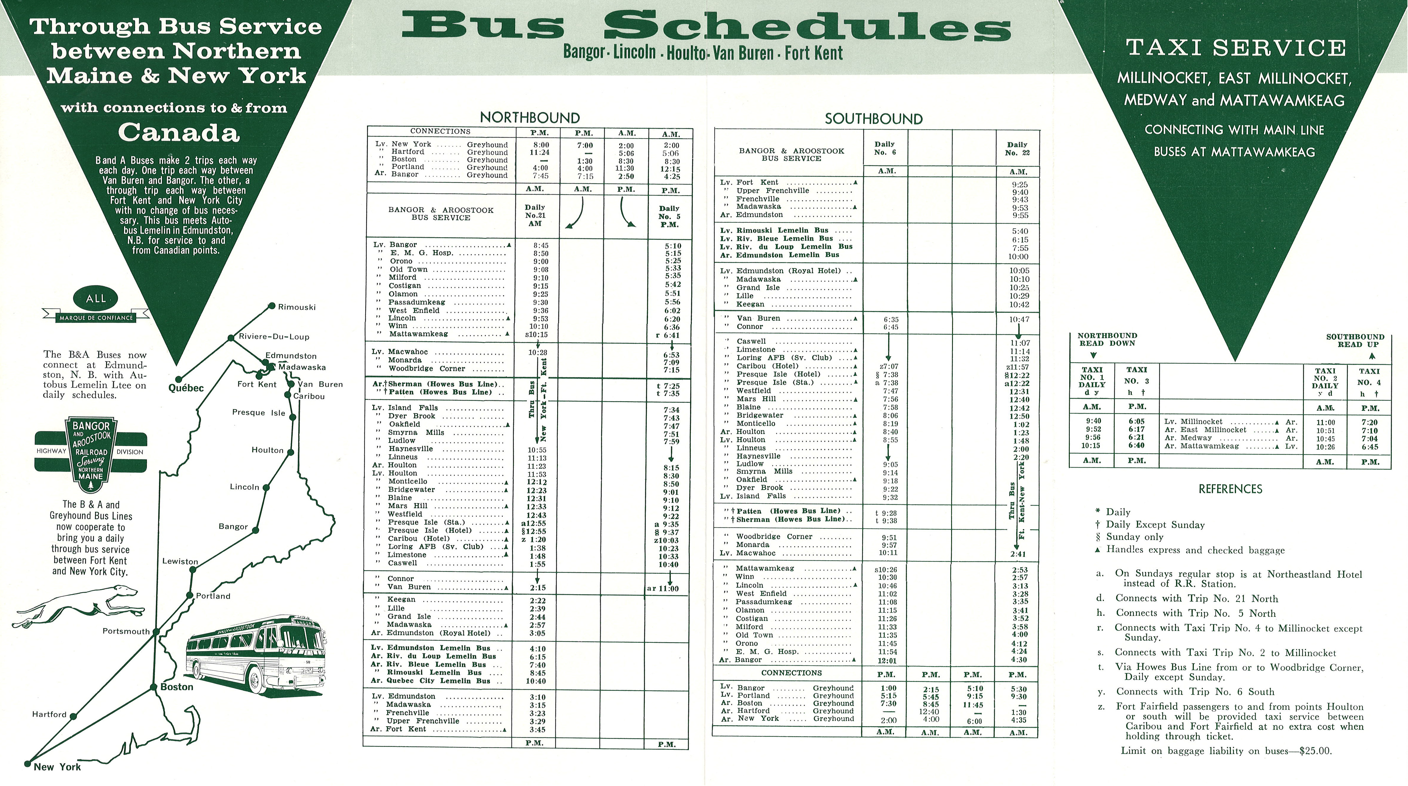 Released almost exactly a year after the previous timetable in this collection, we find that the color and format are identical to that we had a year earlier. The list of bus agencies has been reduced. Other than that, the first page is essentially unaltered. On the schedule page however, we have some changes. The stop at Lincoln Center is gone, leaving only the stop at Lincoln. The schedule for Northbound morning bus out of Bangor is unchanged. The afternoon bus however leaves 5 minutes earlier, but arrives at the same time. The Southbound bus out of Van Buren is leaving a full half hour earlier than before, but arrives 19 minutes earlier into Bangor. The Southbound out of Fort Kent is leaving five minutes later, but arriving in Bangor at the same time. Taxi times have been adjusted to match the slightly different times the buses will arrive at Mattawamkeag.