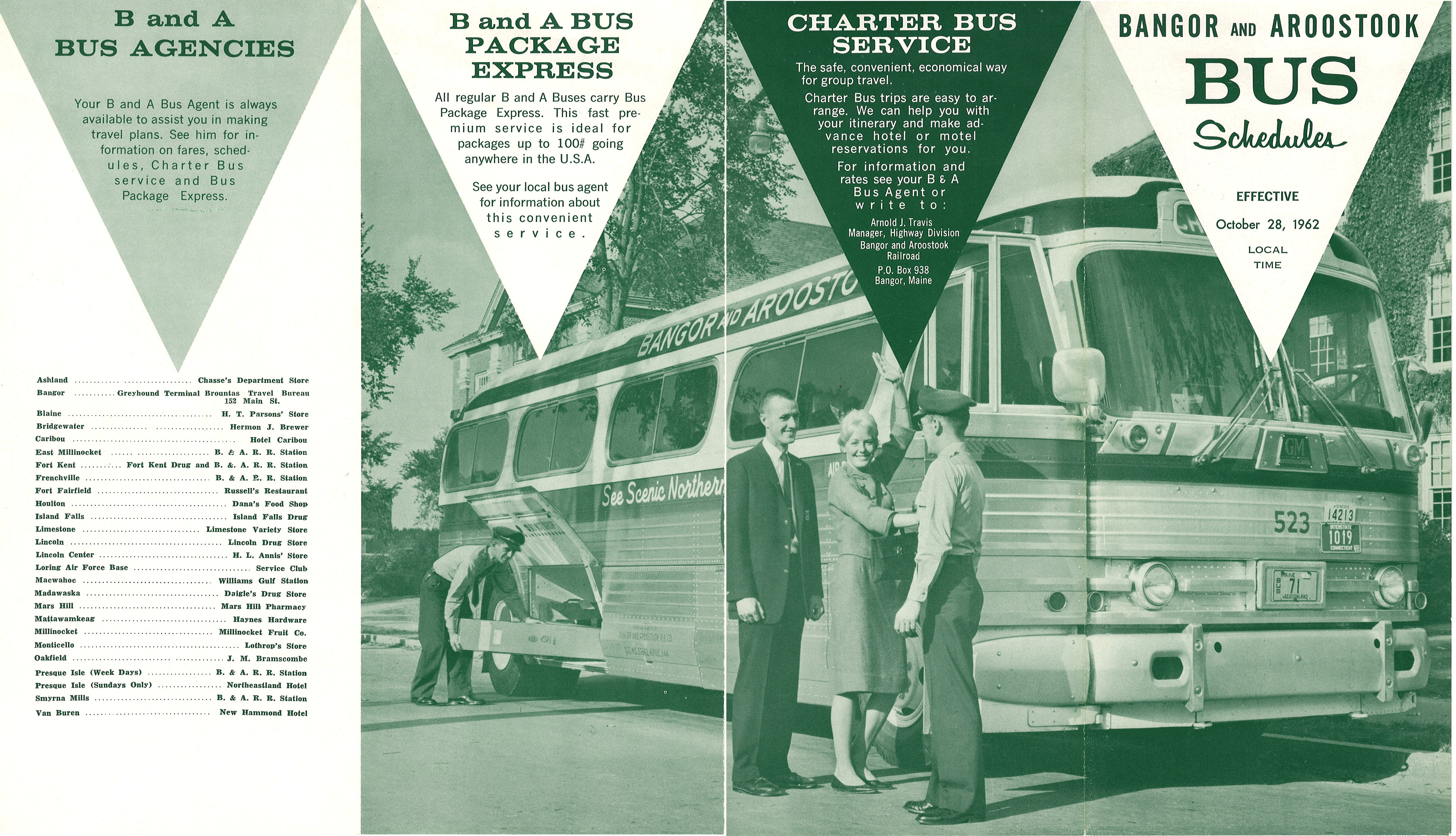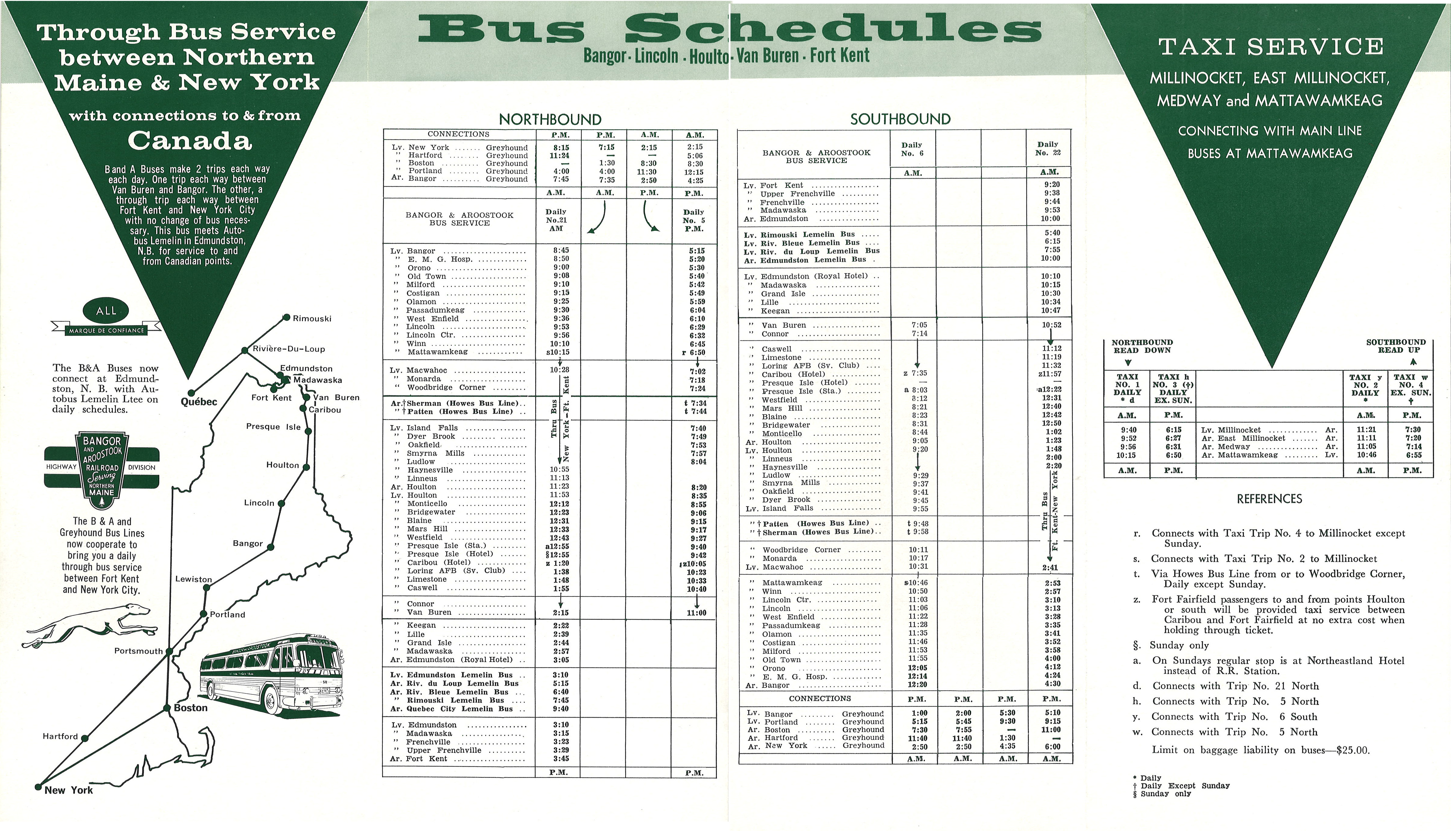 Released less than two months after the previous timetable - there are a few changes, more than one might expect for two timetables released so close together. The format and photo remain, in a green tint this time. The list of bus agencies has been reduced. Aside from that, the front page is essentially unaltered. Inside we do have a schedule change although the reason is not given - the Southbound morning bus from Fort Kent now leaves at 9:20 AM, 25 minutes earlier than the previous schedule. On the other end, the arrival time in Bangor is also earlier, but only by 15 minutes. The morning Northbound is now scheduled to arrive five minutes later in Fort Kent, but the departure time is the same. The stop at Littleton in both directions has been eliminated.