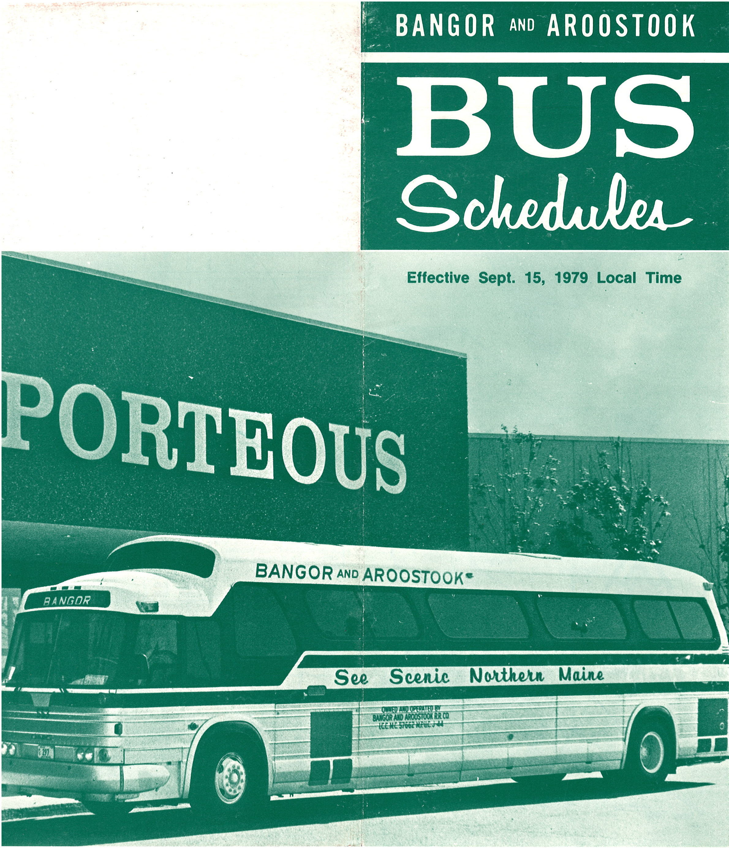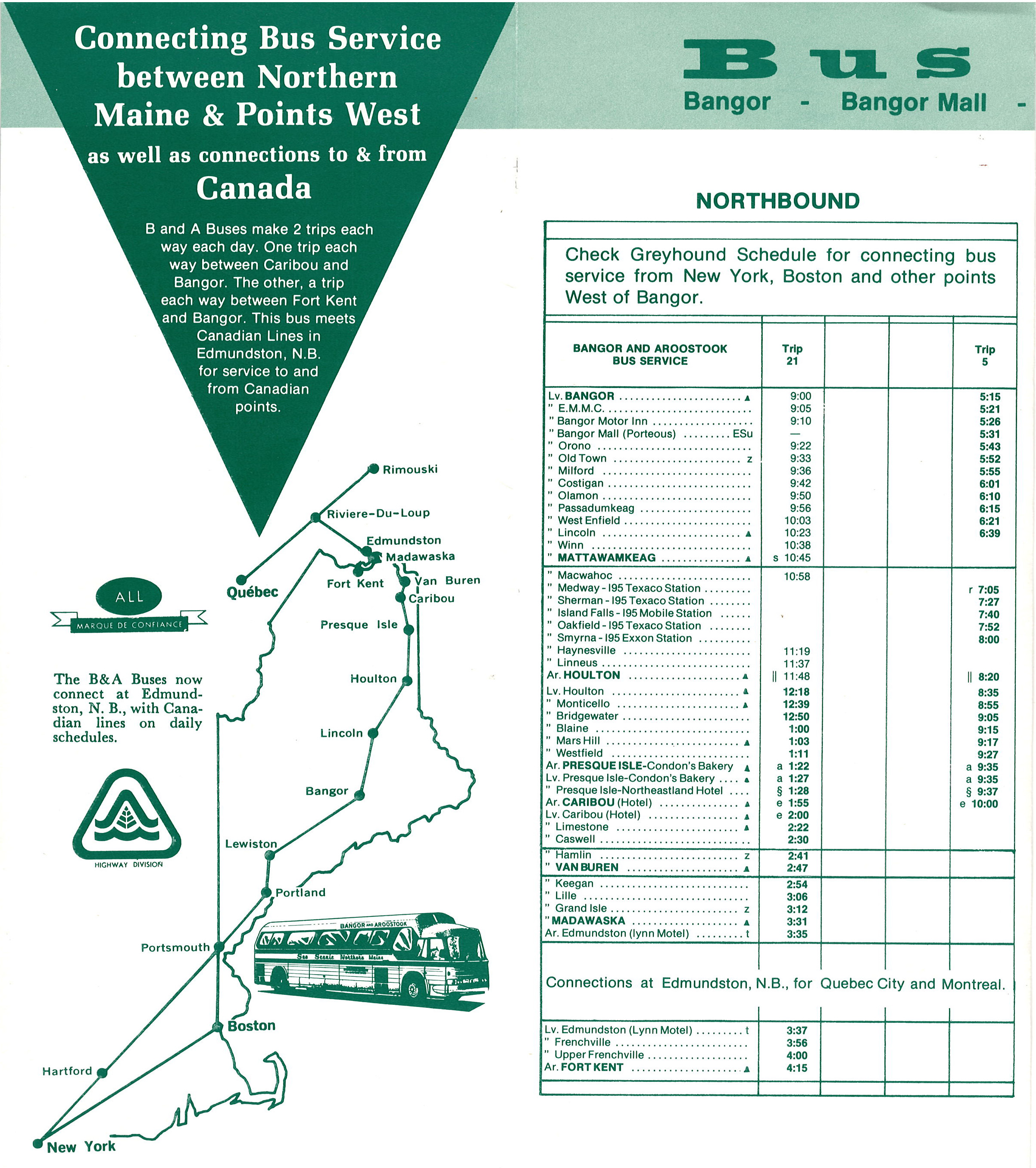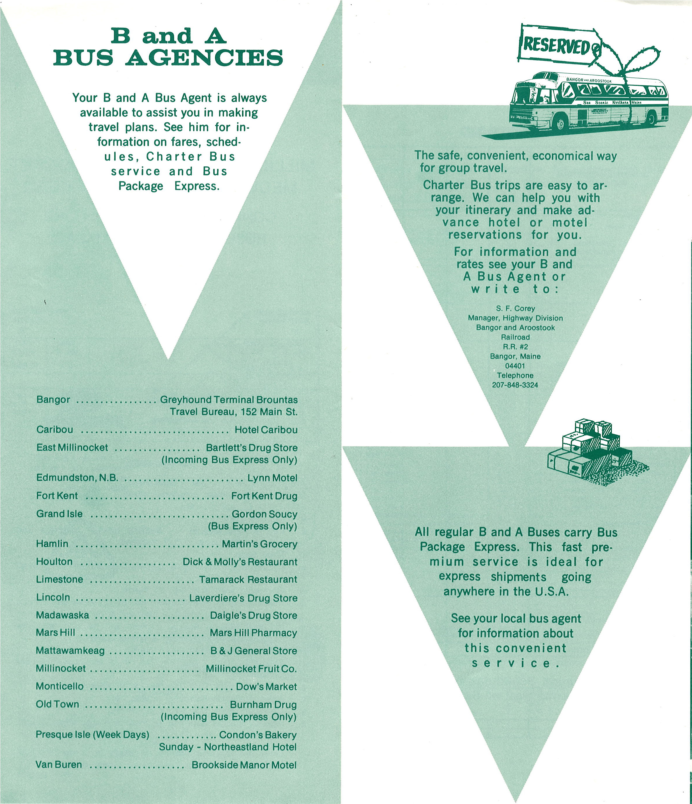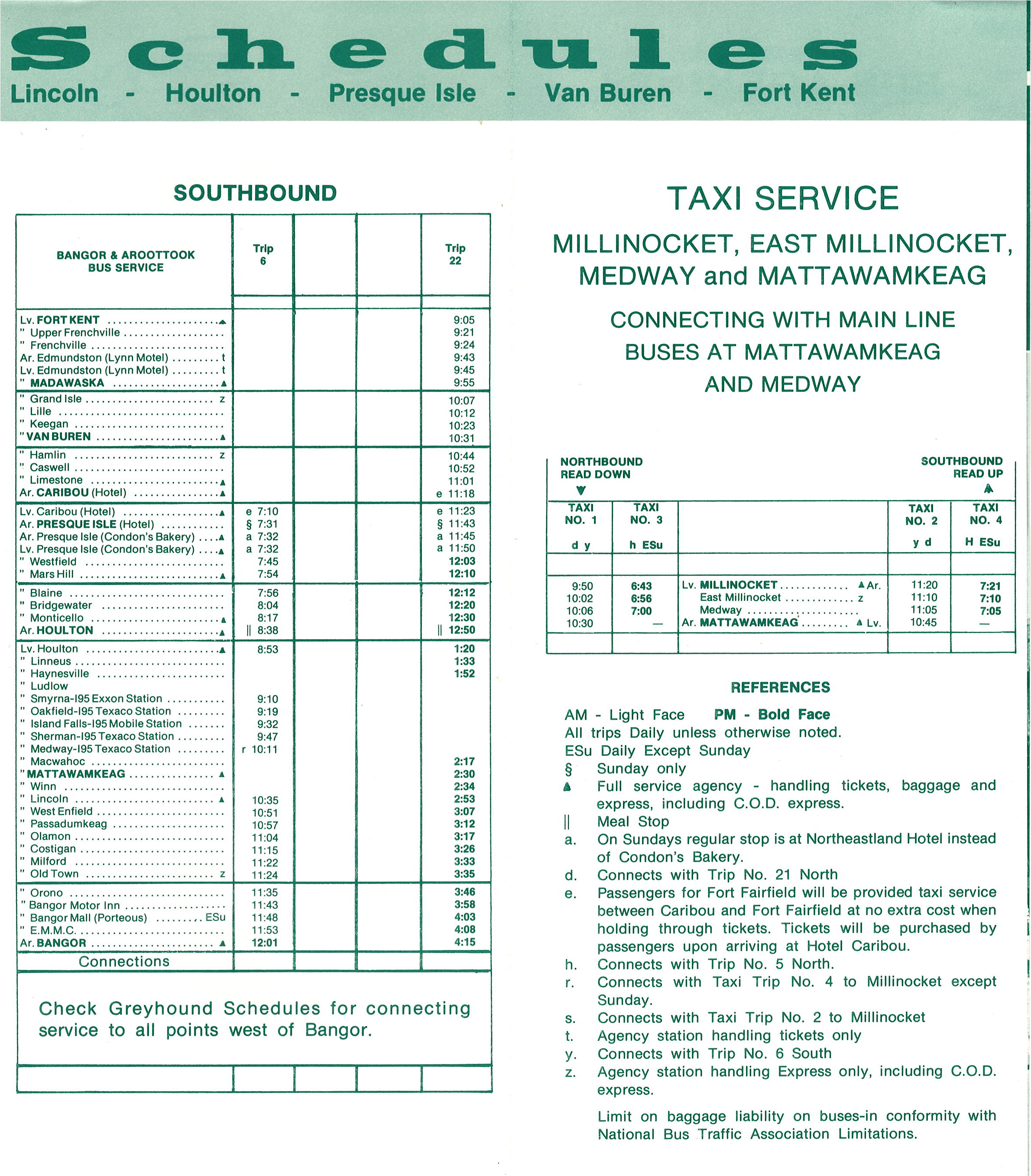 This timetable continues the old railroad habit of tinting an entire timetable with the same color. This time we are green and the front cover, when opened, reveals a photo of bus 553 at the Bangor Mall. We are invited to 'See Scenic Northern Maine' right down the side of the bus. Inside charter bus service is still being pushed as is bus based 'Package Express' service. Greyhound is referenced for connections, but no information is provided. We are reminded that one trip per day is made to Fort Kent and that one can easily catch a Canadian Lines bus and get a ride to Canadian points. Two round trips per day are being made, but the later departure will only get you as far as Caribou. The earlier trip will get you all the way to Madawaska. On the Southbound side, the earlier bus starts in Caribou and will have you to Bangor just after noon, where the Fort Kent bus will get you into Bangor at 4:15. Meal stops for both trips in both directions are in Houlton. Taxi service is listed for the Millinocket - Mattawamkeag corridor. Ever helpful, the bus service will offer passengers a taxi ride if their destination is Fort Fairfield, provided they are holding through tickets.