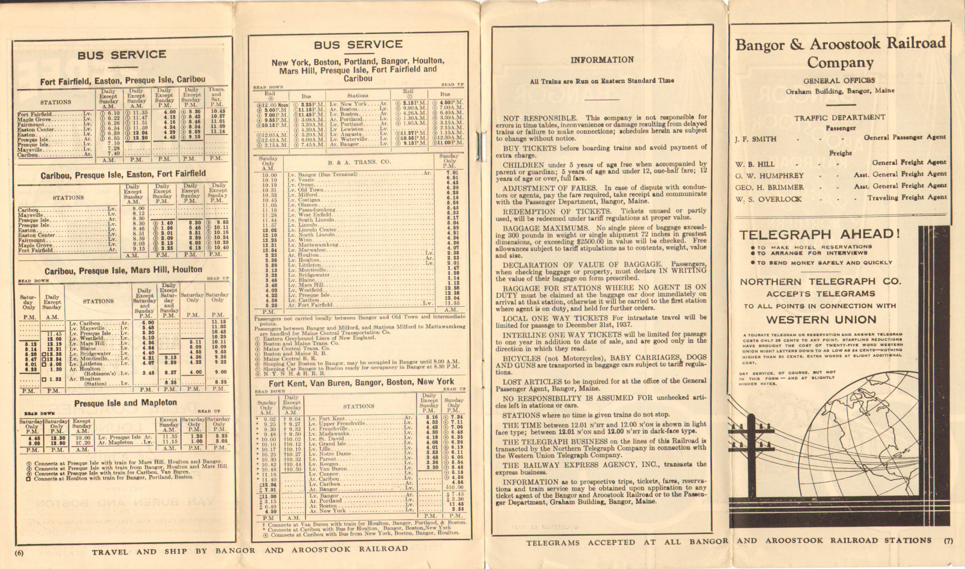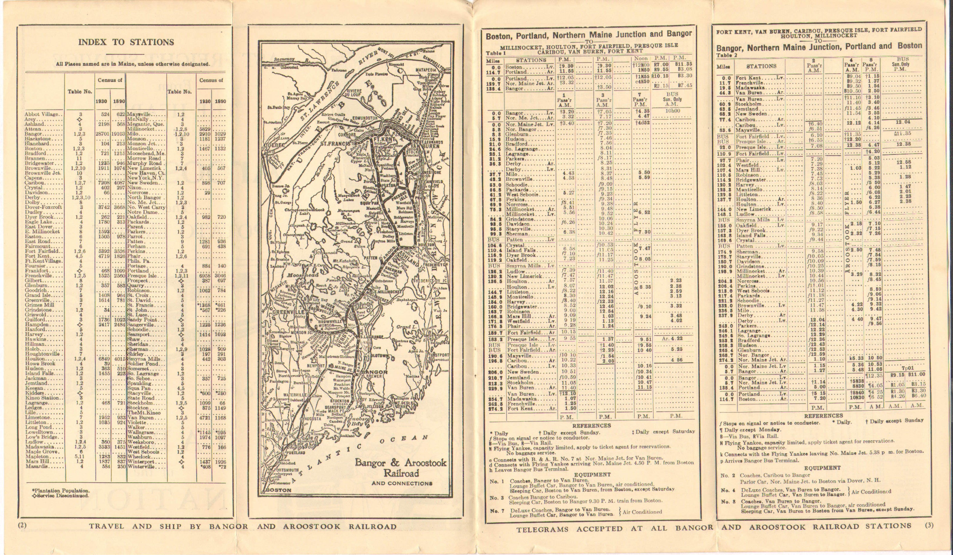 The year of 1937 seems to have been one of blue timetables or at least blue timetable covers. This one has a double page advertisement not for passenger service, but the Fast Freight service - hauling Potatoes to the nation. The Aroostook Flyer, both the North and Southbound schedules have been altered and it appears the running time for both has been lengthened compared to the September timetable we last looked at. A winter schedule taking into account snow perhaps? The somewhat confusing mixing of the bus and train into a single timetable has been done away with, favoring a separate timetable. The exception to this is a listing for Sunday only buses, which remain listed in the train sections. Sunday service on the buses seems to be increasing, one presumes due to demand. Overall, the Bangor and Aroostook is doing very well at providing passenger service to the people of Northern Maine.
