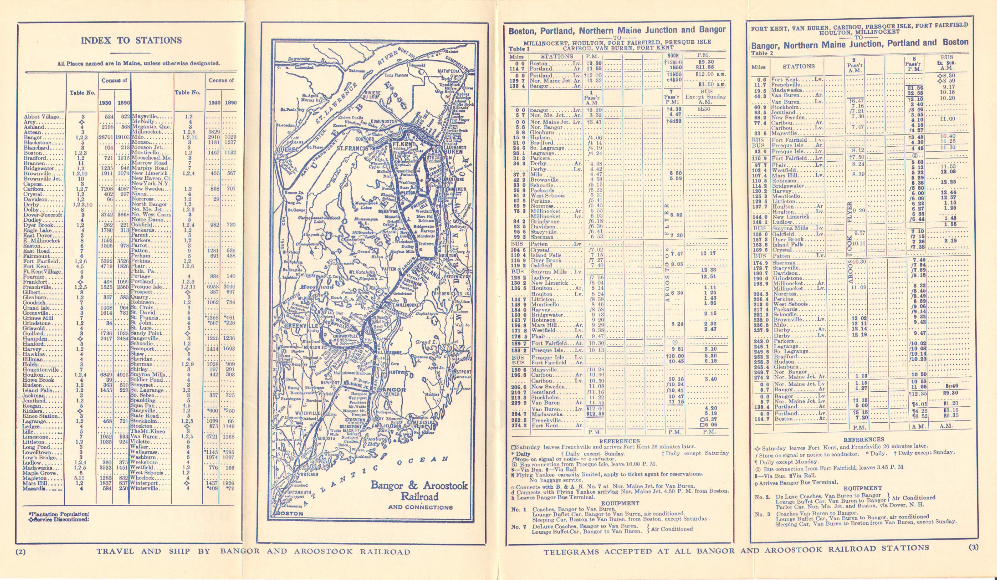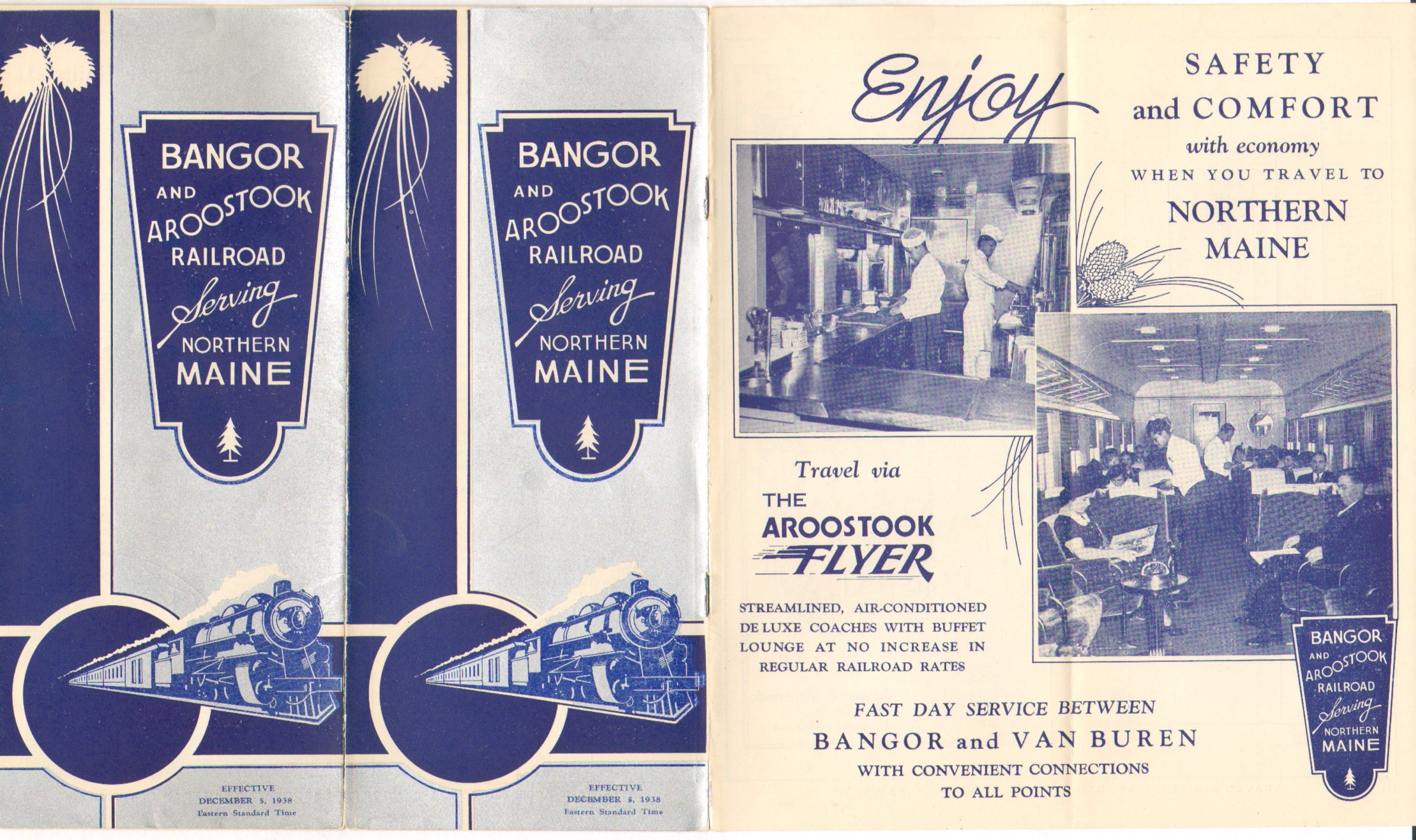 Yet another blue tinted timetable. 1938 would seem to be the year of blue. The interior double page consists of an ad for the Aroostook Flyer - still promoting day service between Bangor and Van Buren. The Aroostook Flyer text is now within the column for train #2, indicating that it is the Southbound Flyer.