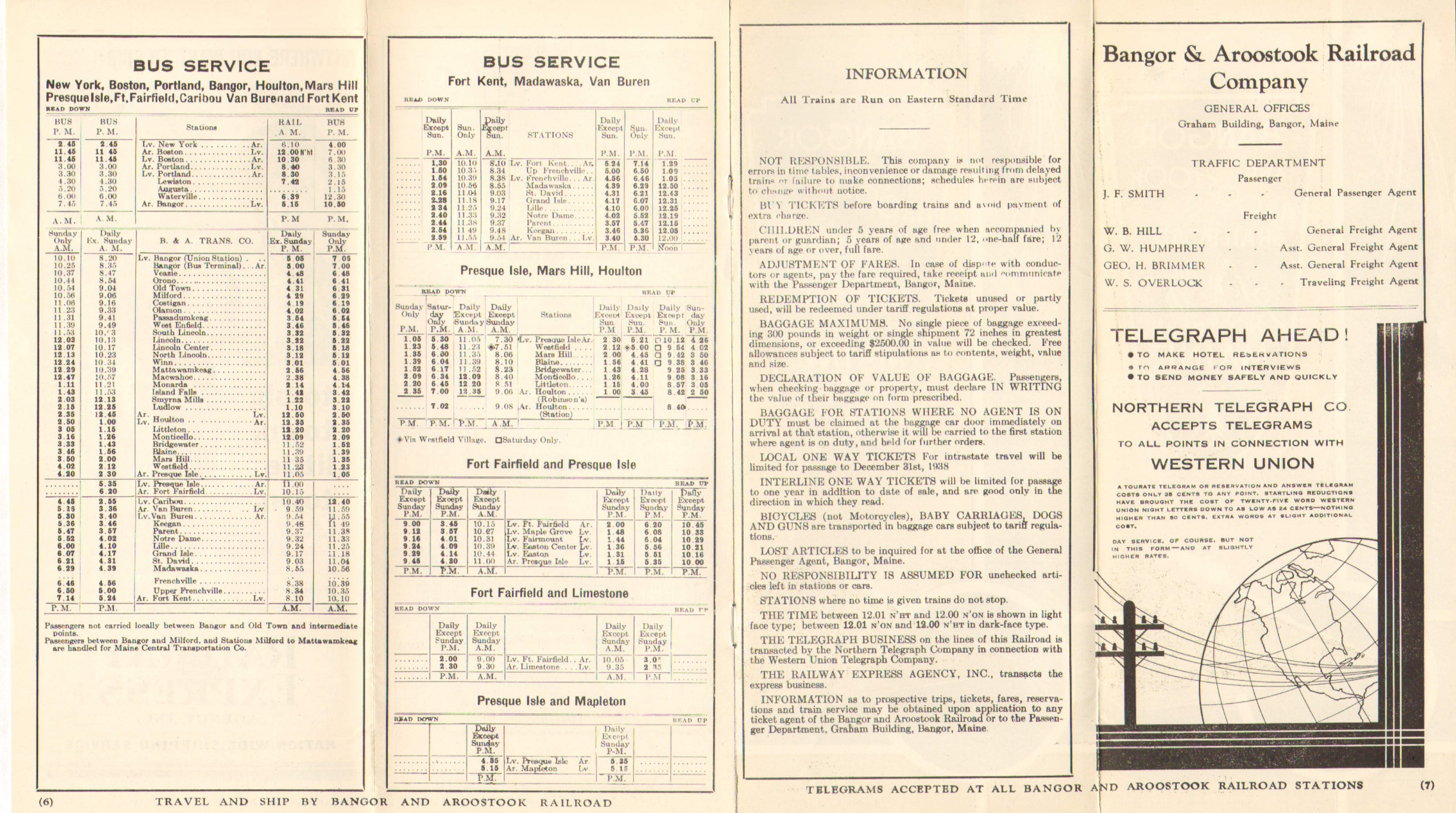 The first timetable in this collection from 1939 and we still have a blue cover, but the interior text is black. Not much has changed, but the bus service between Frenchville and St. Agatha is gone.