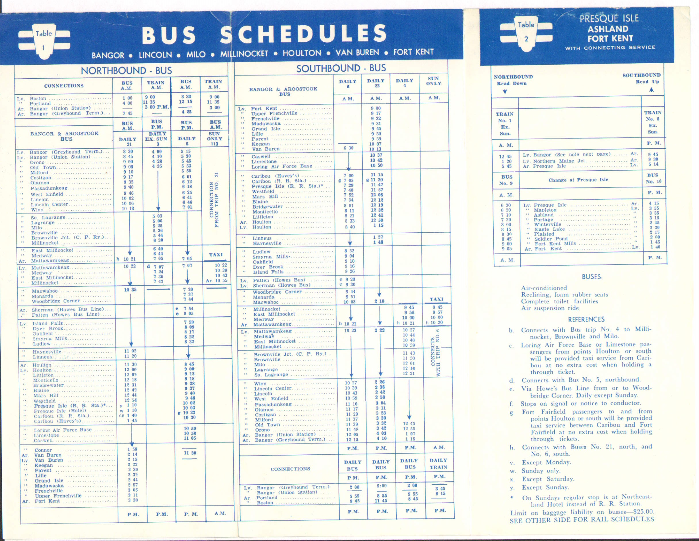 An attractive blue tint cannot hide the despair of the passenger train rider in this timetable. Unlike the last timetable in this collection from 1959 - this first one from 1960 shows that the B&A is no longer running into Bangor Union Station. The passenger trains originate / terminate at Northern Maine Junction. Passengers with through tickets will be offered a complimentary taxi service to and from Bangor, either Union Station or the bus terminal. Further, the name Potatoland Special appears to have been completely dropped. We have only train #1 and Train #8, daily-except-Sunday. Food is still being served but there are no longer any sleeping cars on these trains. Further, on the last timetable we looked at in 1959, you could ride a train all the way to Madawaska. Service has been cut back to Caribou. Truly a shadow of its former self. The good news - you could make it from Northern Maine Junction, to Caribou and return in a single day. The bad news, you had to catch train #1 at NMJ at 1:20 AM. The good news, you would be in Caribou by 6:30 AM and have a solid 10 hours before the departure at 4:50 PM to come back south. You would make it back to NMJ at 9:30 PM - 20 hours and 10 minutes after you left.