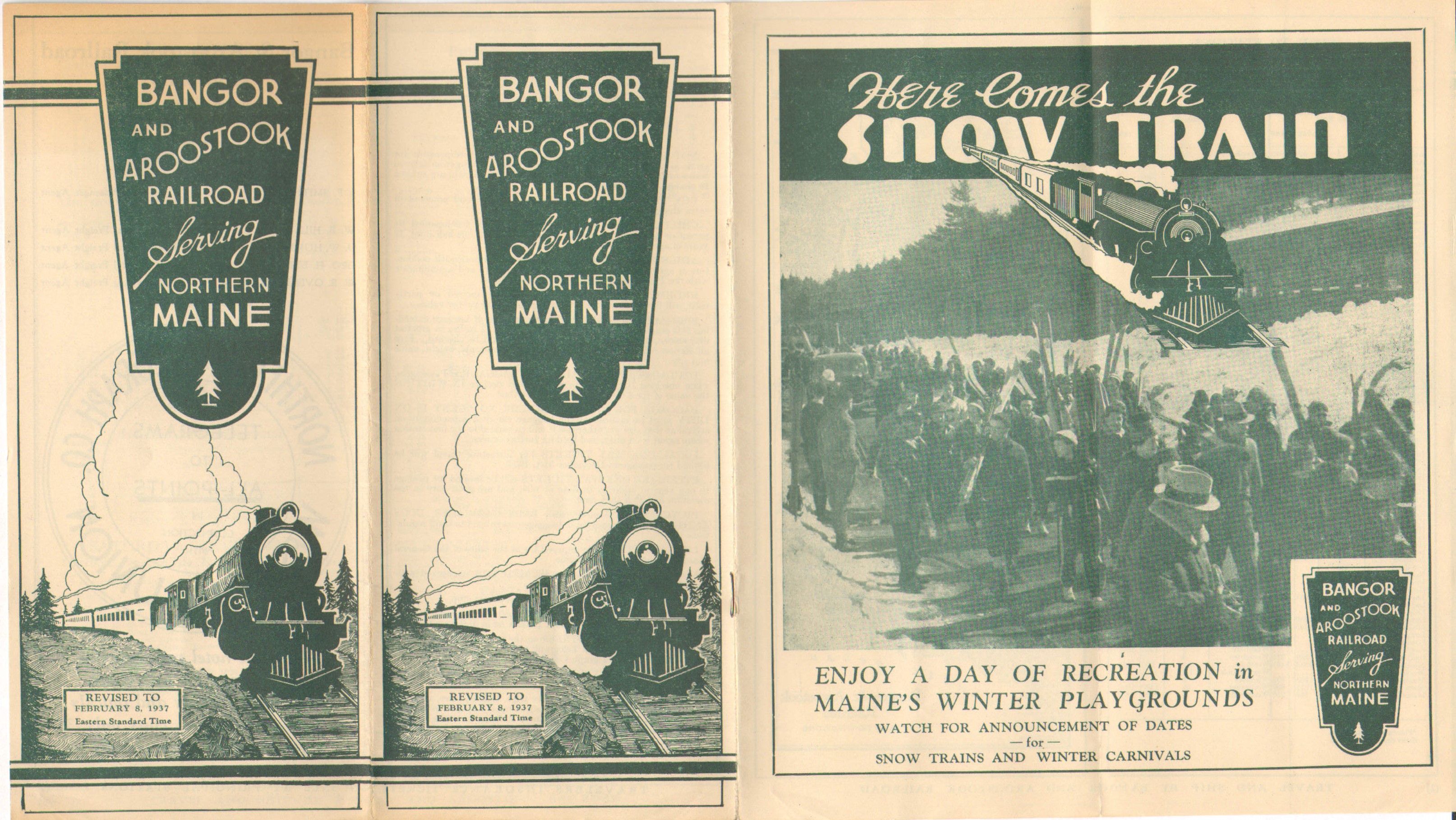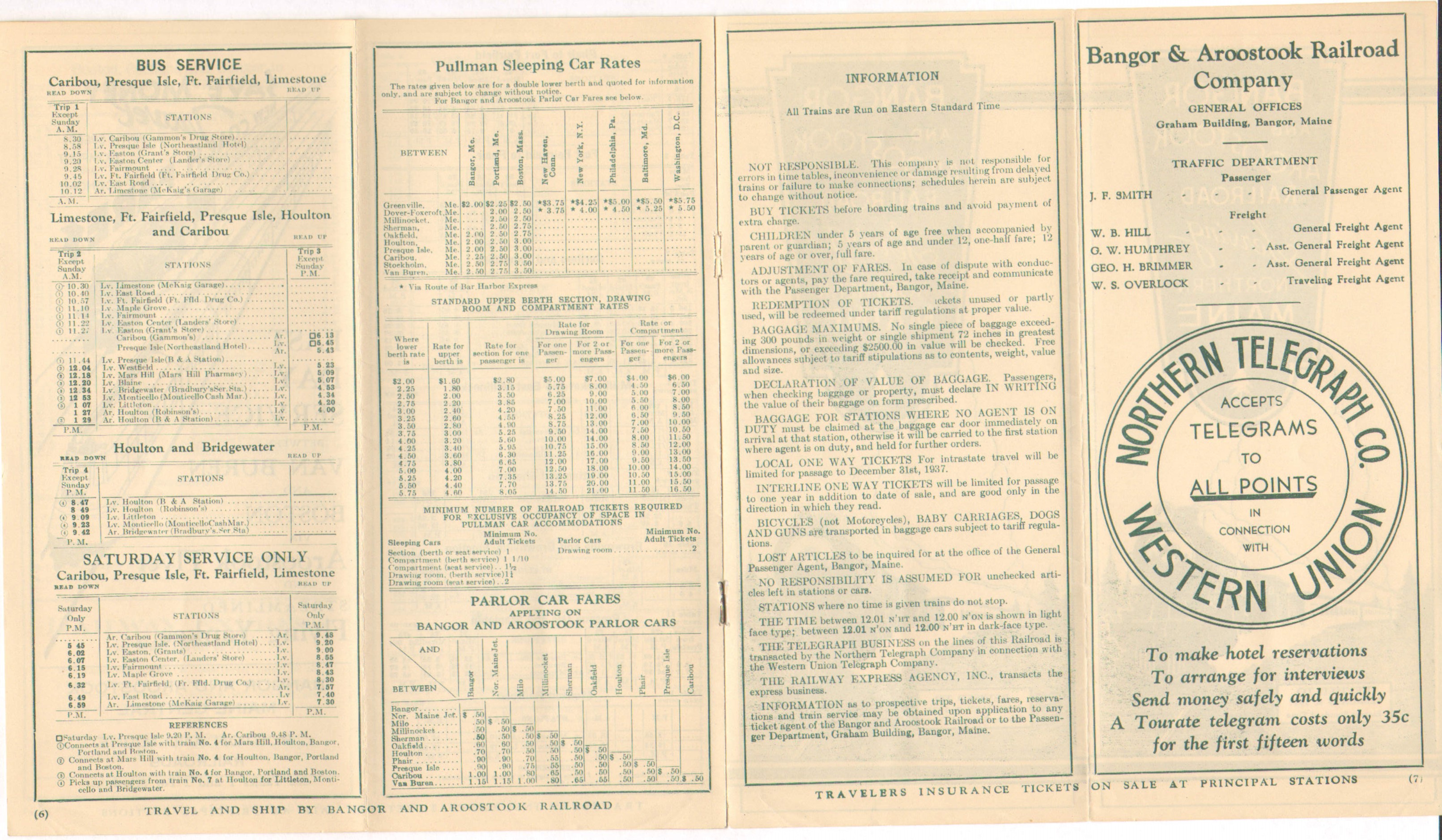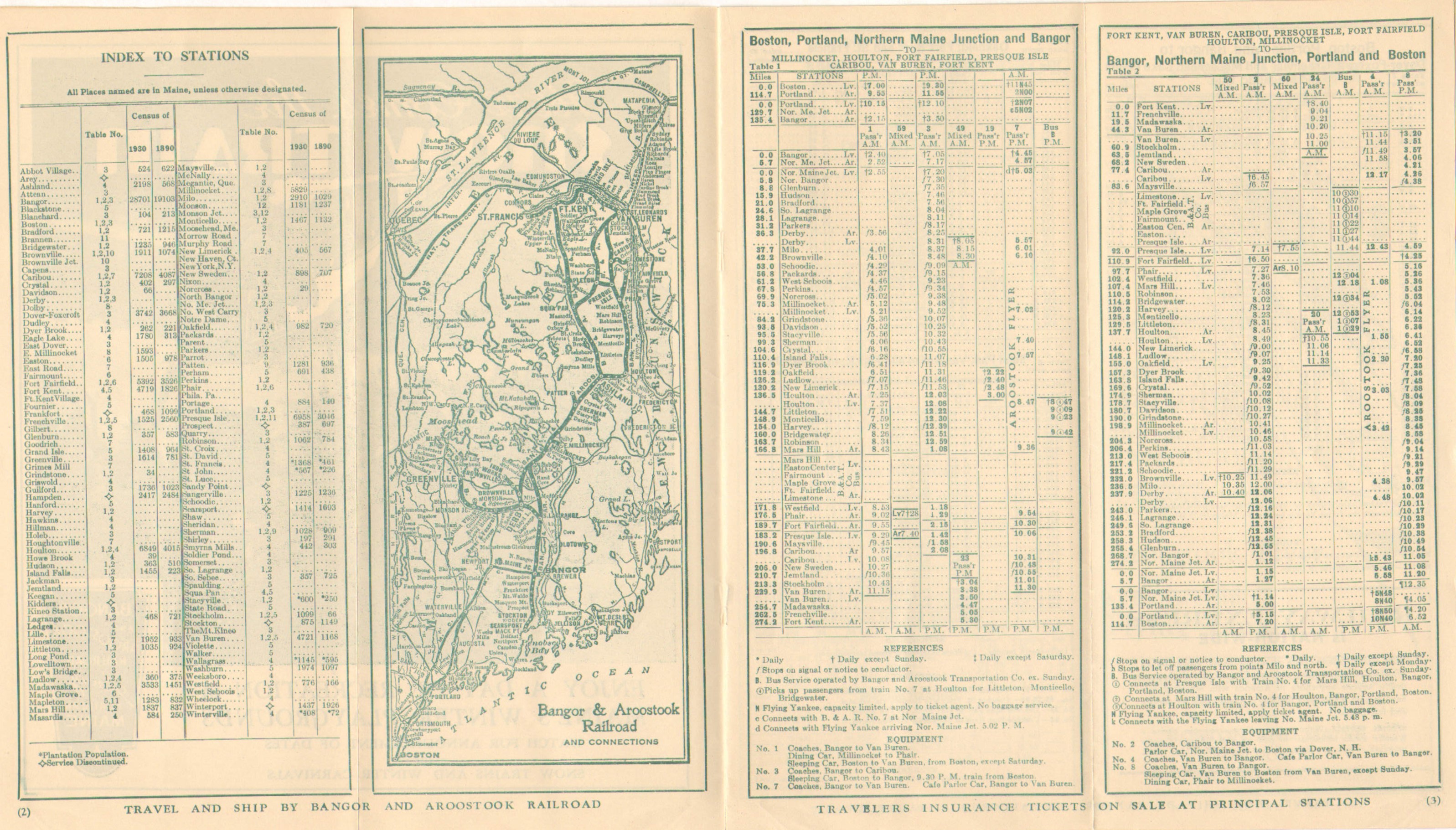 This timetable appears to be nearly identical to the one of a month and three days previous, except for the green tint on everything and the bus service on page 6. Purely to connect with train 7, The Aroostook Flyer, a bus would pick one up at Houlton and take you to Littleton, Monticello or Bridgewater, while the express skipped those spots and went straight to Mars Hill. It would seem that there was enough traffic to those three towns to justify the bus.
