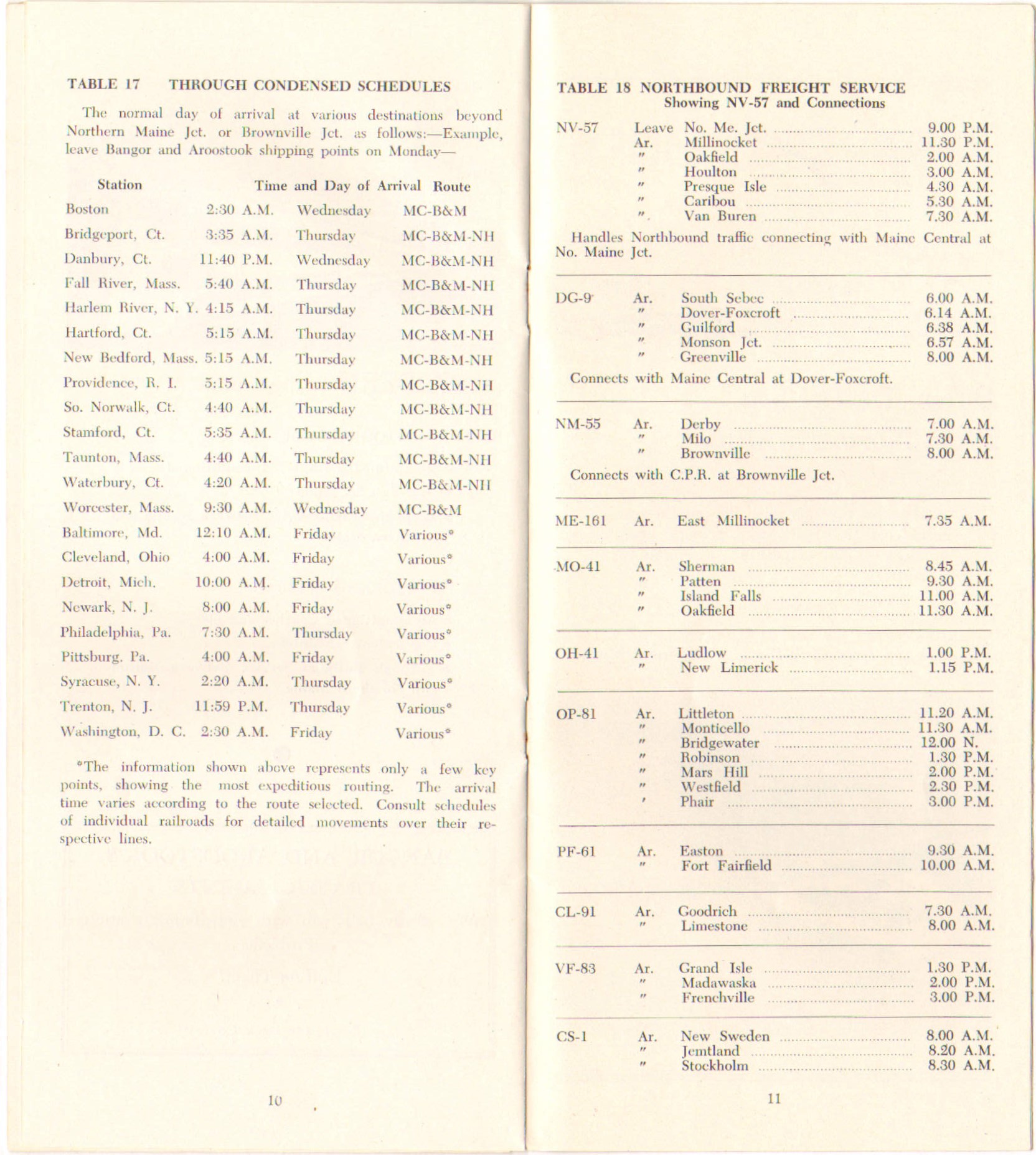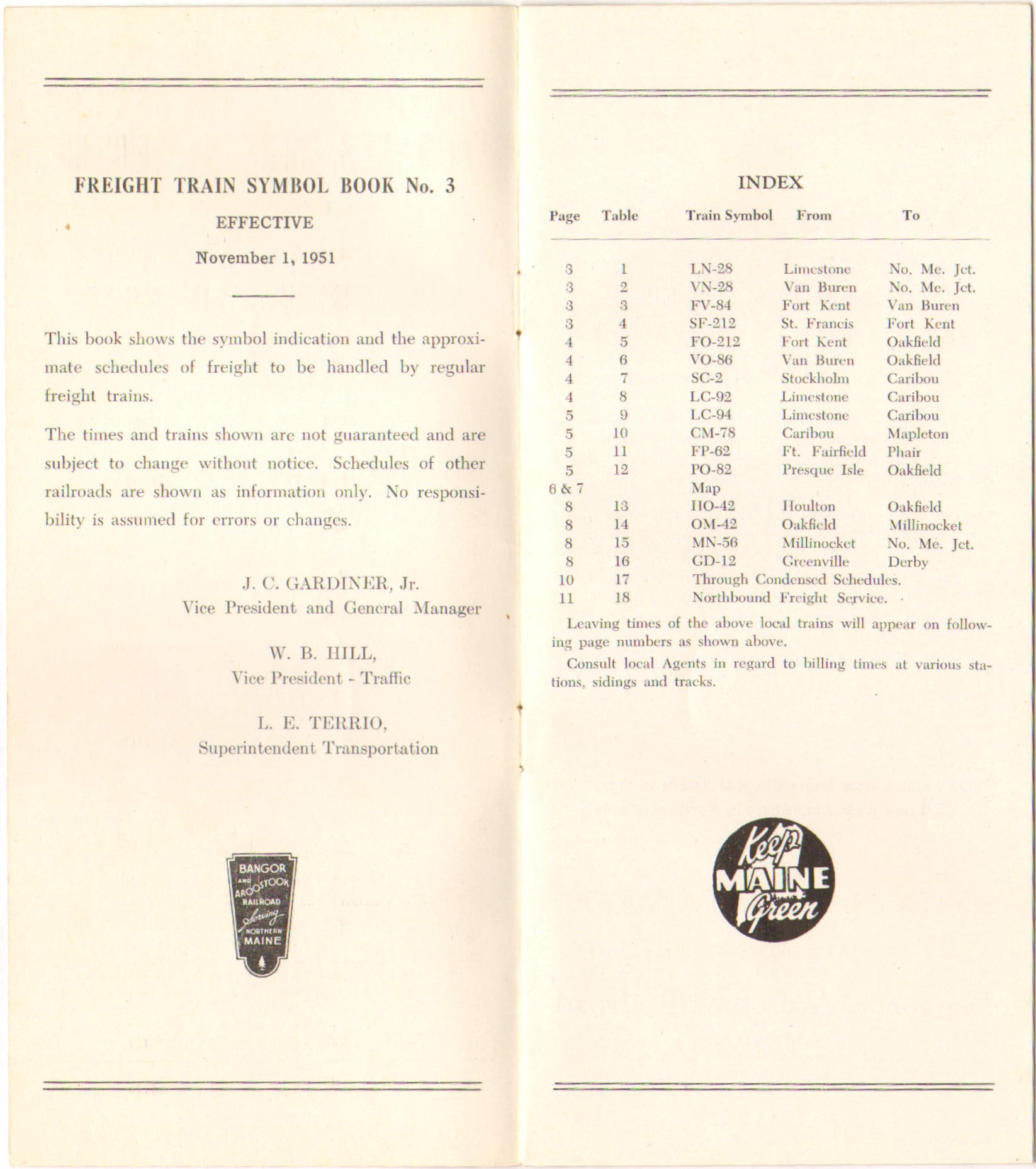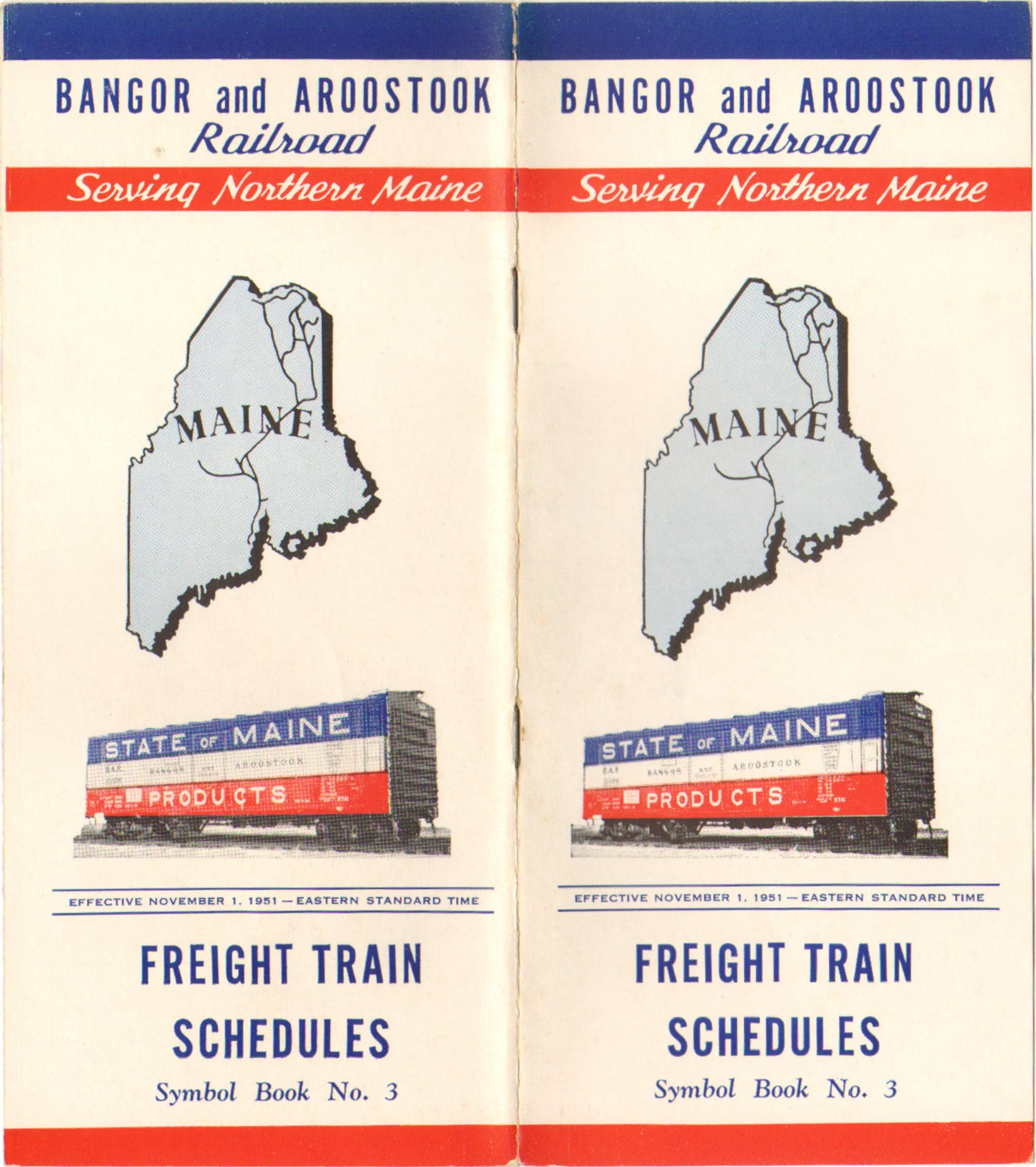 Public passenger timetables are fairly common, but a railroad published freight train schedule is somewhat rare. This is the third one of these produced by the railroad. Perhaps one of the greatest types of documents for those trying to understand traffic patterns produced by a railroad. It is interesting to note that there are no less than three Southbound trains to Northern Maine Junction, indicating just how much traffic goes out through the Maine Central. Interestingly, although the port of Searsport is specifically mentioned on page 12, the schedule pages do not indicate any regular scheduled service to Searsport. Interestingly, the 1954 Freight Train Schedule (Number 6) also ignores Southbound freight to Searsport, but does include a note about it in the Northbound section. The previous Freight Train Schedule, November 1, 1950, also neglects the southbound and has the Northbound mentioned.