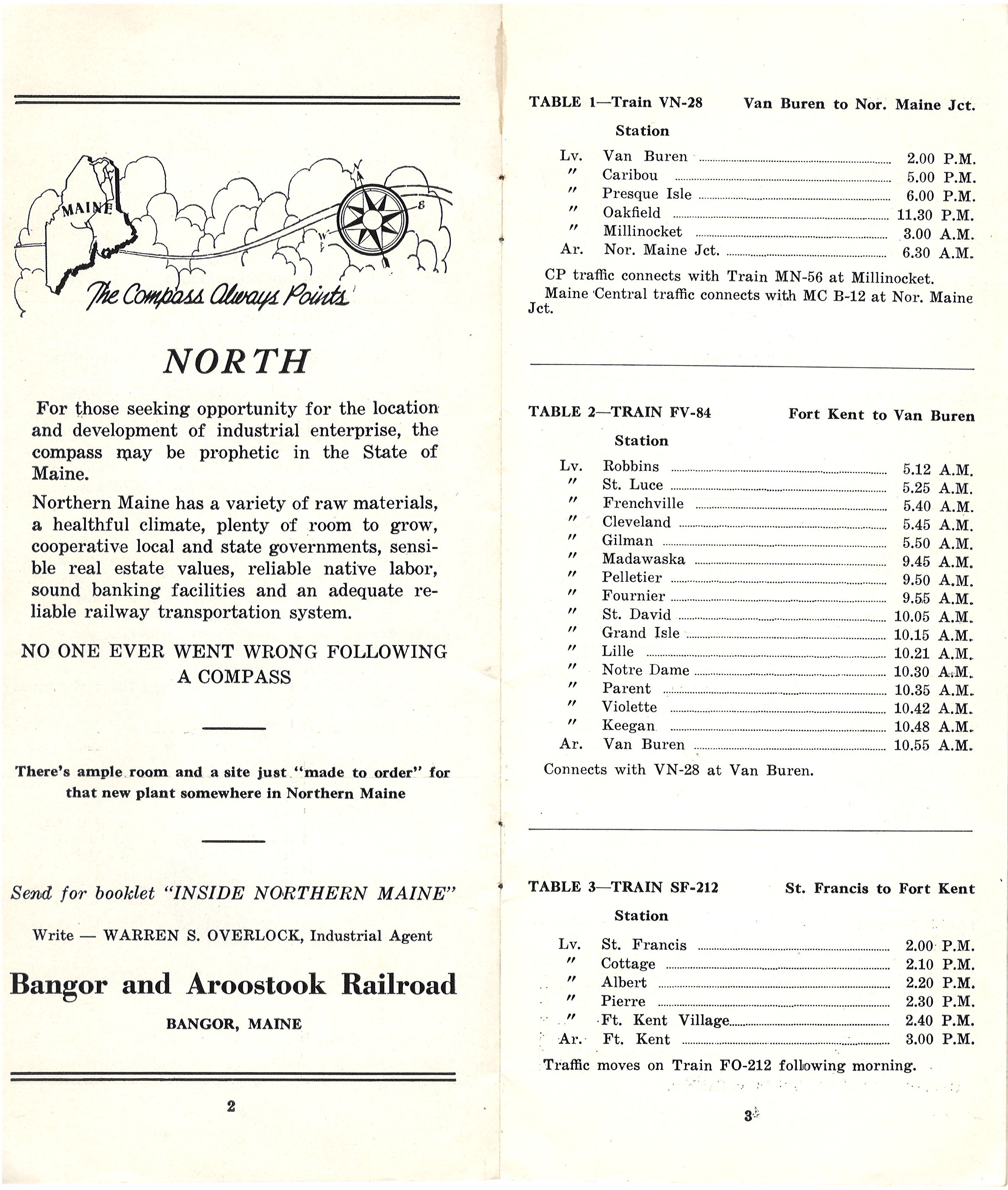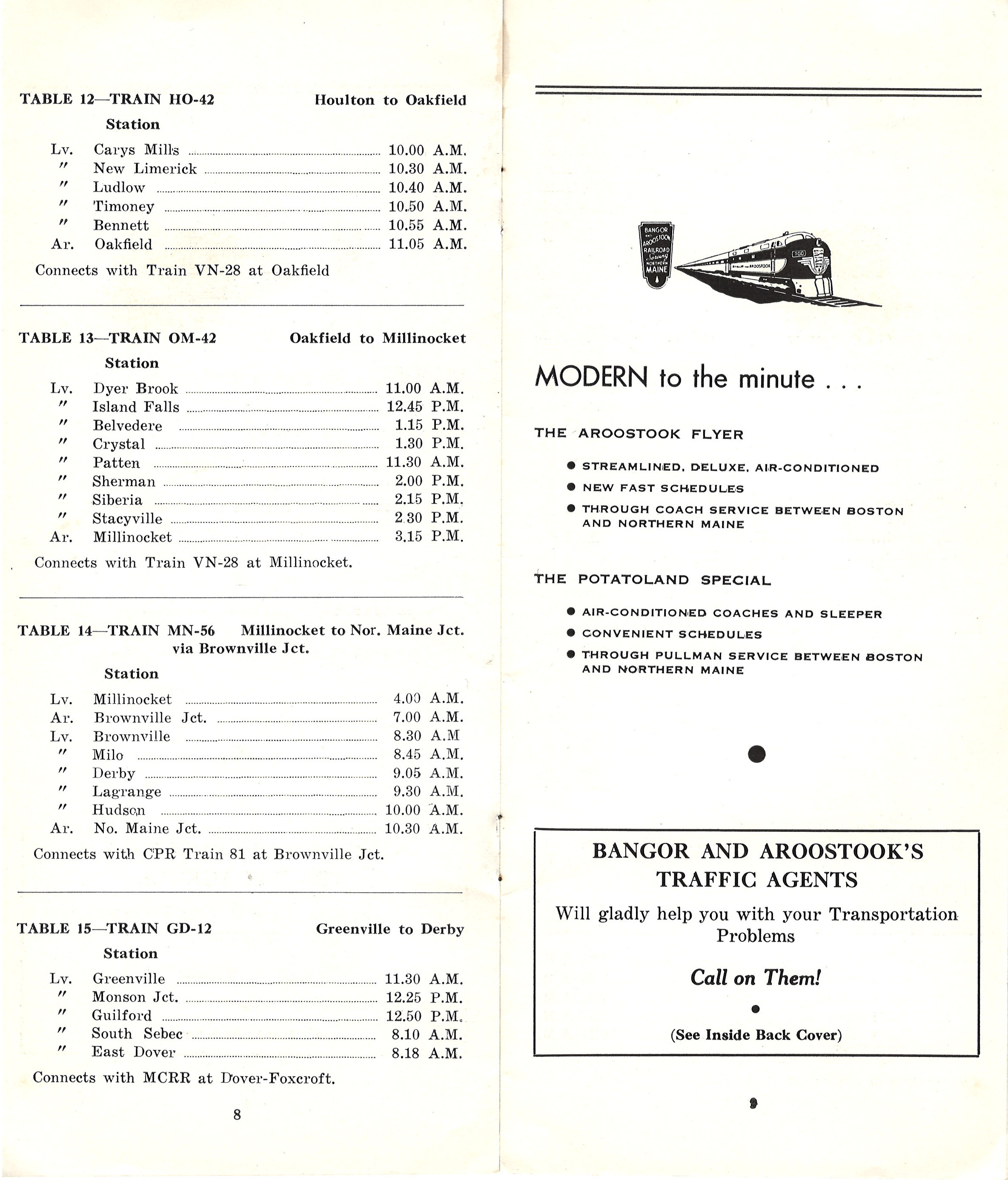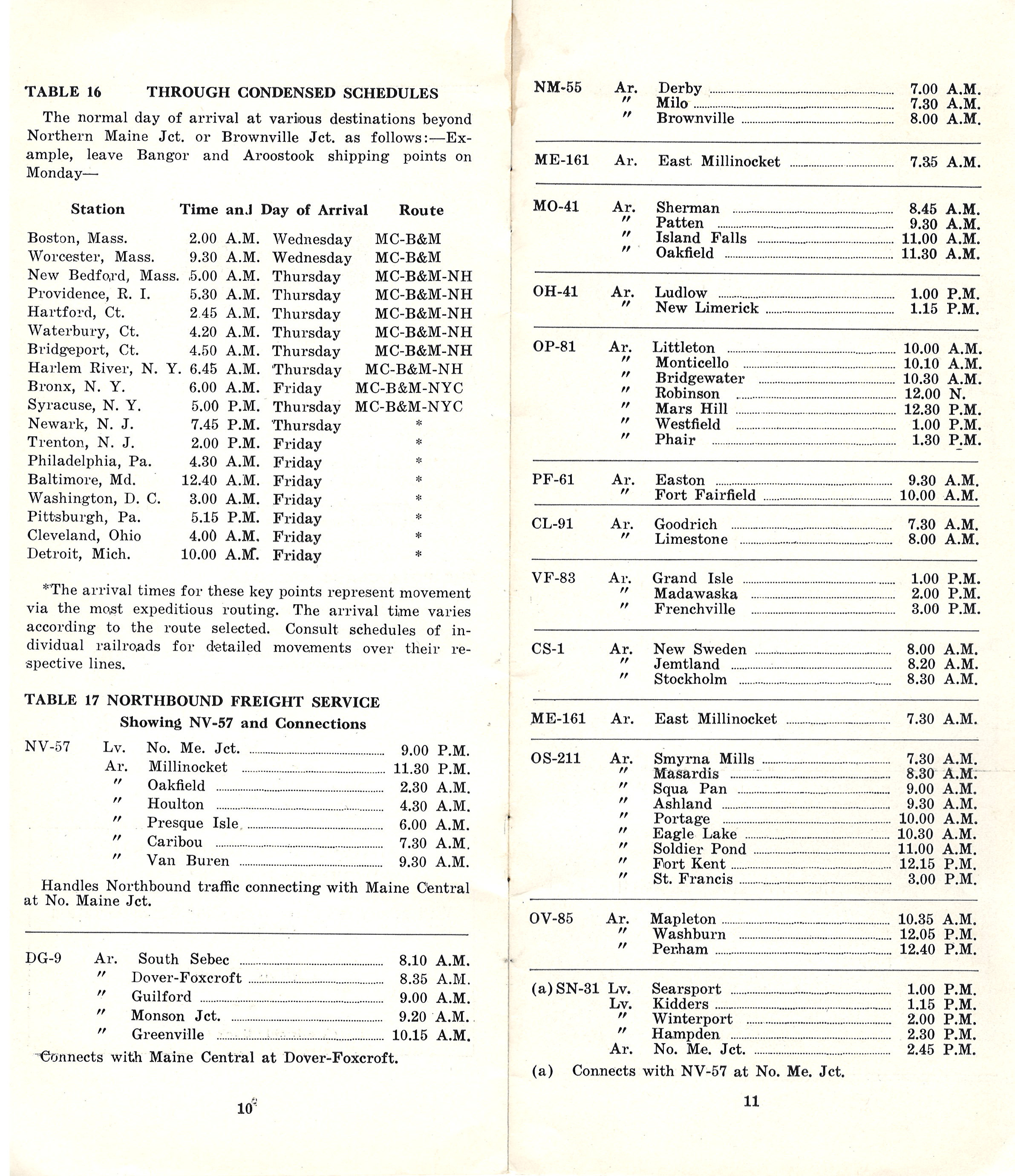 The third Freight Train Schedule in this collection wears the number 6. Evidently the railroad produced at least six of these. Interestingly, they might have been 'public' in the sense that they were not only for employees, but honestly aside from enthusiasts, the only people who would have needed these were the shippers. Aside from the front cover, this publication is all black on white and very much about information without a lot of fluff. Interesting is a table on page 10 (Table 16) listing the time one could expect to see their load delivered if the car left on a Monday. Although almost exclusively freight information, there is one nod to the Aroostook Flyer and the Potatoland Special.