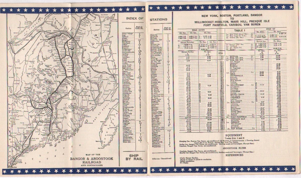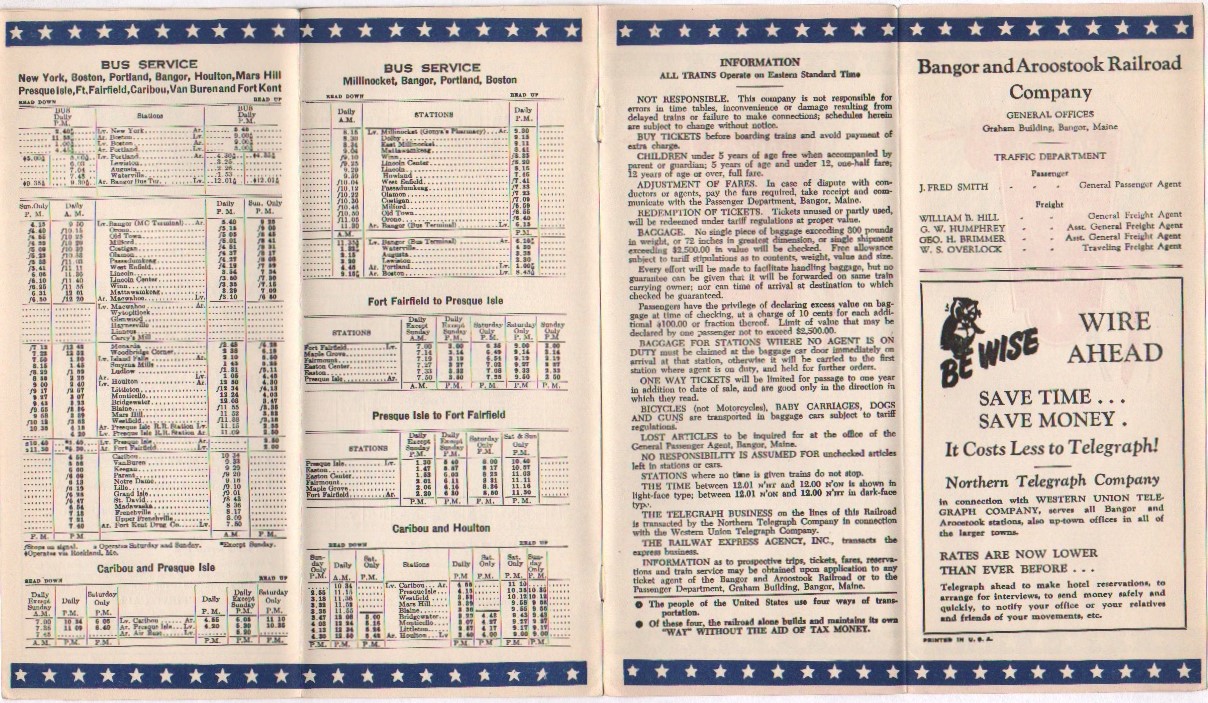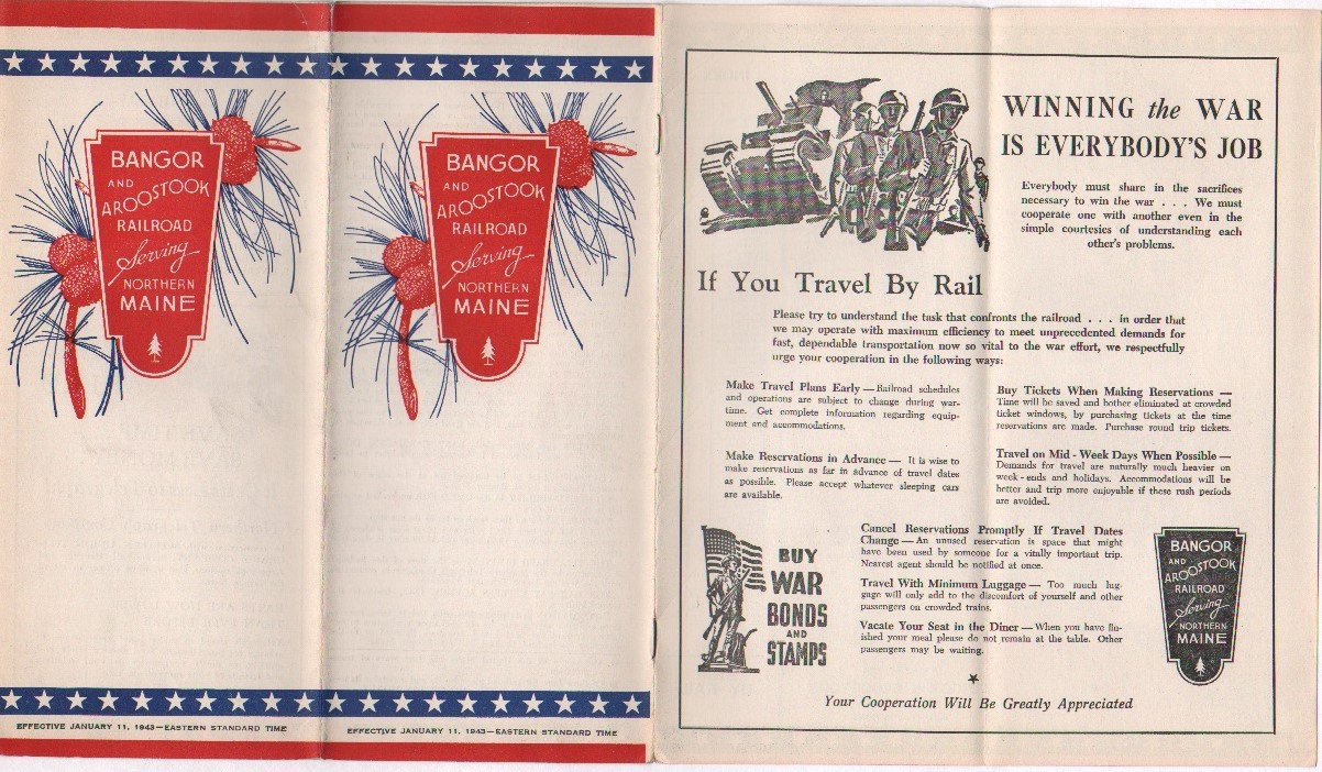 This timetable is a near clone of the one from November of 1942 in this collection. What the differences are, if there are any at all, are very small. Interestingly, trains #1 and #8 have added sleepers, but are not a named train. Passenger rail service seems to be still daily-except-Sunday - but the bus system has gone to predominately daily service. The schedule is often reduced or changed on Sundays, but at least something is available. Interestingly, a note about dining car service is included - essentially rationing and wartime prioritization in the dining cars.