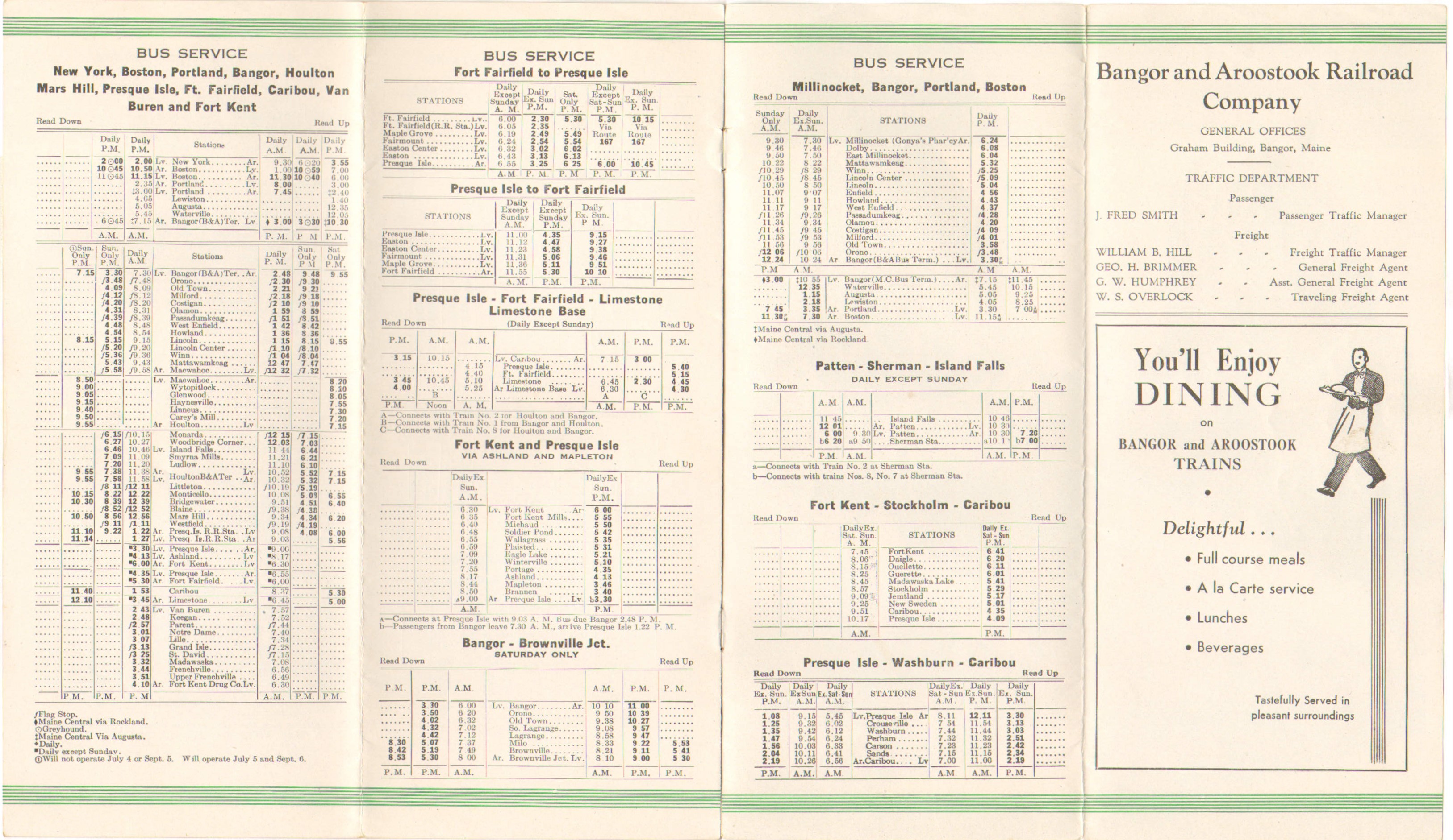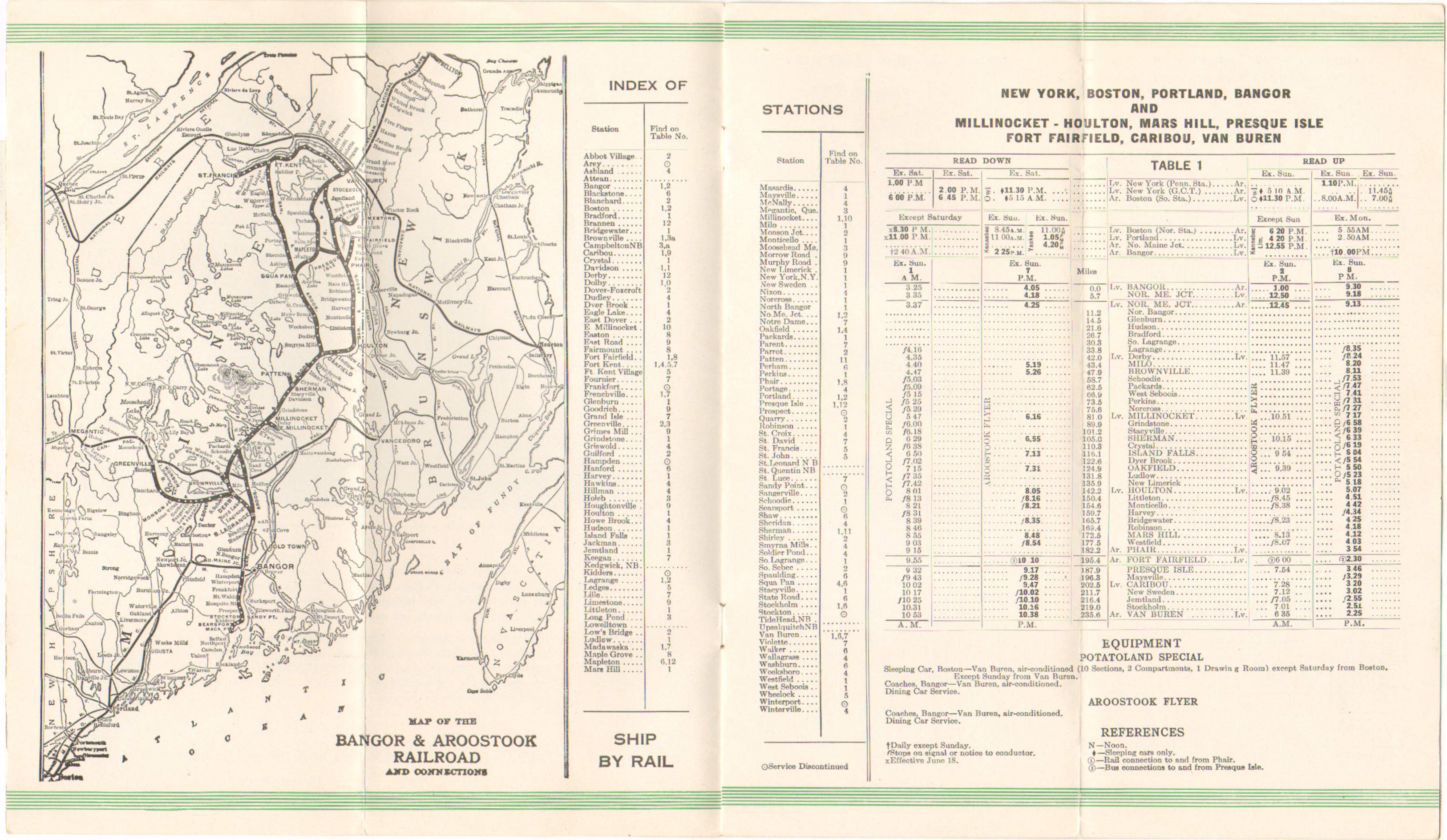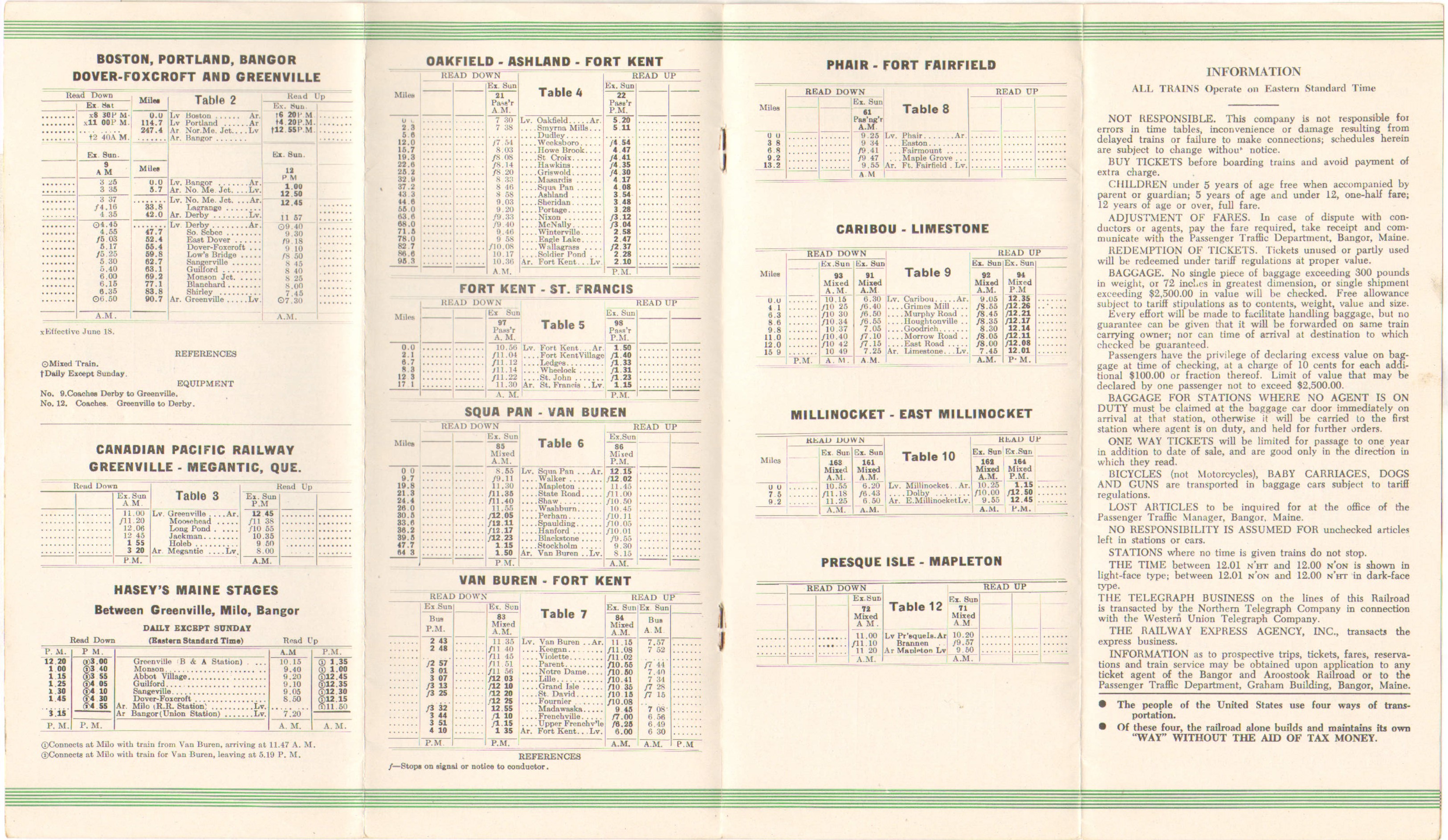 For the first time in this collection a diesel locomotive appears on the cover of a B&A timetable! These units were purchased late in 1947, making it somewhat odd that it would take this long to get them onto a timetable, being as their purchase should have been a big deal. Color scheme wise, we are back to green, the effective date remains near the top, the photo has been changed in the double inside page ad, but the text remains unaltered. On the through train page, the timing has been altered for the Maine Central connection for the Northbound Potatoland Special and passengers are being changed over in Bangor. The Flying Yankee however is still stopping at Northern Maine Junction to exchange passengers with the Northbound Aroostook Flyer. The Southbound Flyer is doing the same with the Kennebec Limited, but the Southbound Potatoland Special gets all the way to Bangor to change passengers. The Schedule seems to have been altered here as the Potatoland is now due into Bangor at 9:30 PM, earlier than previous. Trains 9 and 12 are still combined with the Northbound Potatoland and Southbound Flyer from Derby, as has been the practice for some time. However, the return trip, #12 now gets into Derby at 9:40 AM, but does not leave until 11:57. That leaves someone with over two hours to wander around the Derby station with not much to do. Train #9 will get you to Greenville at 6:00 and if you want to return, you have to be back on the train at 7:30, AM. An hour and a half is not a lot of time to do much. One presumes not many went up and back in the same day if they had any form of business to conduct, or at least not by the train. Hasey's Maine Stages (long since a bus service in all but name) did offer two round trips to Bangor and that information is included in the B&A timetable. The bus service around Sherman - the first bus service the B&A even experimented with back in 1936 - is no longer in the rail side of the timetable. We find it in the Bus section - but unlike the last timetable, Houlton is not mentioned. It is only running between Patten, Sherman and Island Falls. This remains a local service, connecting with two trains at Sherman Station. Elsewhere, no major changes seem to have occurred.