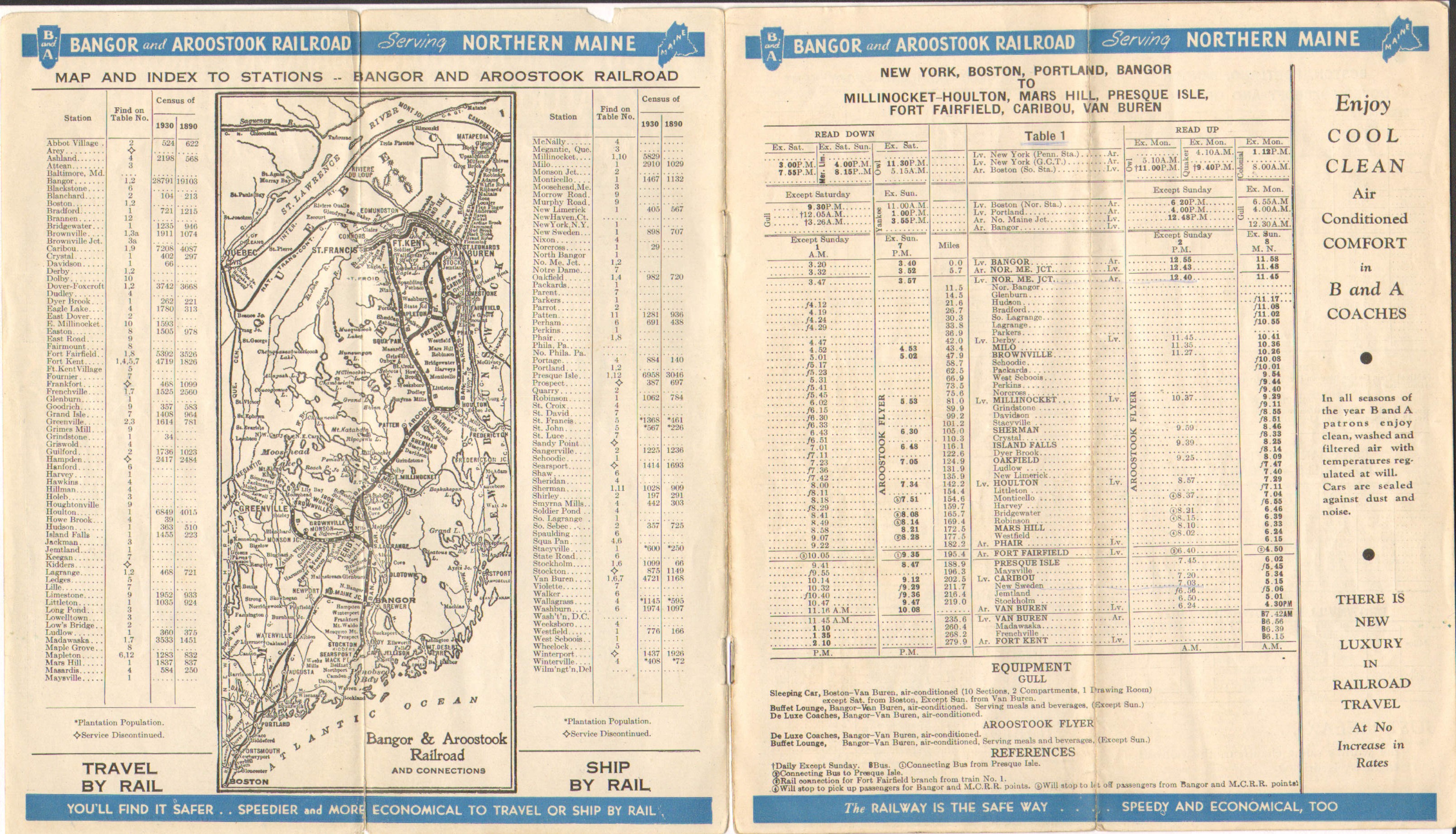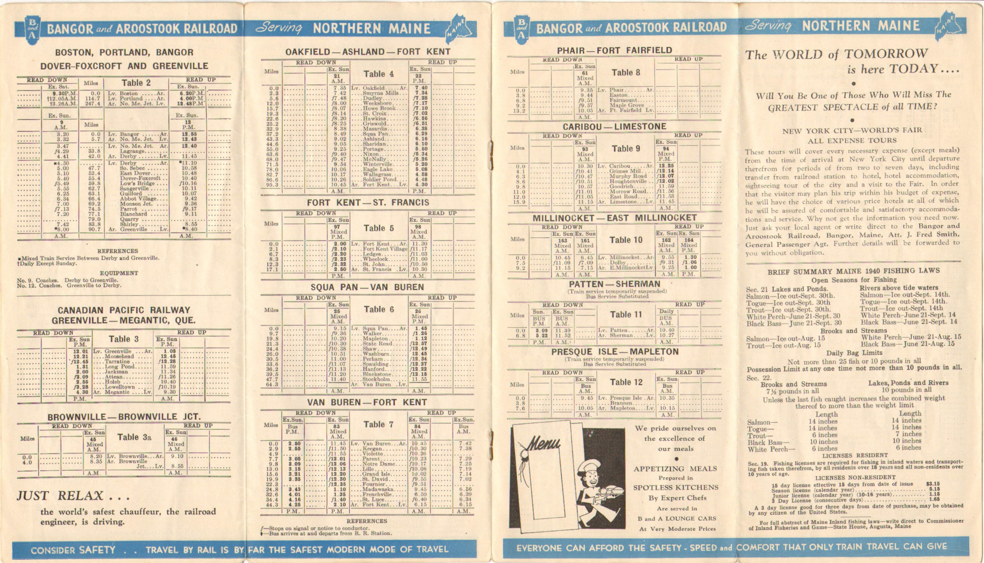 A bit less than two months after the last timetable in this collection, as one would expect, not a whole lot has changed. There is now an advertisement promoting 'All Expense Tours' of the New York World's Fair and the bus service is now taking you from Millinocket to Bangor via Enfield, commencing June 28th. That will change the schedule for other stops as well. The color scheme is still the same, as is the Maine Woods Adventure double page advertisement.