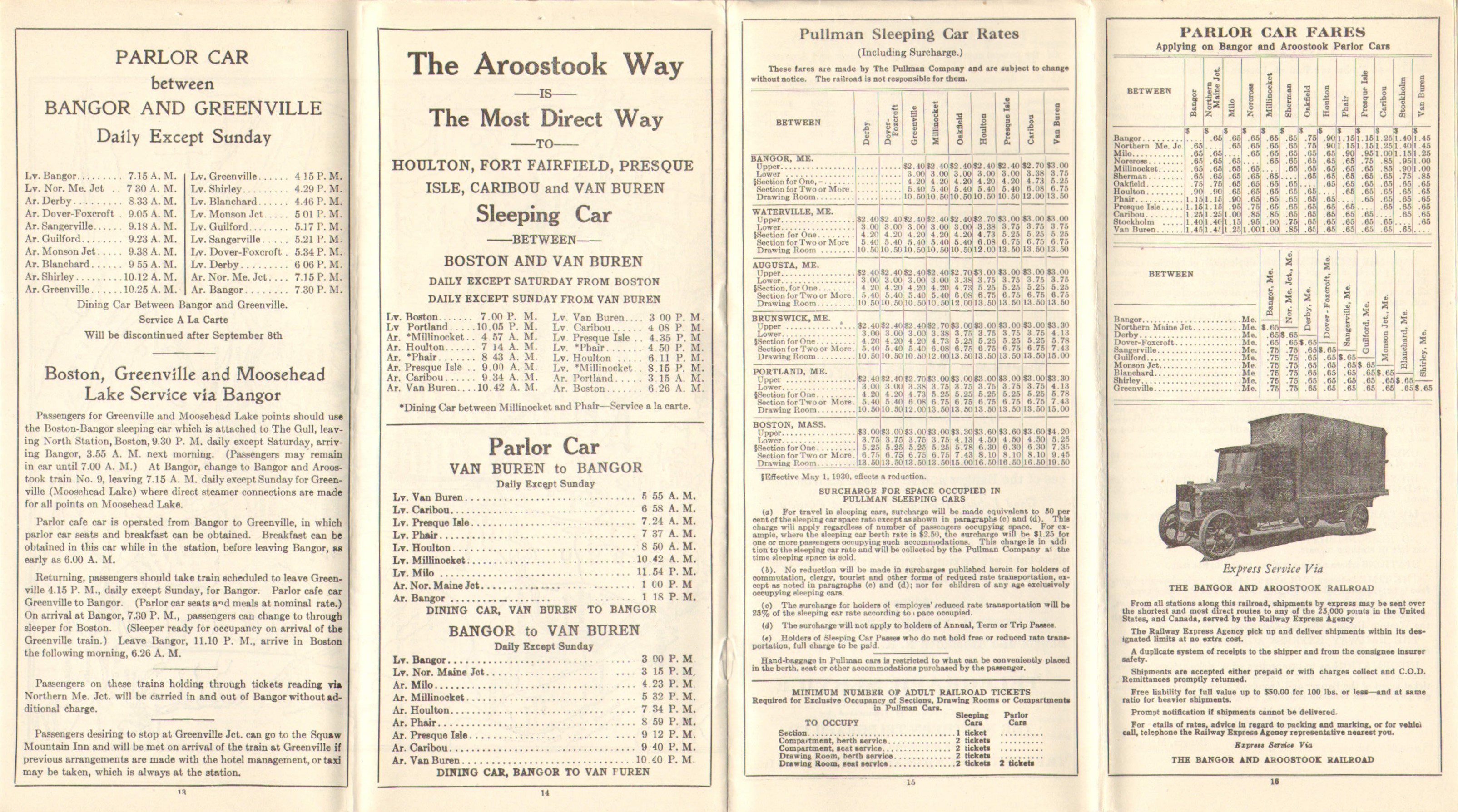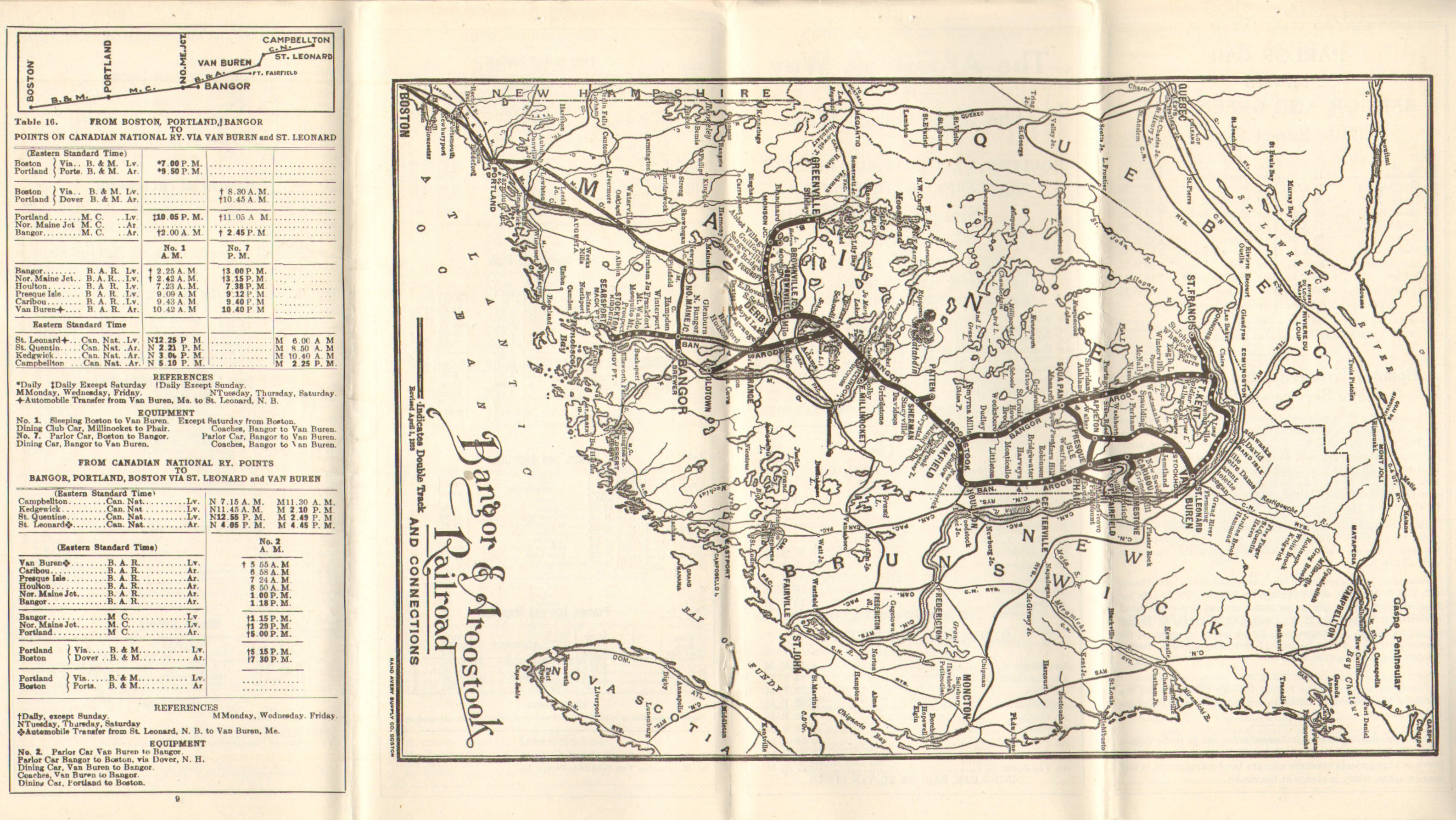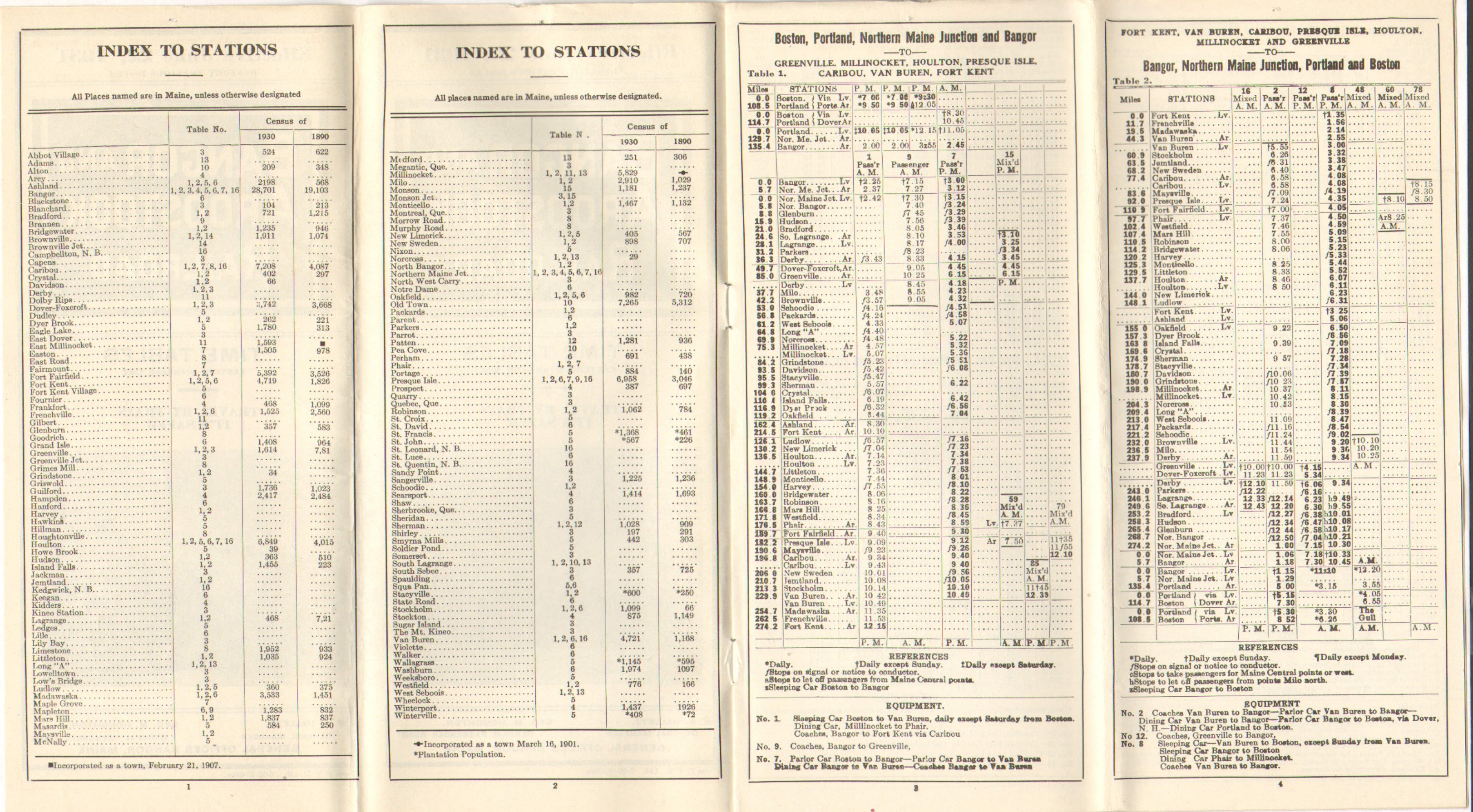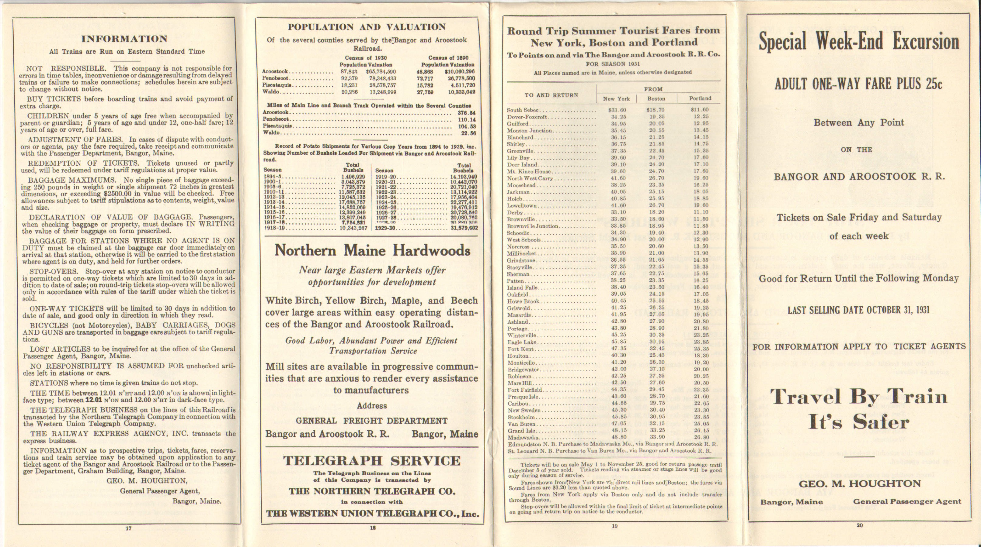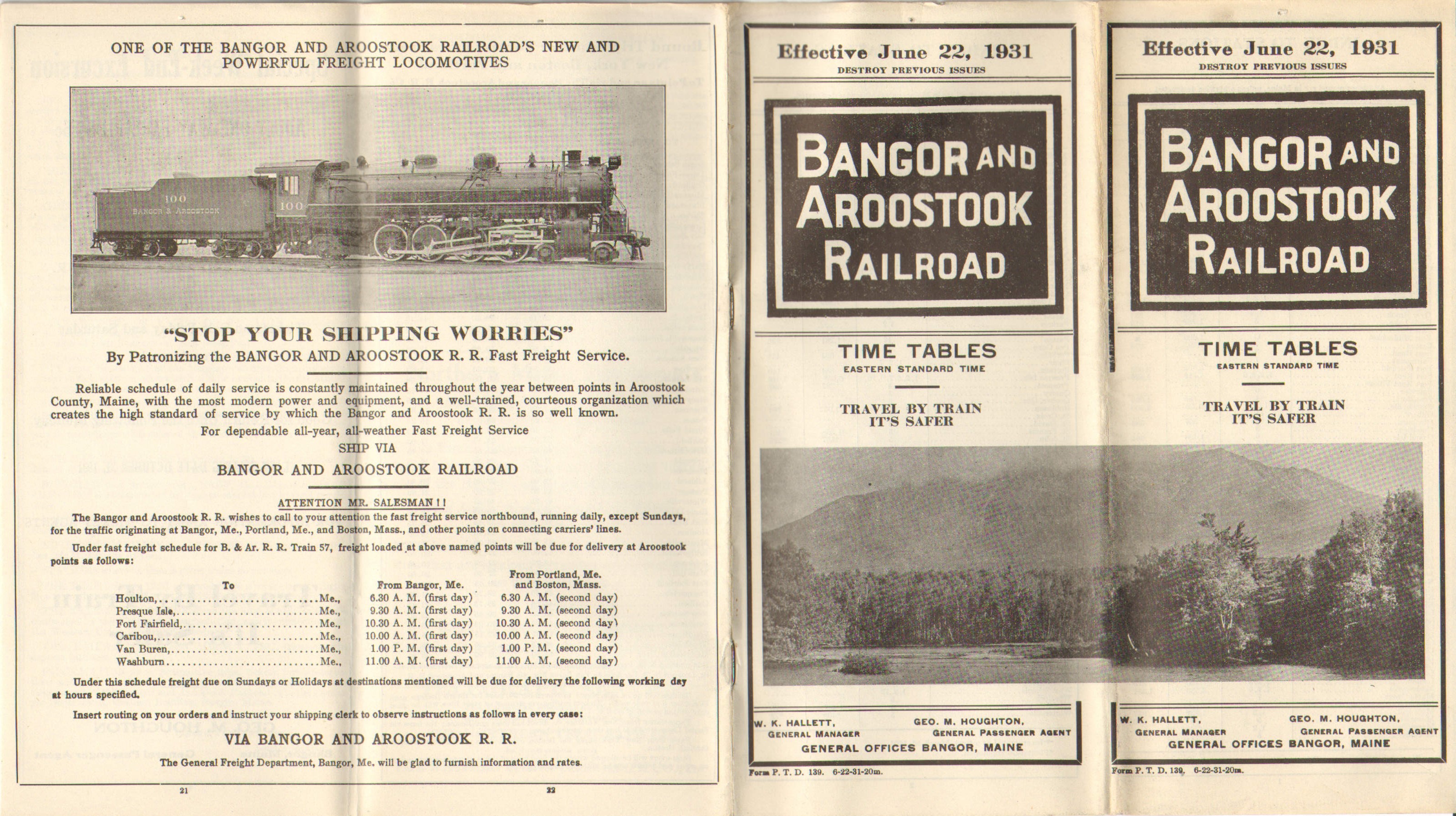 "Travel By Train It's Safer" a bold statement although probably accurate in 1931. This timetable returns to a view of Katahdin across the front covers, promoting Maine without having to say anything. The now familiar Fast Freight advertisement remains on the inside double page. For the second timetable in this collection, the two page Index to Stations remains. Service on the Old Town branch remains the same and the Medford Cutoff table remains blank. Excursions and tourist fares from outside the state continue to be pushed but very little has changed from the last timetable in the collection.