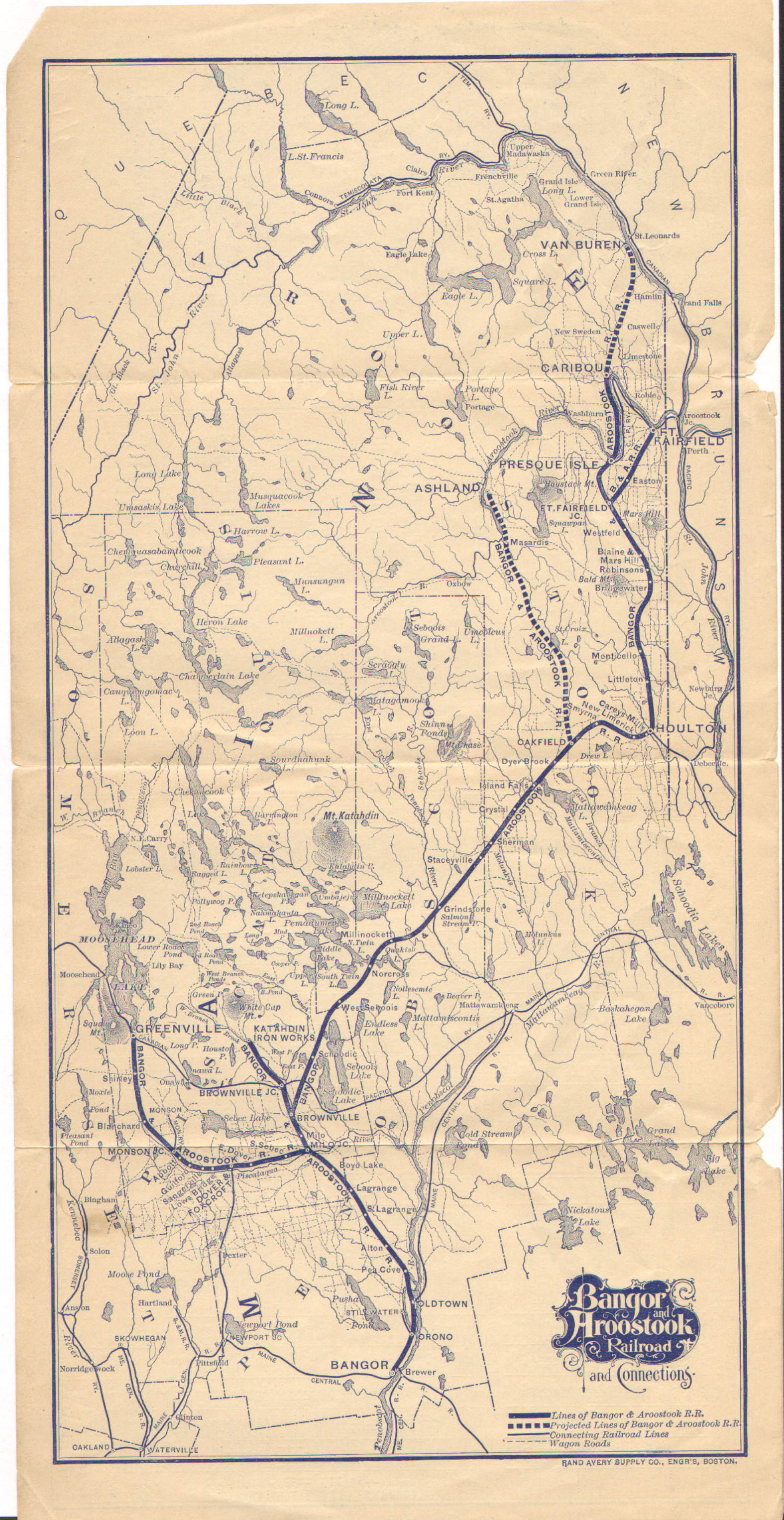 This is the earliest timetable in this collection to show trains running from Bangor. Also the largest map, being the entire back side of the quad-fold timetable. We are not seeing the 'B&A' but the full name of the railroad. Hunting and fishing are being promoted, a staple of B&A passenger train marketing for decades.