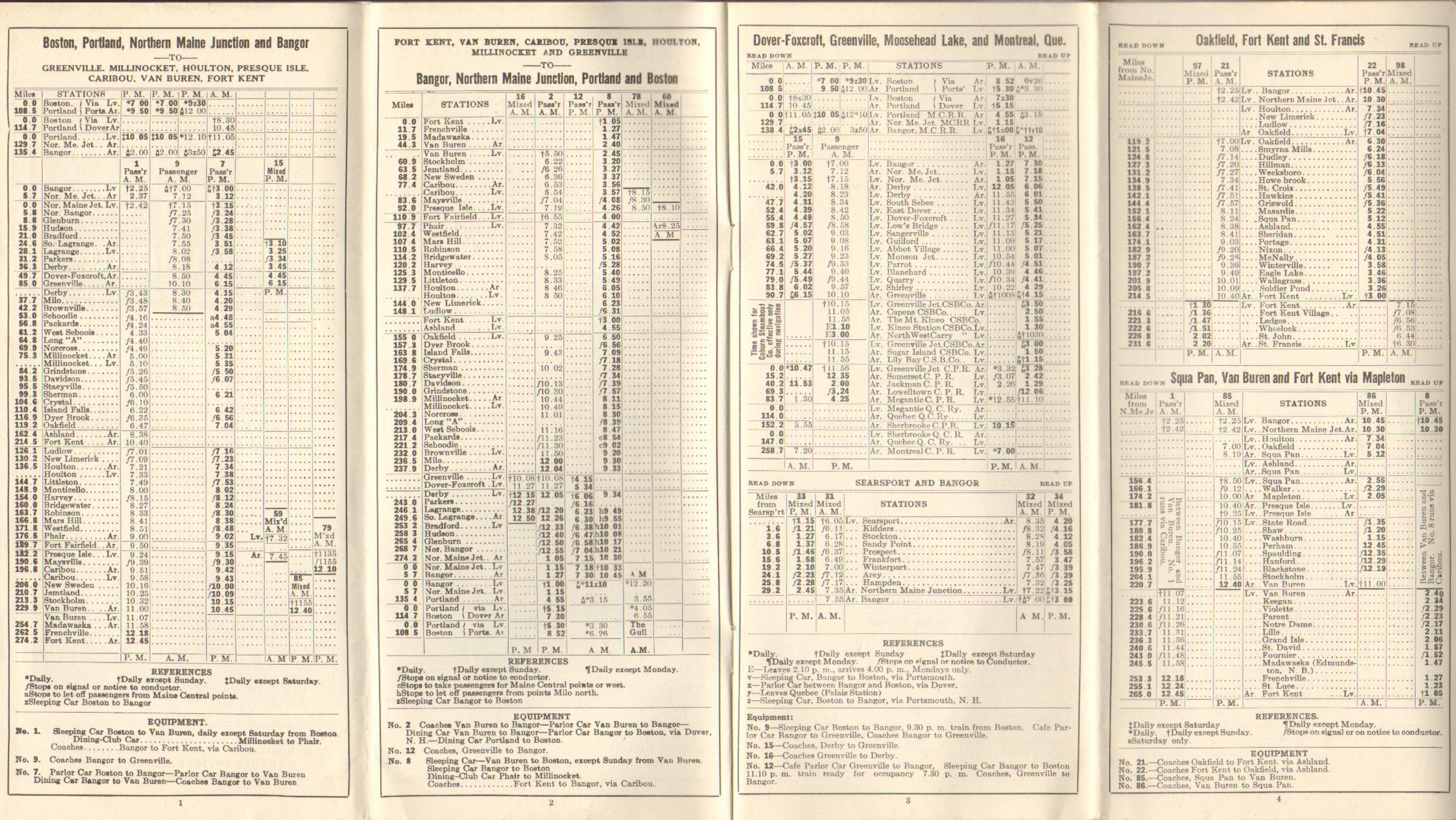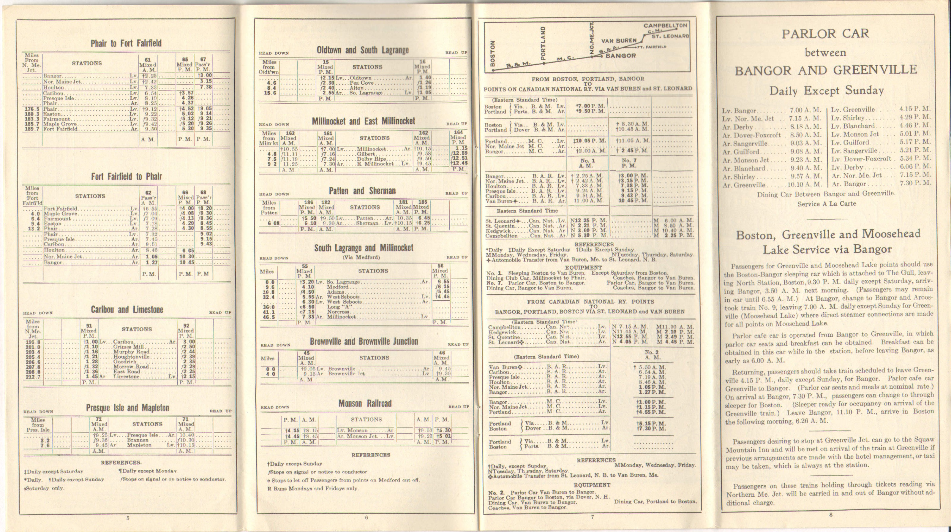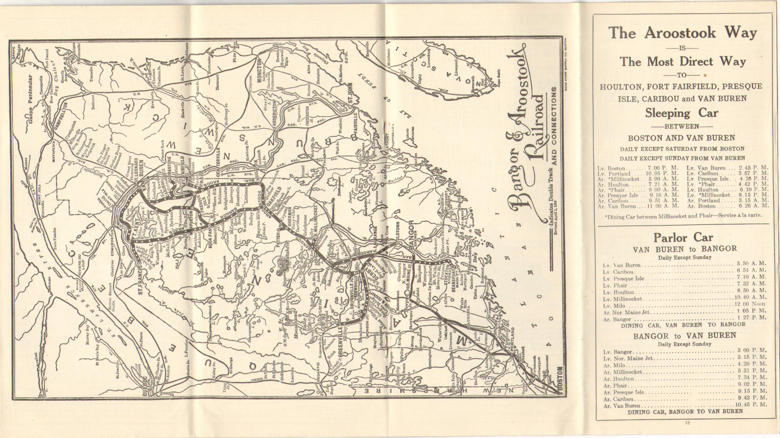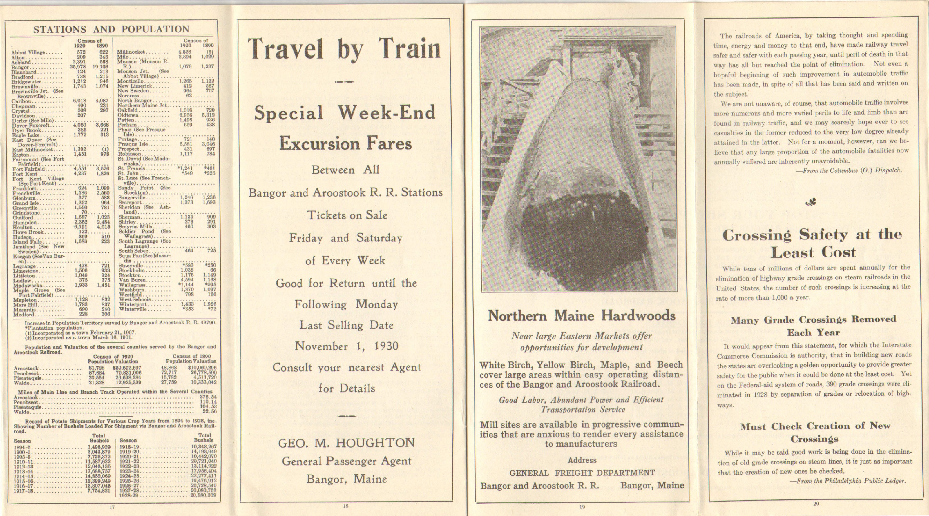 "STOP YOUR SHIPPING WORRIES" the two page inside spread features the same photo of 100 we saw earlier, but this time, its being used to promote the Fast Freight service advertised by the railroad. Two day service from Boston or Portland to almost any Aroostook County destination. The two covers have an image of Mount Katahdin on them and a promotion for special Weekend, Friday to Monday, round trip fares is in the back, along with Northern Maine Hardwoods for sale and some promotional literature about crossing safety.