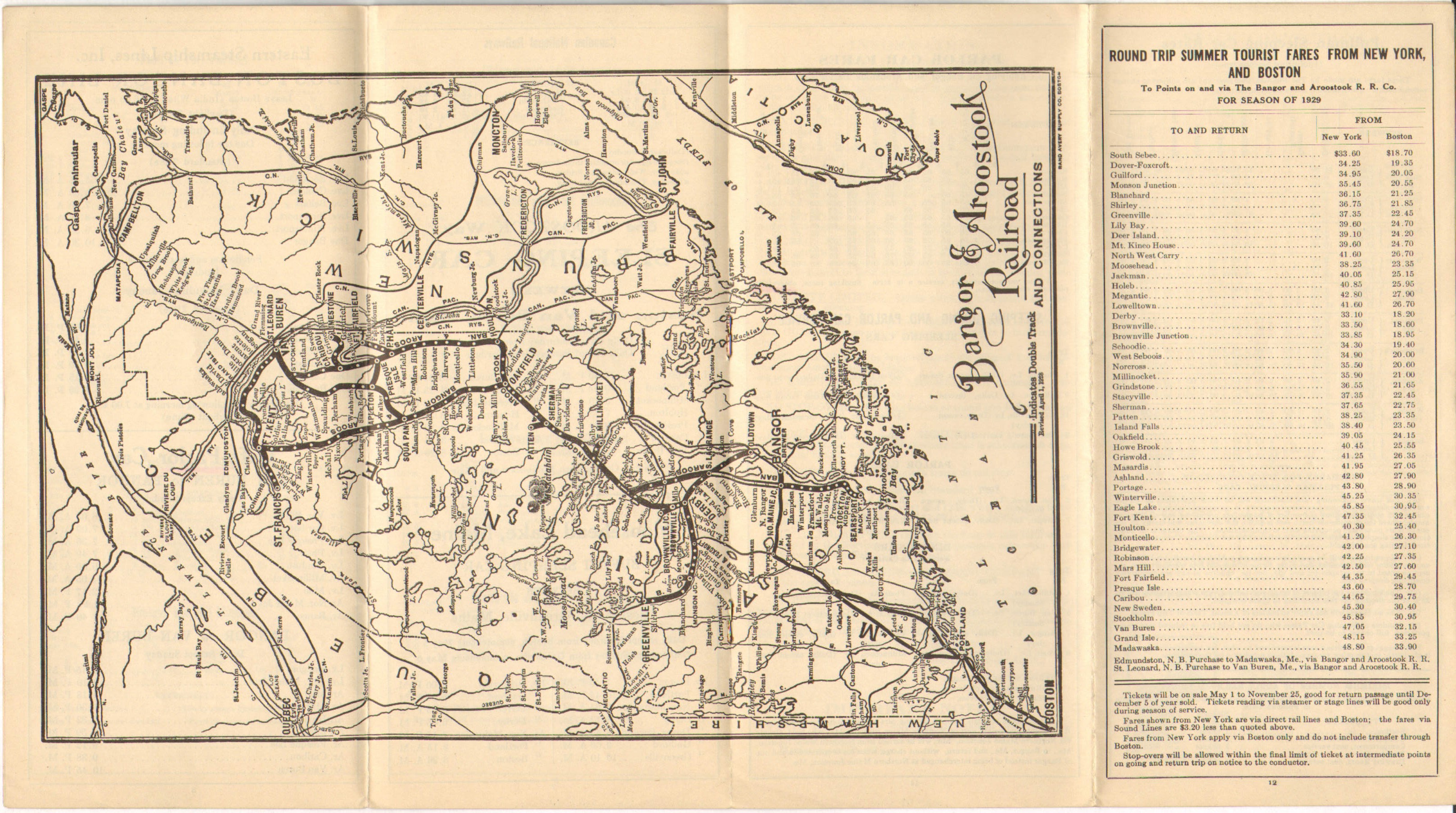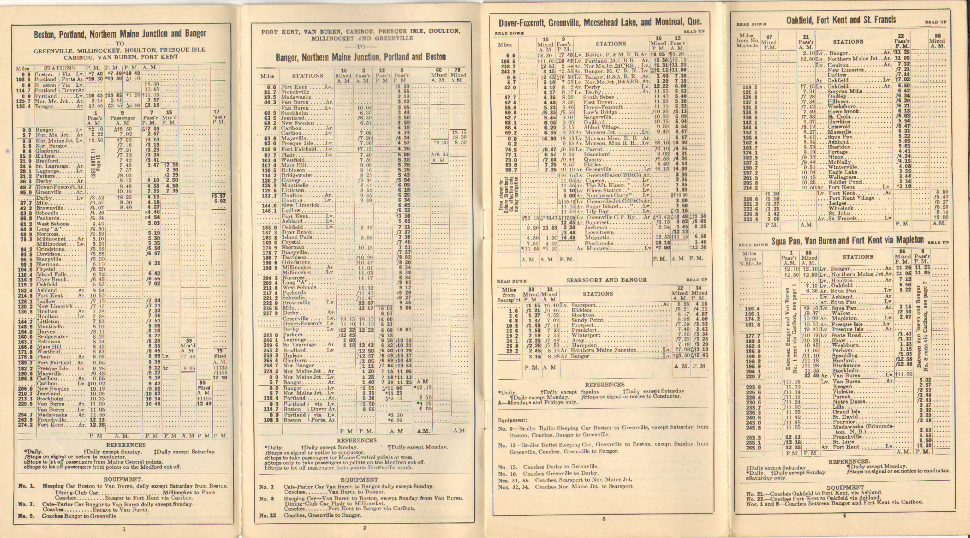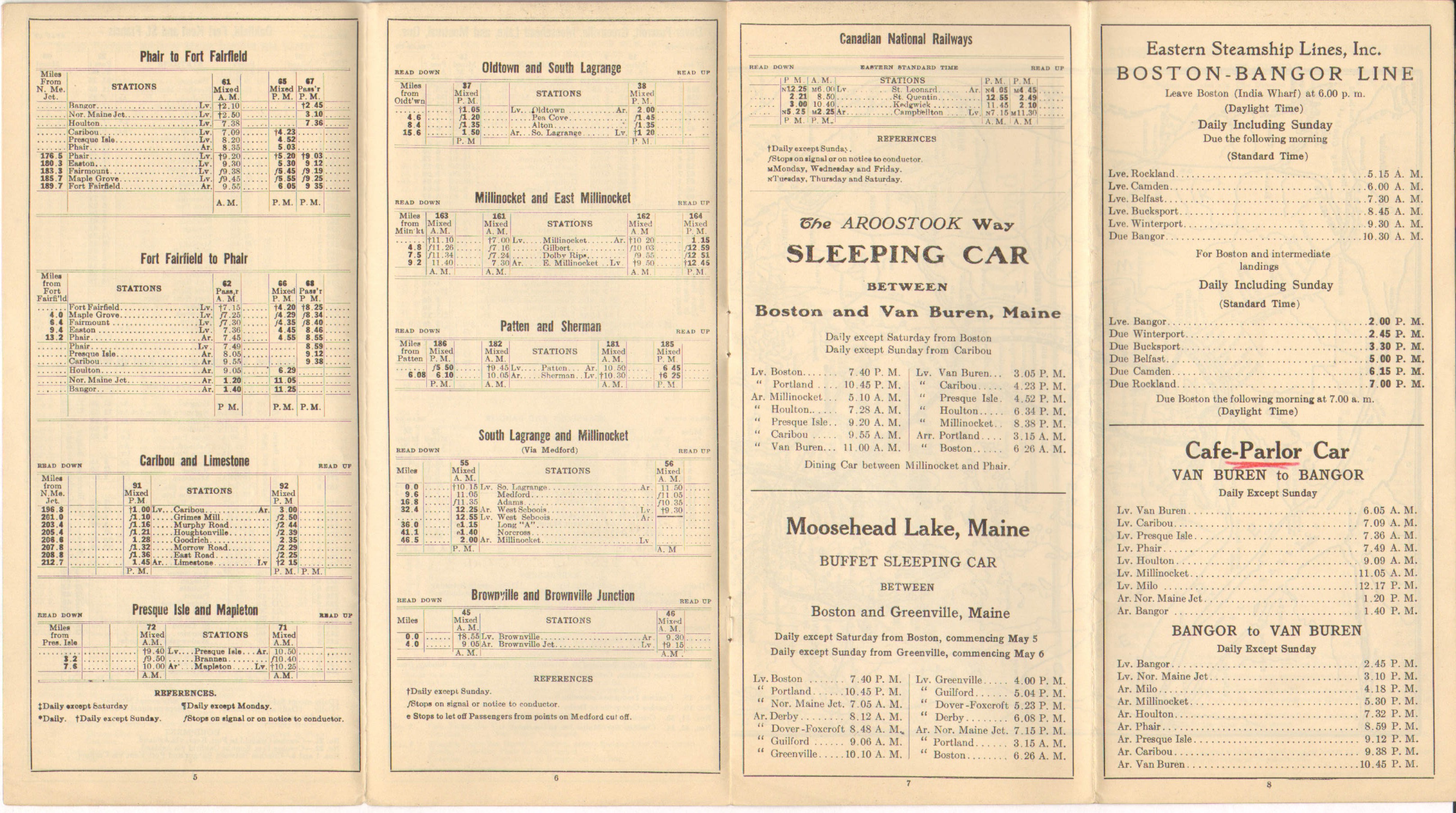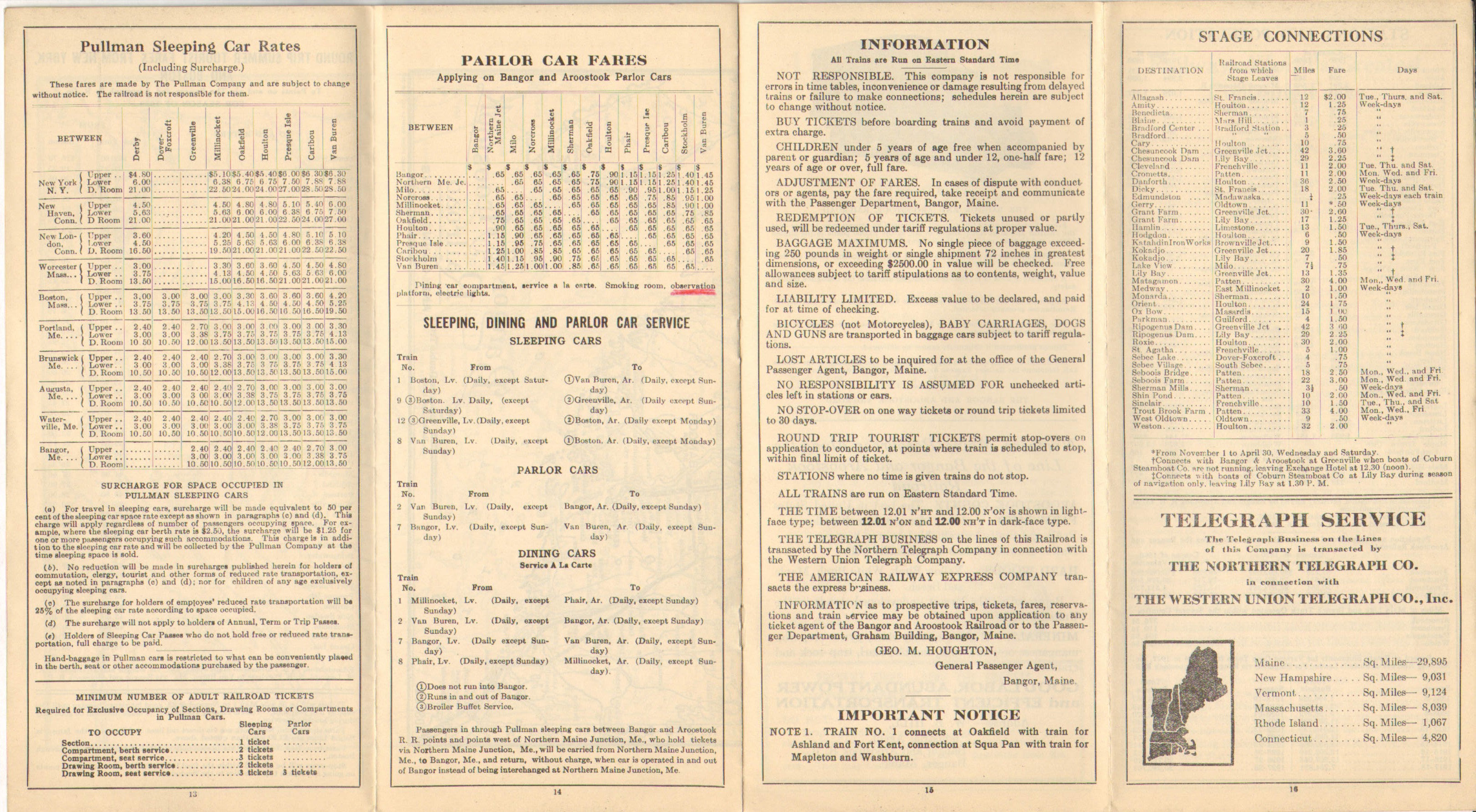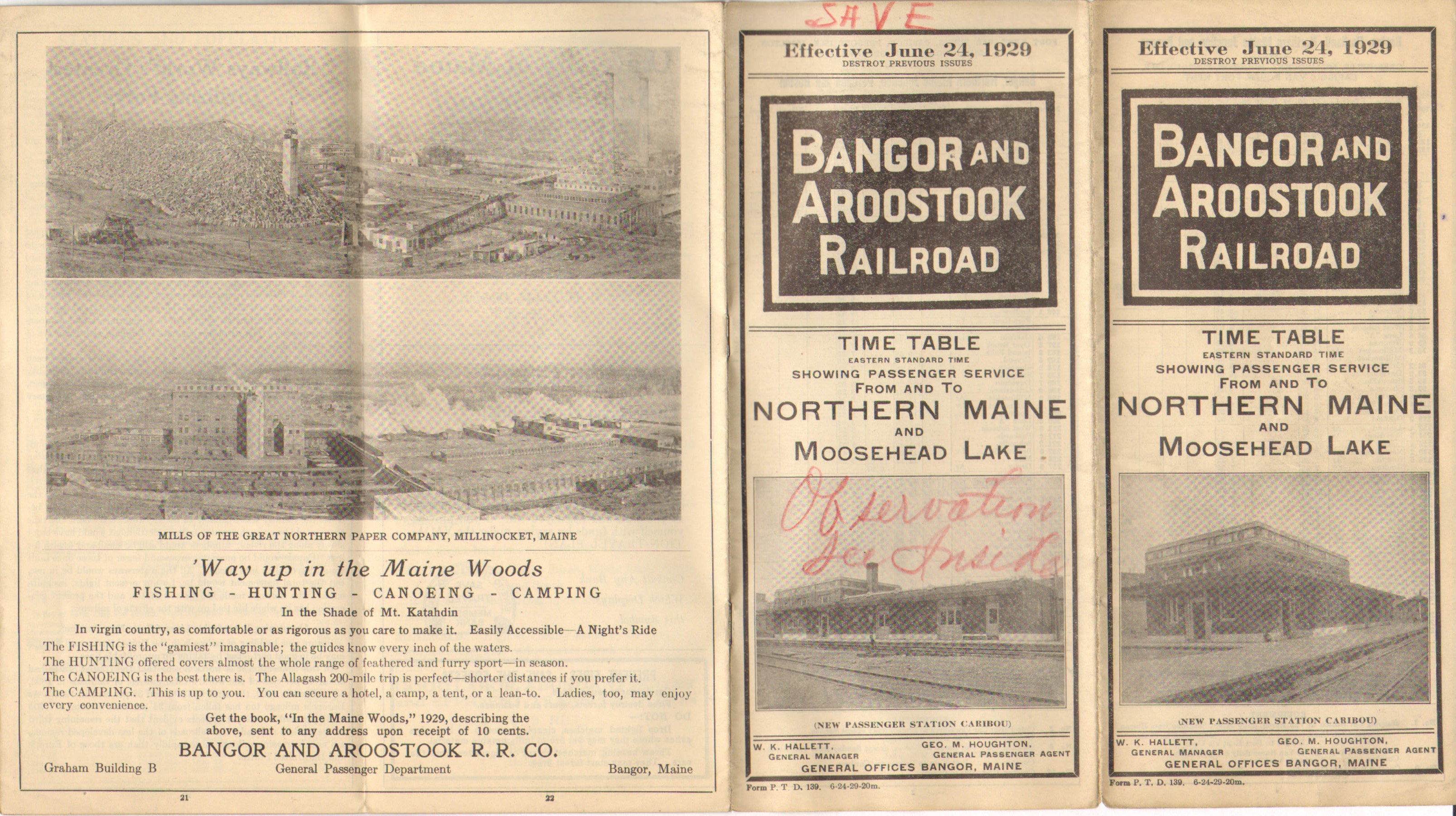 Continuing the format we have seen in the last few timetables, the photos on the cover this time are of the Caribou station and the double page contains two depictions of the Great Northern Paper Company. Whomever owned this timetable at some point was particularly interested in the Cafe-Parlor car and the observation platform of the same, based on the red underlining. Tourist fares are still being pushed and very little has changed from the previous timetable.