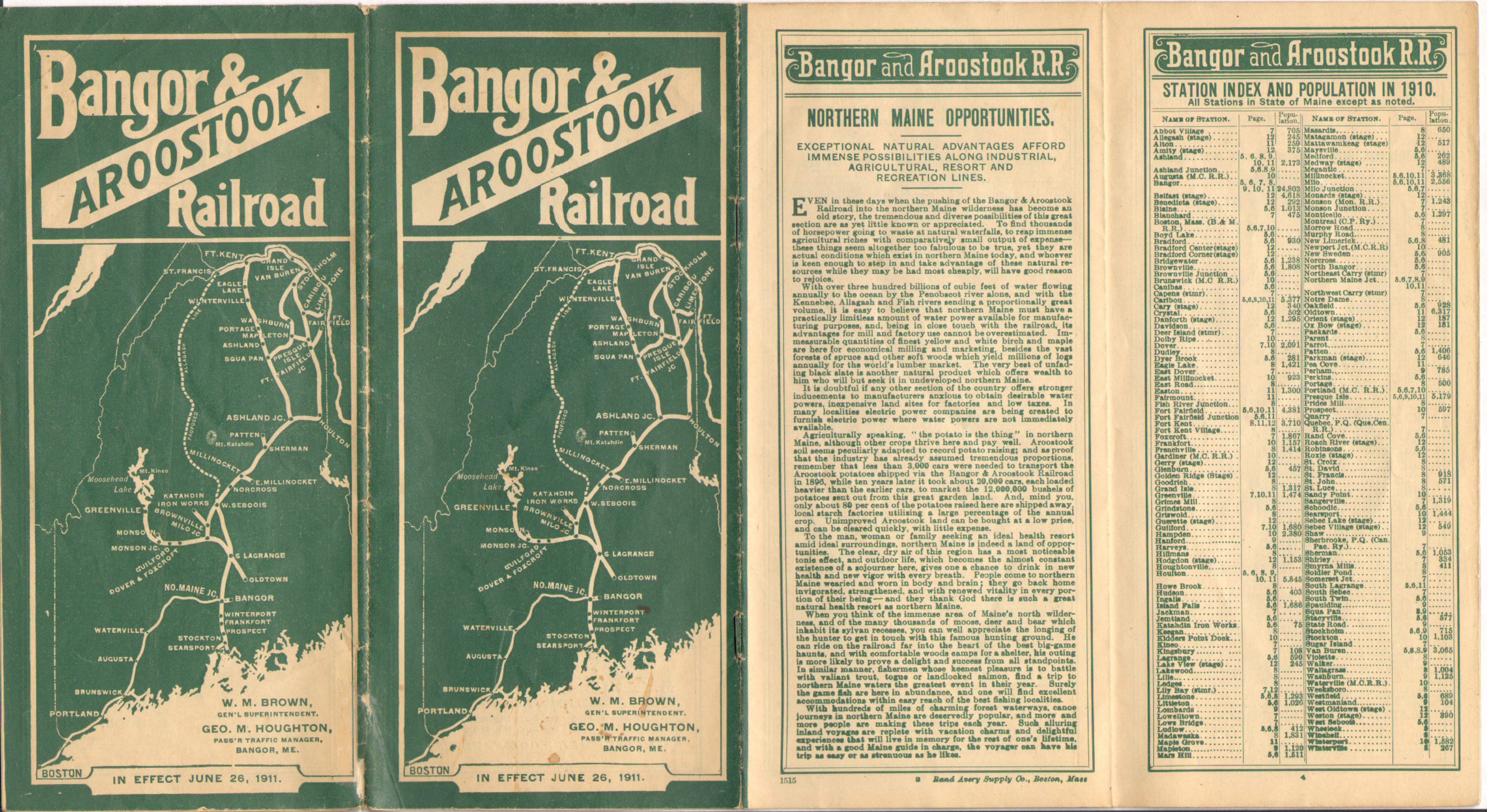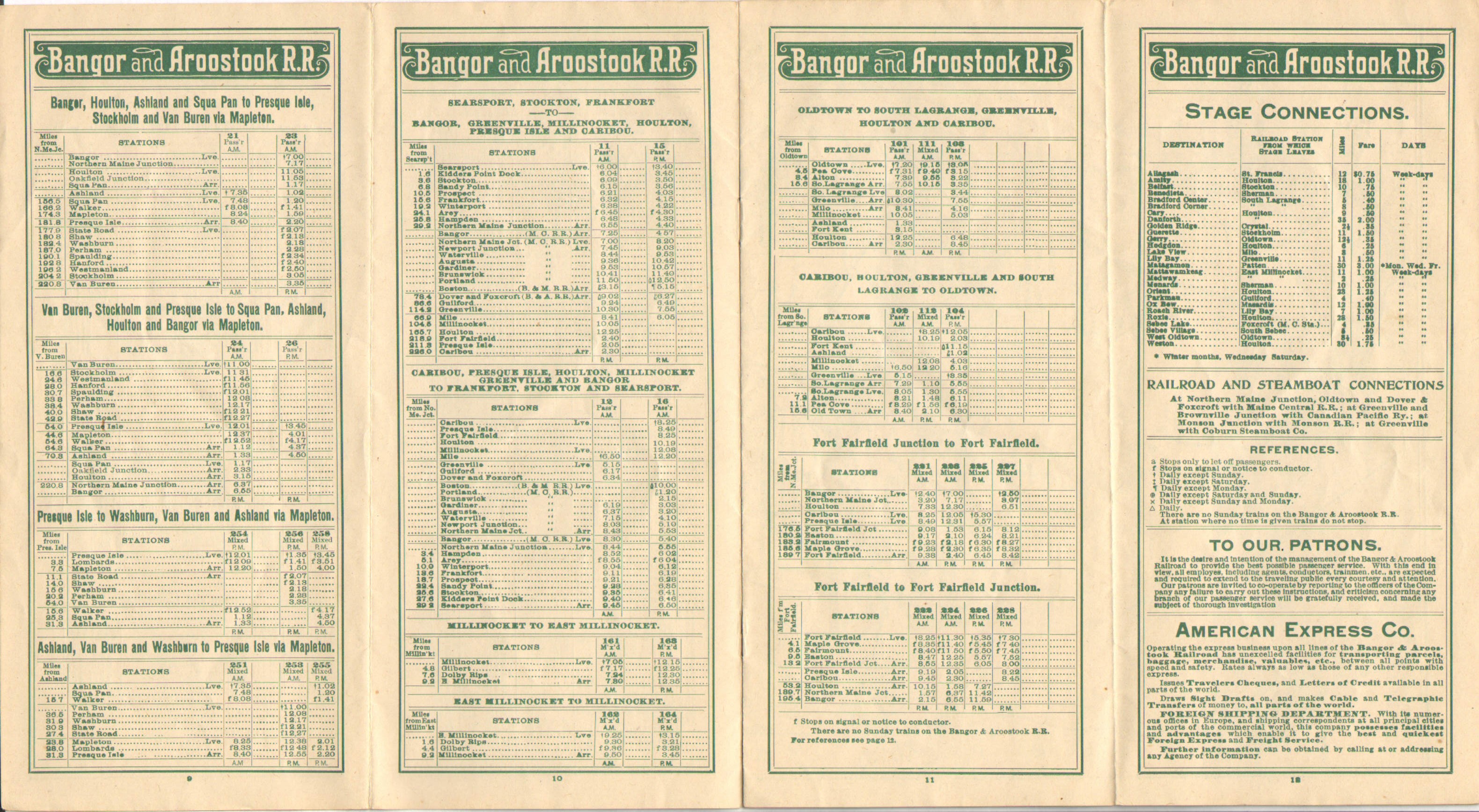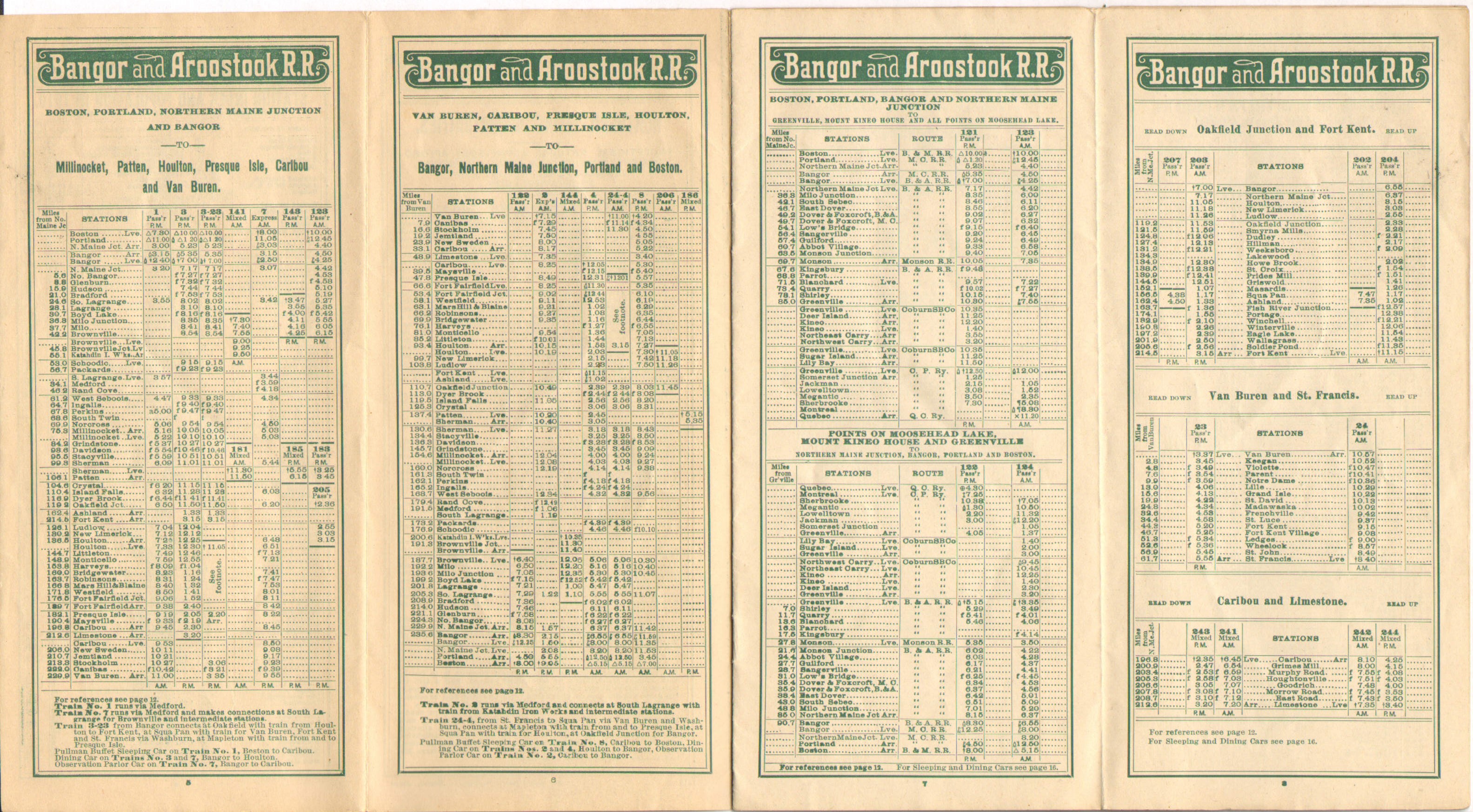 As one would expect, there are not a huge number of differences between the previous Timetable, late in 1910 and this one mid 1911. Although not changed on the map, in the timetable listing, 'Ashland Junction' has been replaced with 'Oakfield Junction'. It appears even in a slightly different font - indicating a change. This would of course later be known simply as Oakfield, a yard which continues to exist to this day. Map wise, we are still promoting the 'Allagash Line' that would never be built.