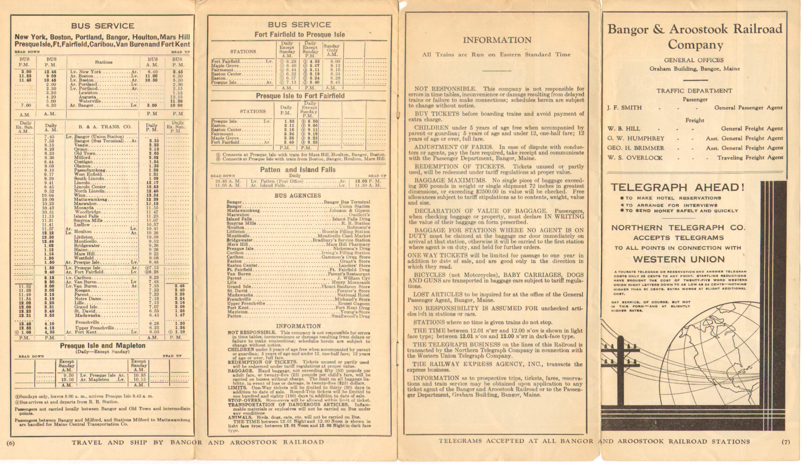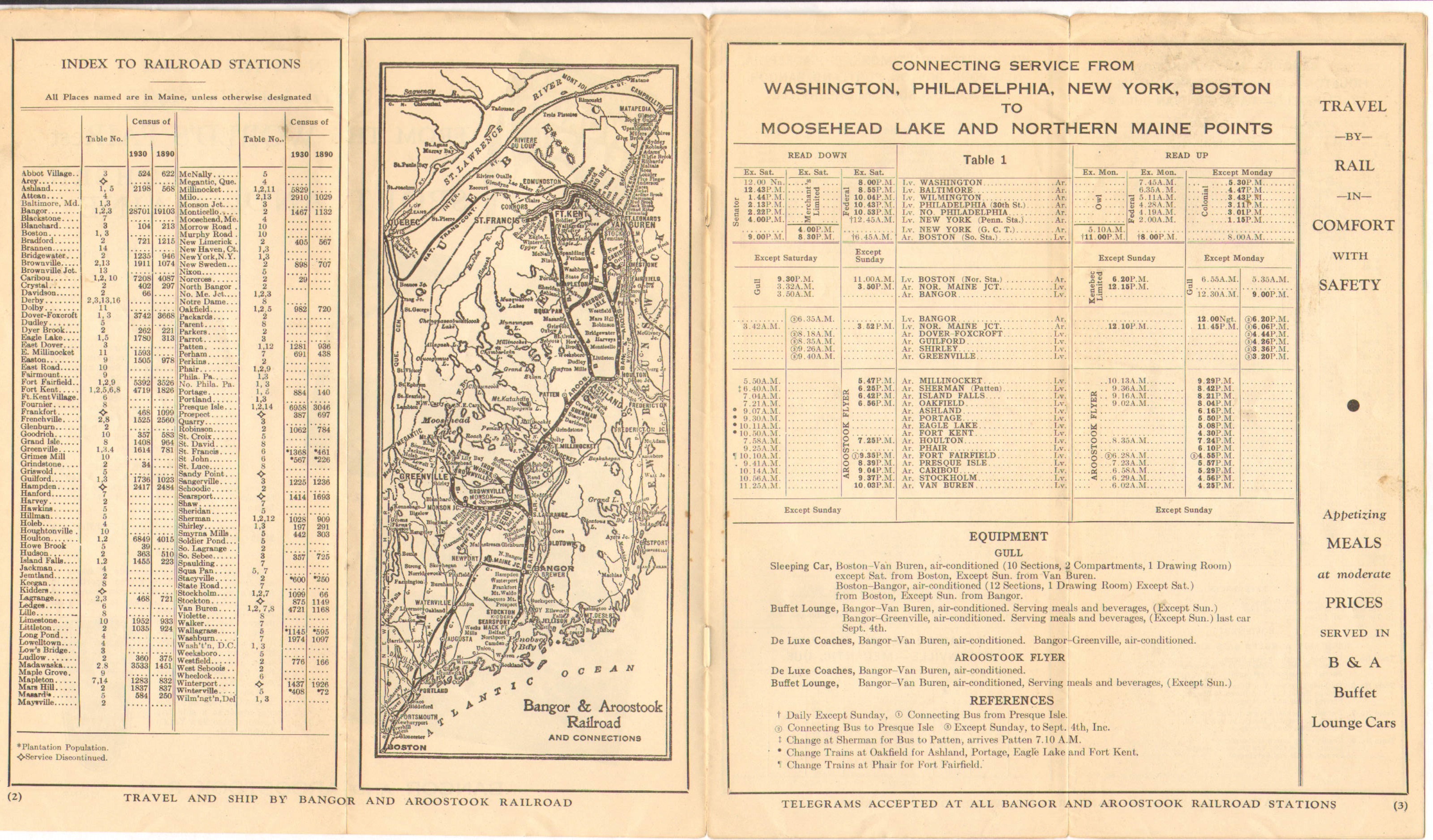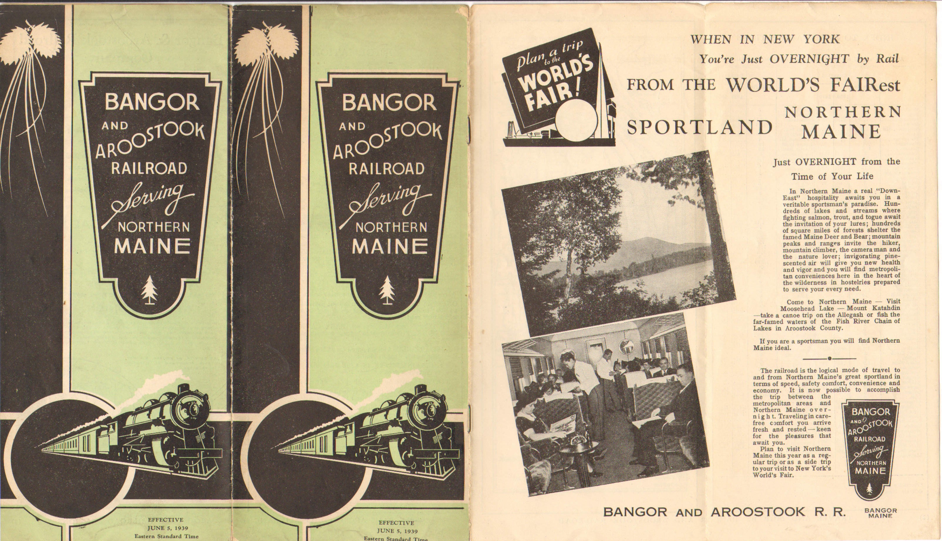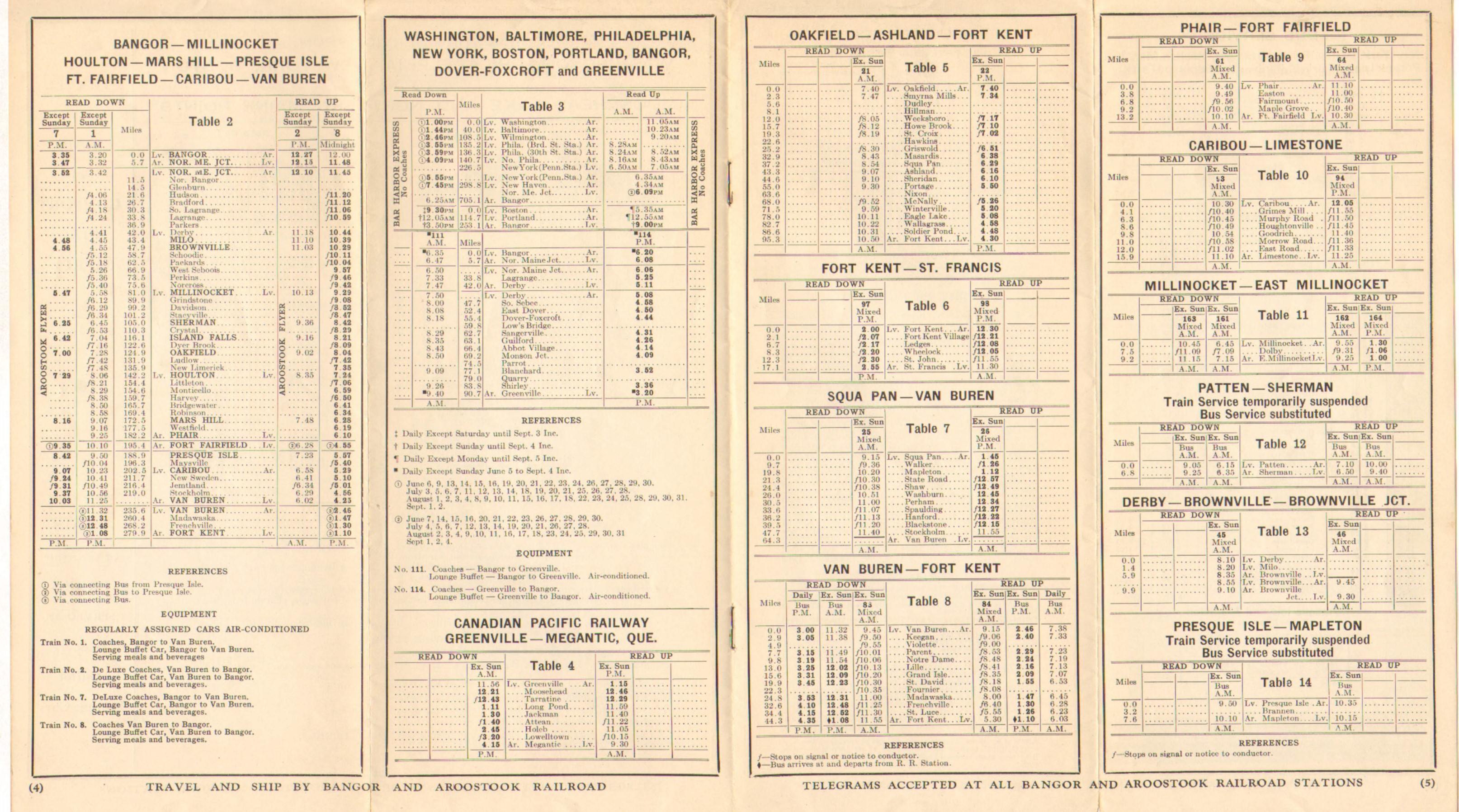 "When in New York you're just OVERNIGHT by Rail from the World's FAIRest Sportland Northern Maine" If we forgive the capitalization and horrible grammar - this Timetable is clearly aimed at pulling people in from New York, presumably those attending the World's Fair. Page 3 of this timetable has been heavily re-worked from the previous edition, showing connections and destinations along with train names for destinations as far away as Washington D.C. Pages 4 and 5 have been re-done and the information is now more clearly laid out. Destination stations are listed only once, with the directions either read up or down depending on which way one is going. All bus references have been removed - except for Patten - Sherman and Presque Isle - Mapleton because trains have been suspended there and buses have replaced them. Aside from this, the bus services are only listed on the Bus Service page.