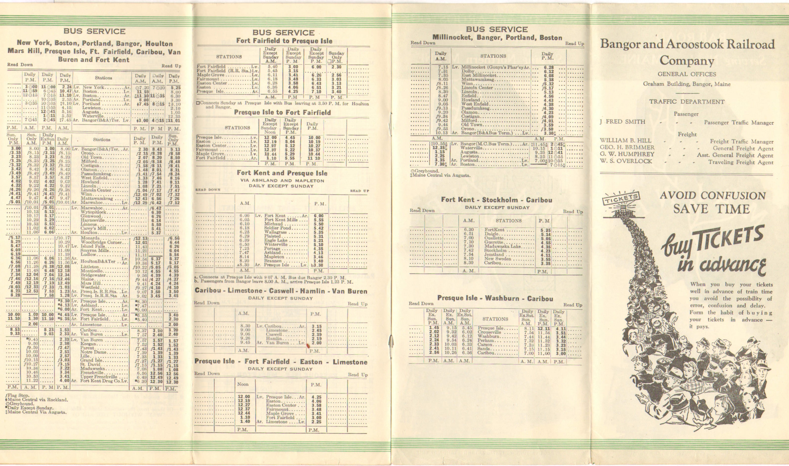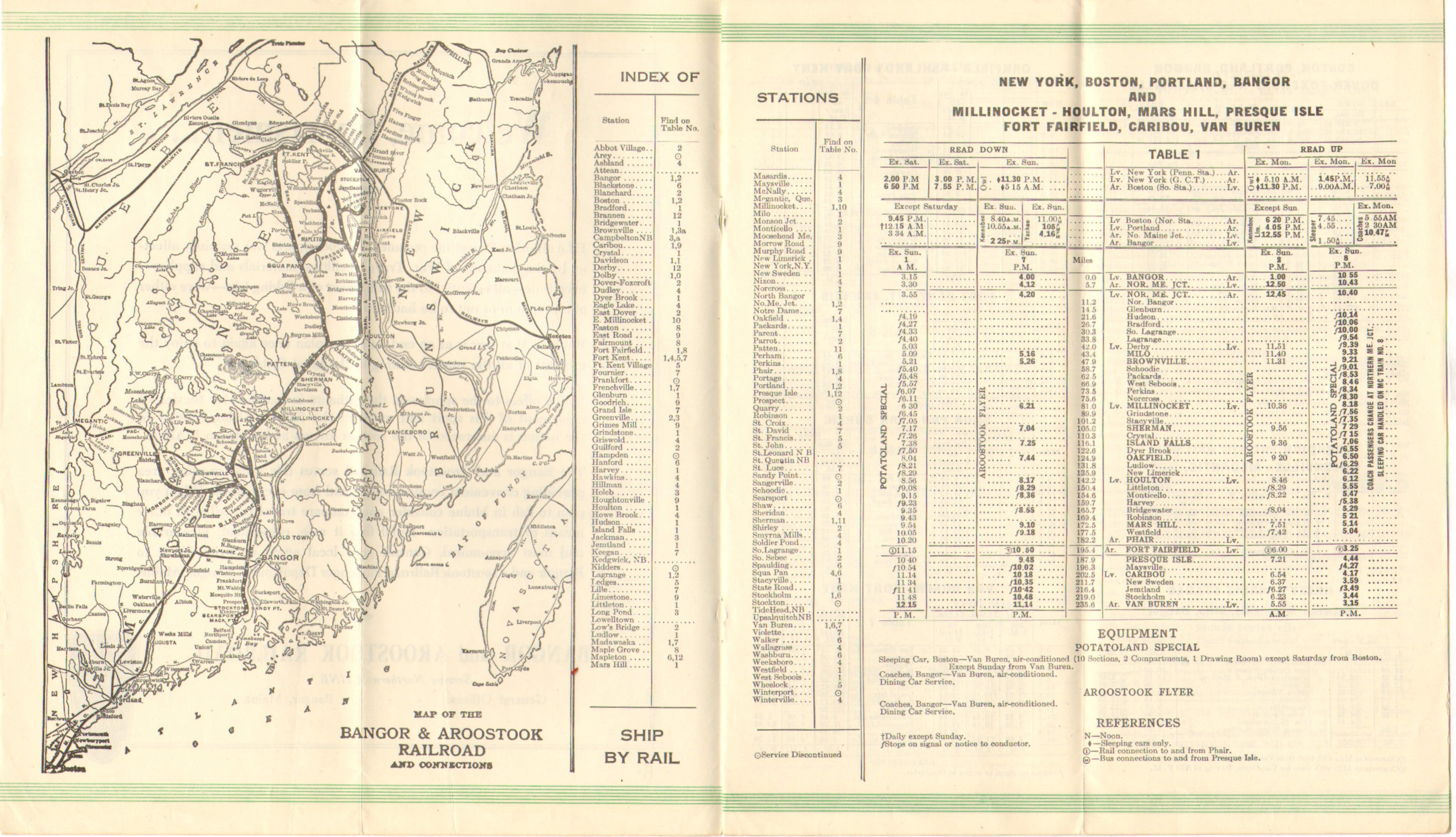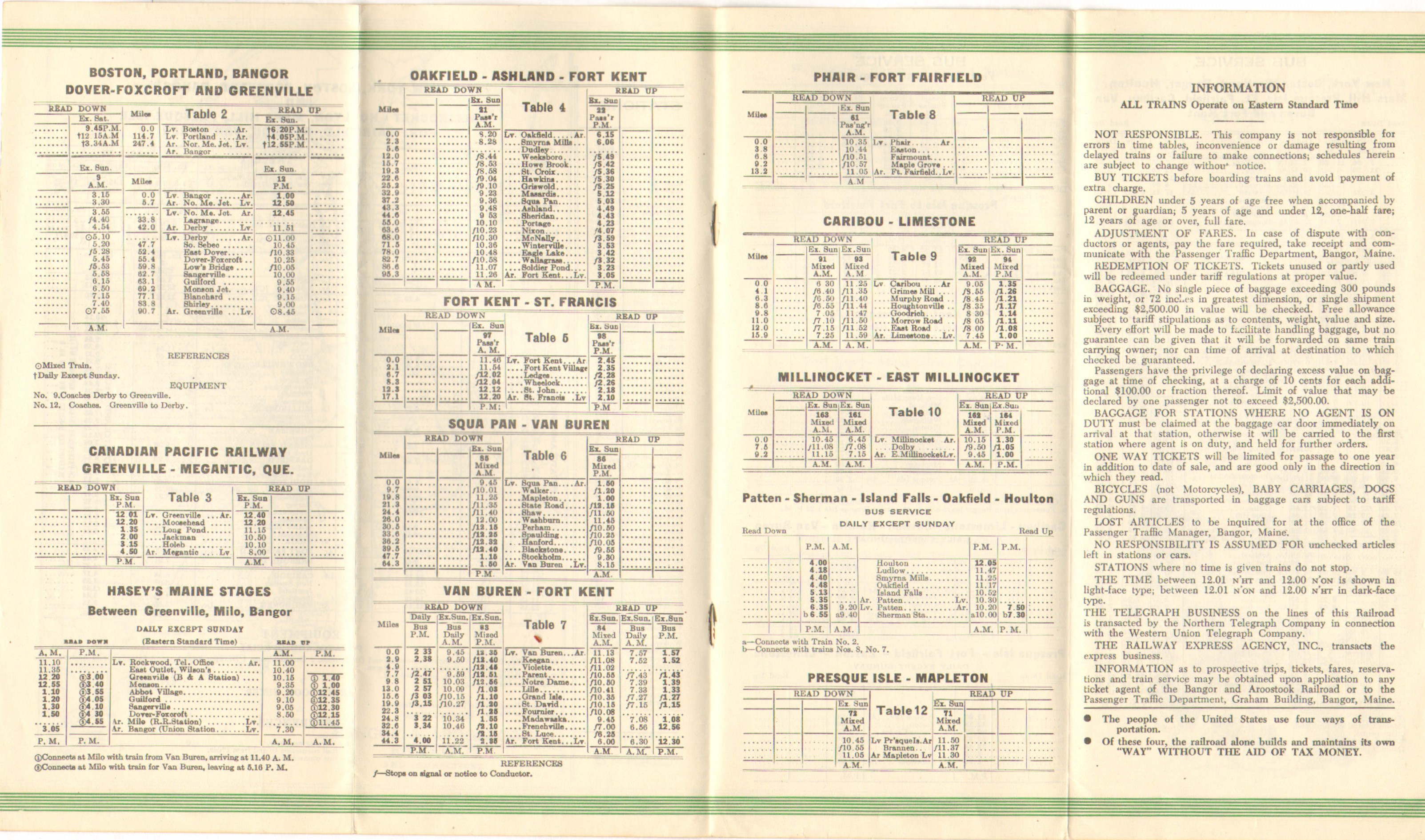 Compared to the last timetable, the inside double cover ad and color scheme have not changed. On the Through Train page, the timetable now explicitly mentions that Southbound Potatoland Special coach passengers WILL change trains at Northern Maine Junction. No longer an option apparently. The bus service between Patten, Sherman and Island Falls has been expanded. It now comprises of Patten - Sherman - Island Falls - Oakfield and Houlton. This service is still listed under the rail section, despite being a bus only service for years. Speaking of buses - services continue to be changed to provide better service. Services across the board have been changed - towns added and in some cases the daily-except-Sunday has gone to a daily service.