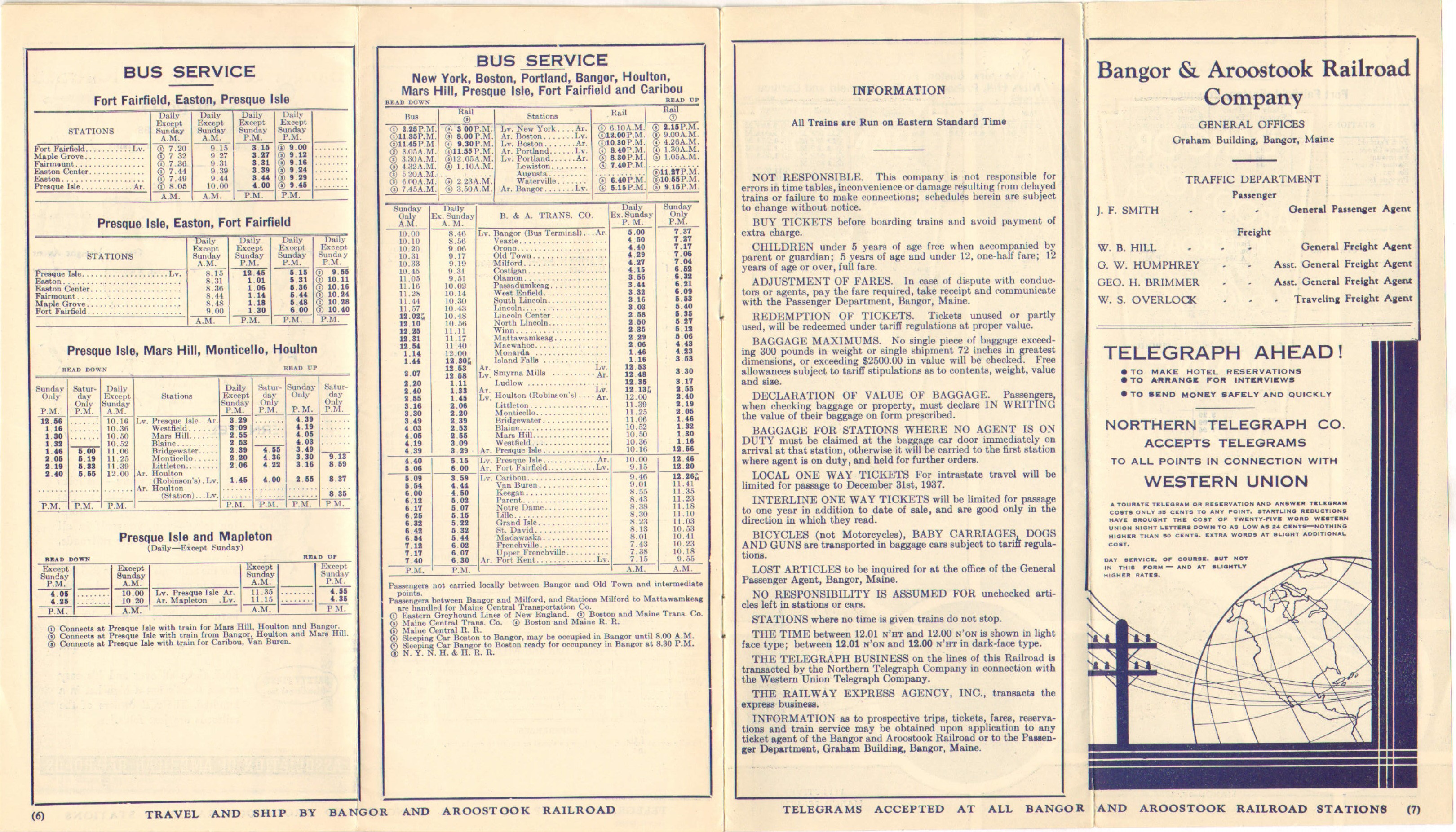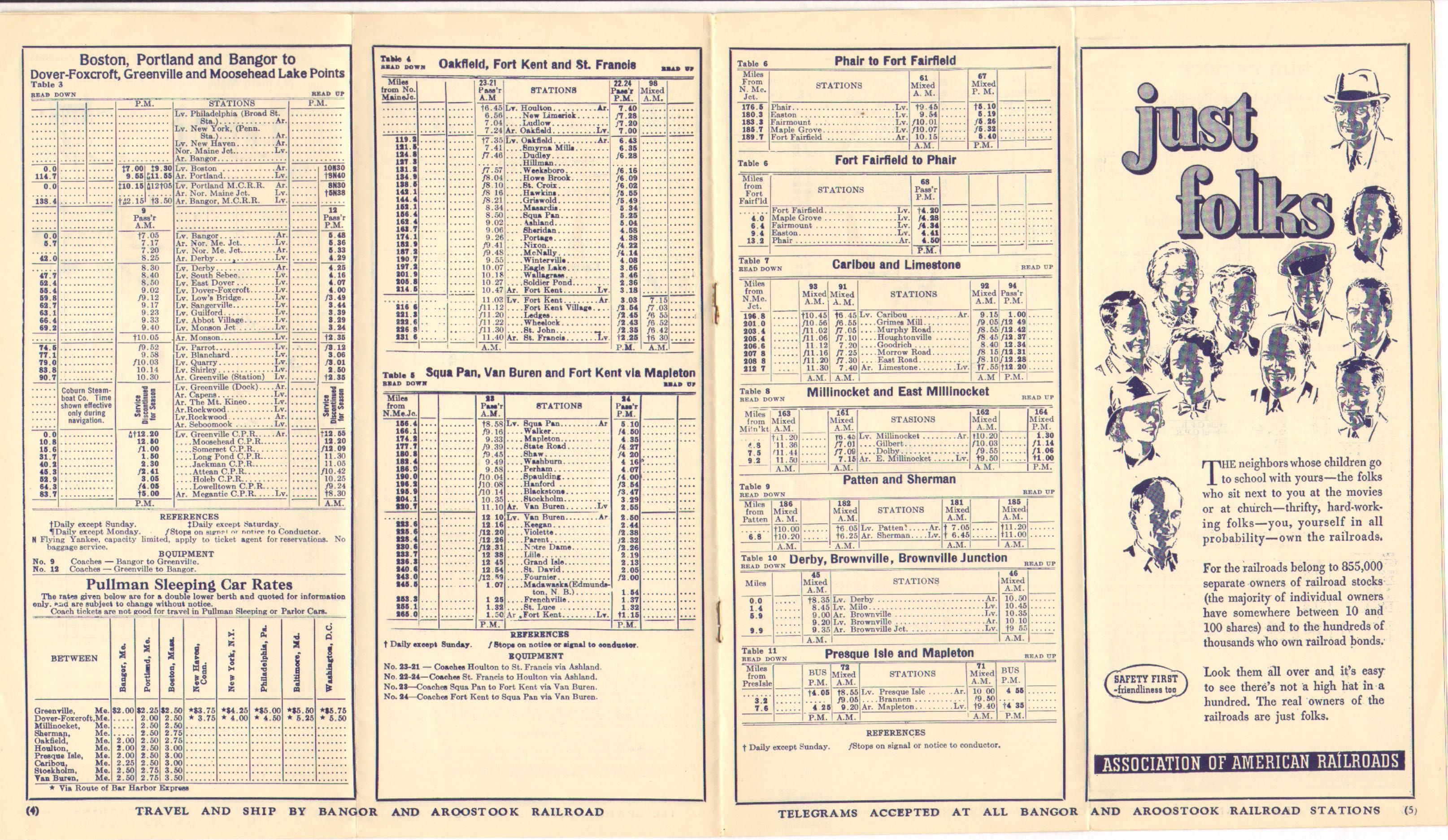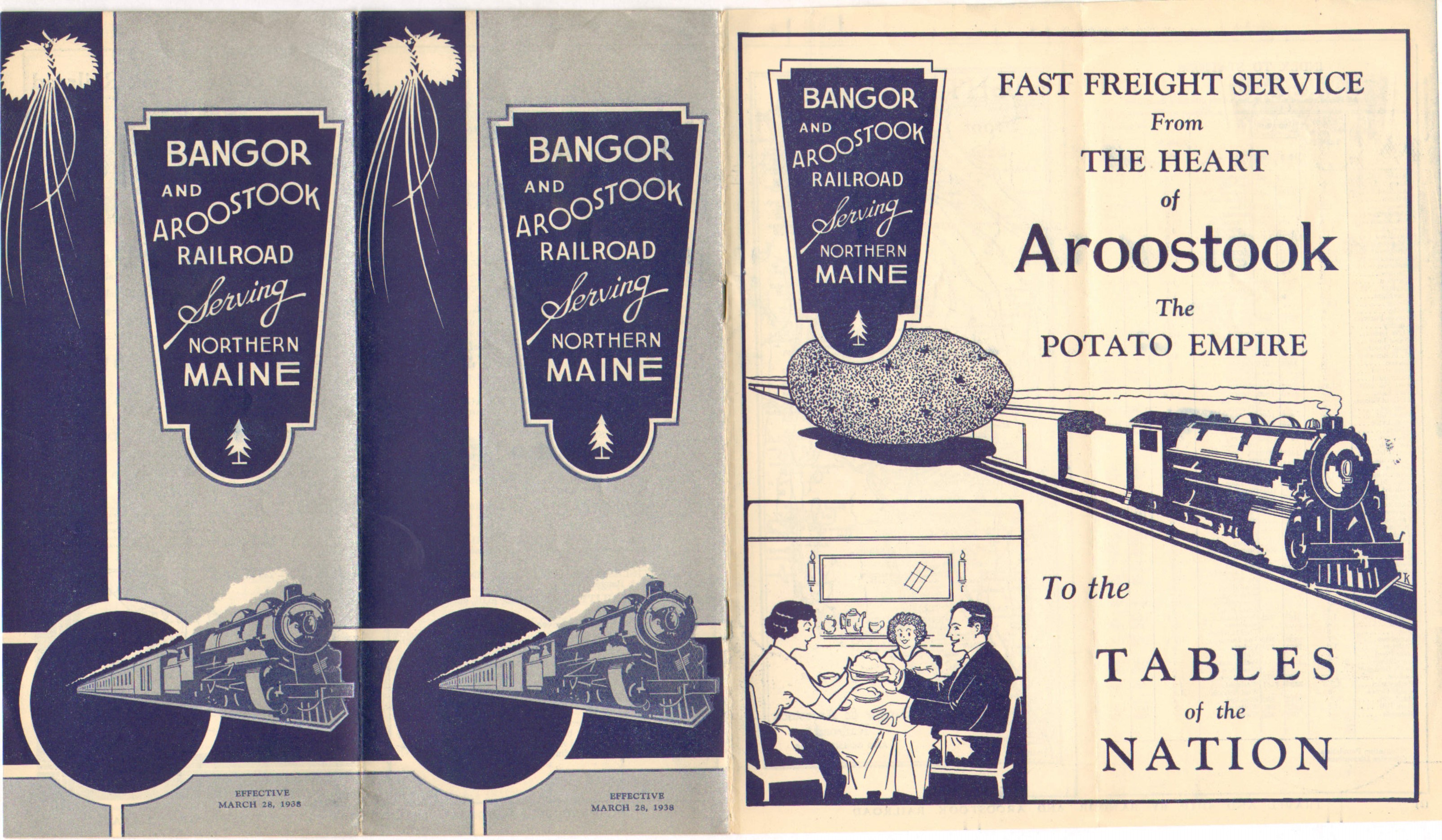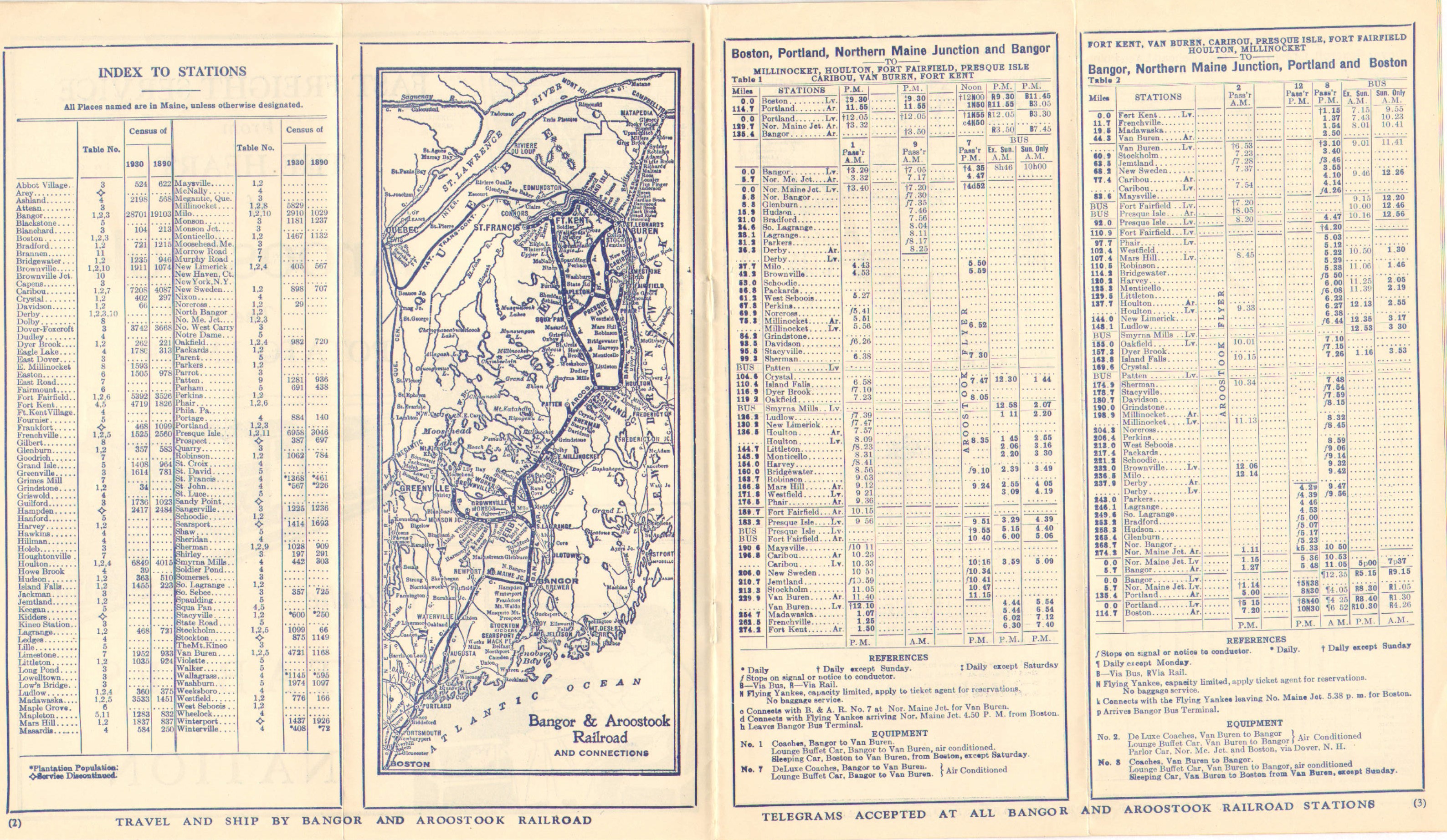 Some of these timetables have only either very small or no discernable differences between one and the next. This one however seems to have a fairly significant change - the column where the Southbound Aroostook Flyer should be is blank. Either the service has been cancelled or someone put the Aroostook Flyer text in the wrong column. Adding to the cancelled theory is that there is no listing for train #4, which would be the Southbound Flyer. However the schedule for train #2 looks like the Flyer's schedule although the column does not have the text. In the December 5, 1938 timetable we will see the Aroostook Flyer text in the column for train #2, which would seem to confirm that the service was still running, but the number changed.