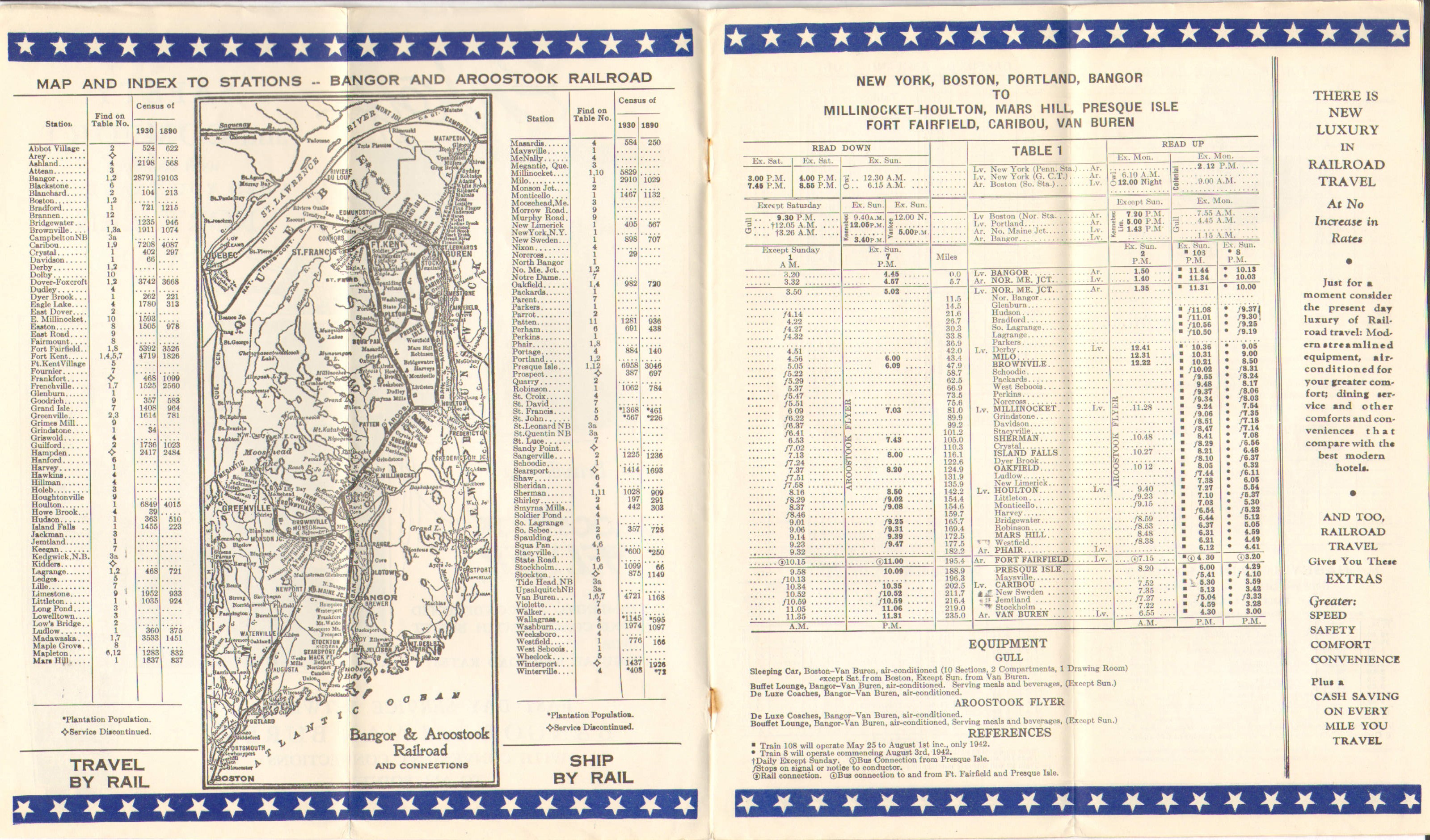 Effective about six weeks after the previous timetable in this collection, as one would suspect, very little has changed. The Patten and Island Falls table now shows three round trips per day, only one on Sunday however. The Presque Isle and Mapleton service is showing only bus service daily except Sunday. This also appears on the bus service page.