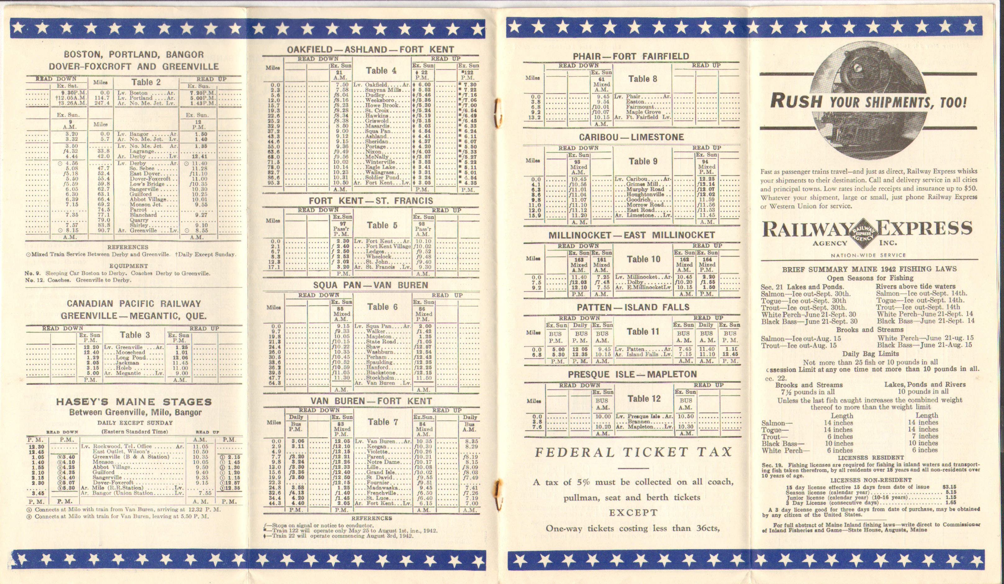 New in this issue - a Federal Ticket Tax - 5% on all tickets except one-way tickets less than 36 cents. 1942 Fishing Laws are also summarized in this timetable, right below the REA advertisement.