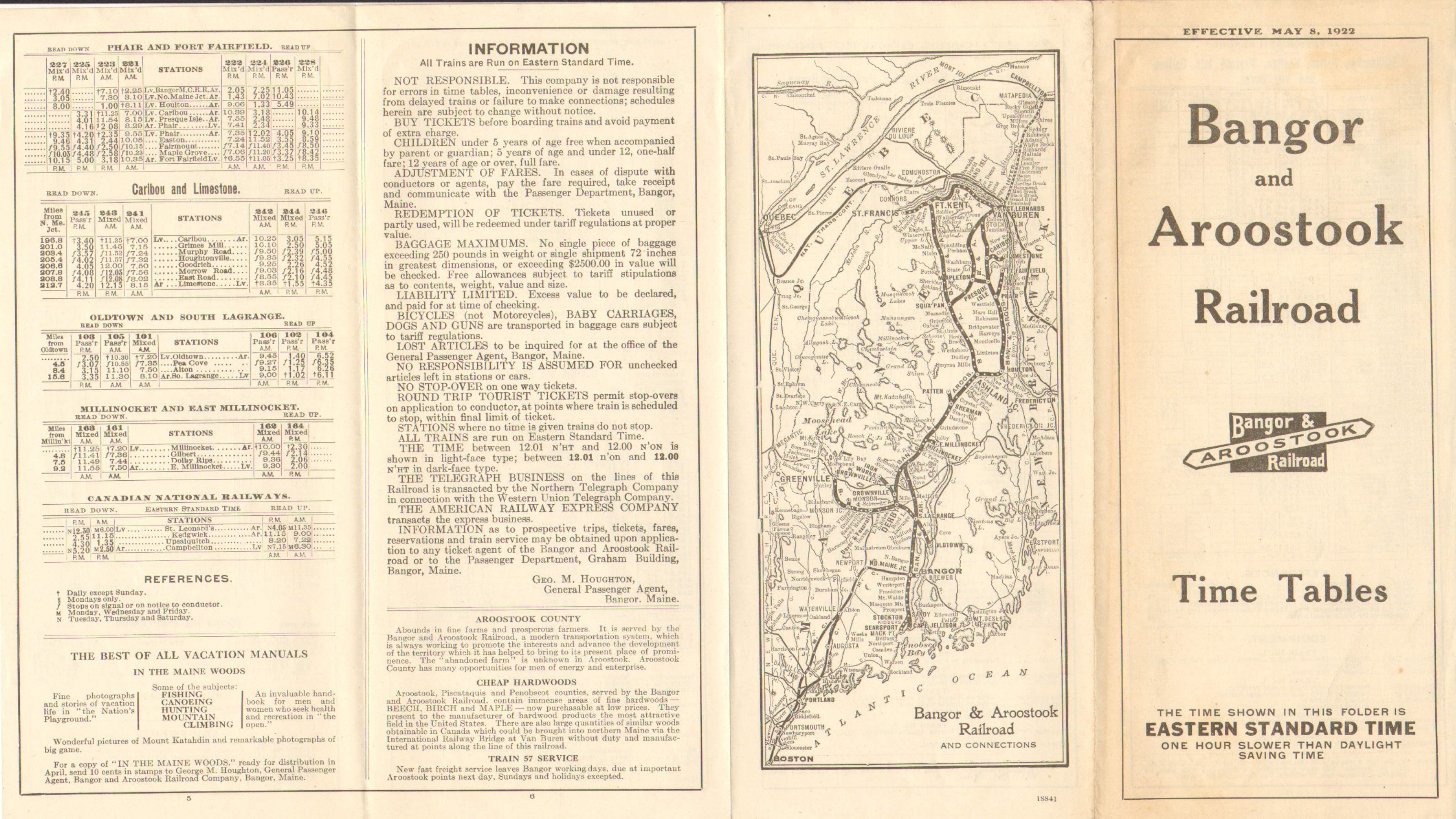 War time regulation has been gone for over two years by the time this timetable went into effect, however, we still have the minimalist style the United States Railroad Administration imposed in use. We are however beginning to see some emergence from that regulation crowd. The previous timetable in the collection contained a note about Freight Rates and the Cost of Living - this one has gone back to the pre-war policy of promoting Aroostook County as a vacation spot. Further, they describe Aroostook County as available for farmers and advertise cheap hardwood. Also announced is train 57 - a Fast Freight Service with overnight service from Bangor to Aroostook County.