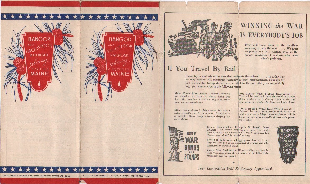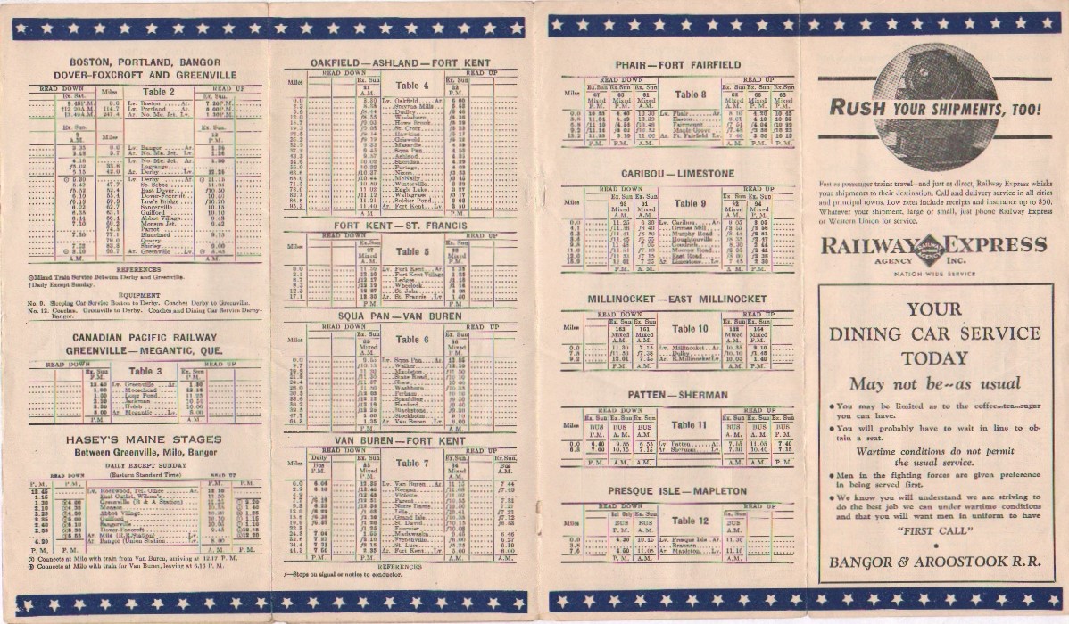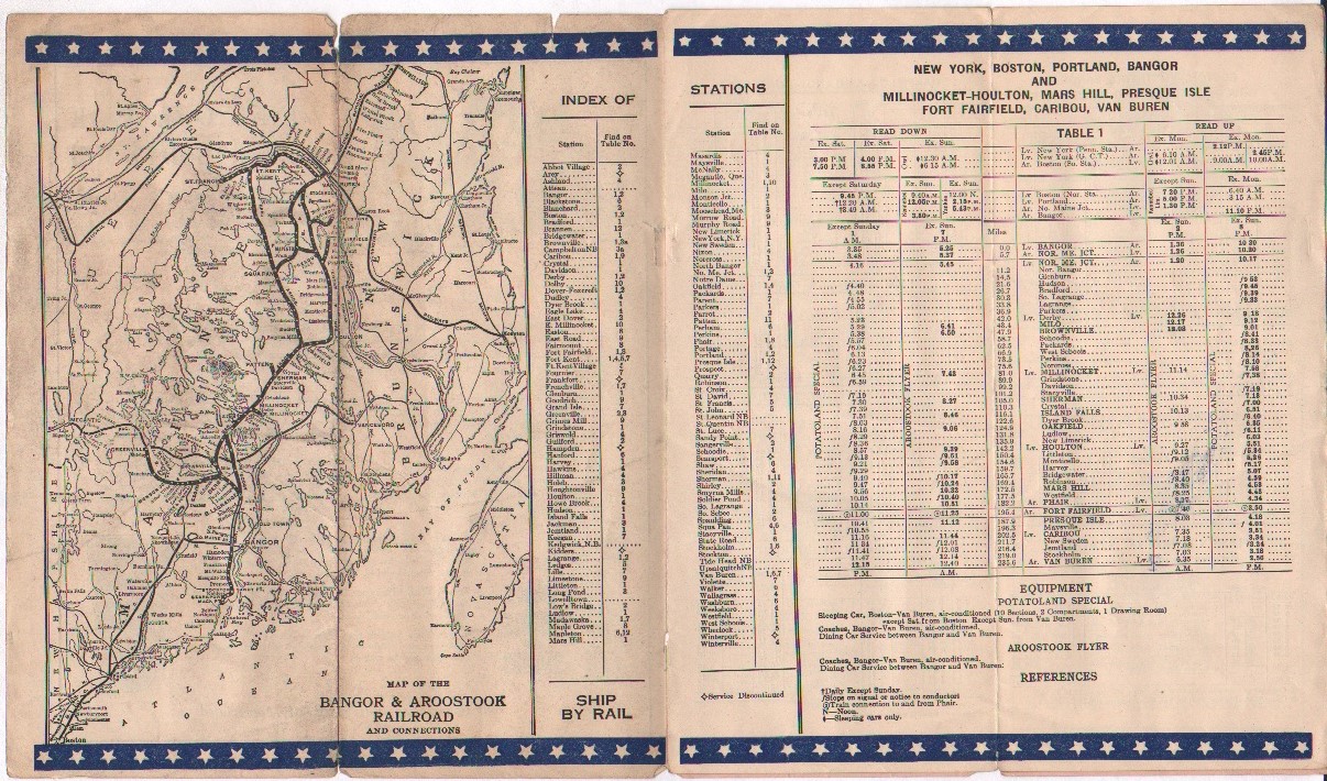 For the first time in this collection - the name Potatoland Special appears in print. The Bangor and Aroostook only had two 'name trains' for its entire history. A name train is very much a 'flagship' train - the best of the best. The Aroostook Flyer had been a name train for some time - but never carried sleeper cars. The Potatoland Special? Sleeper cars. Good thing too - it departs Bangor in the wee hours of the morning. In reality, the Potatoland is following the schedule of Trains #1 and #8, which has not changed much. Only the naming of the train, which passes it into legend has changed.