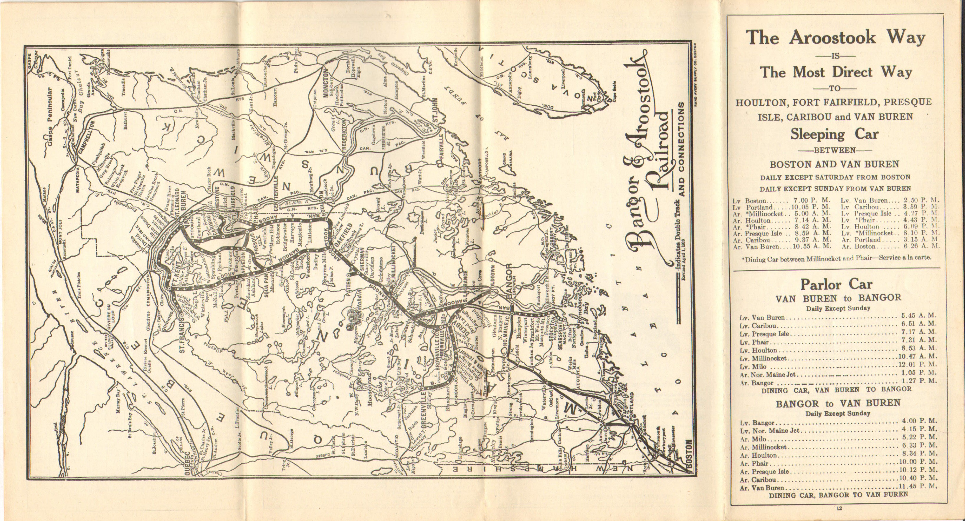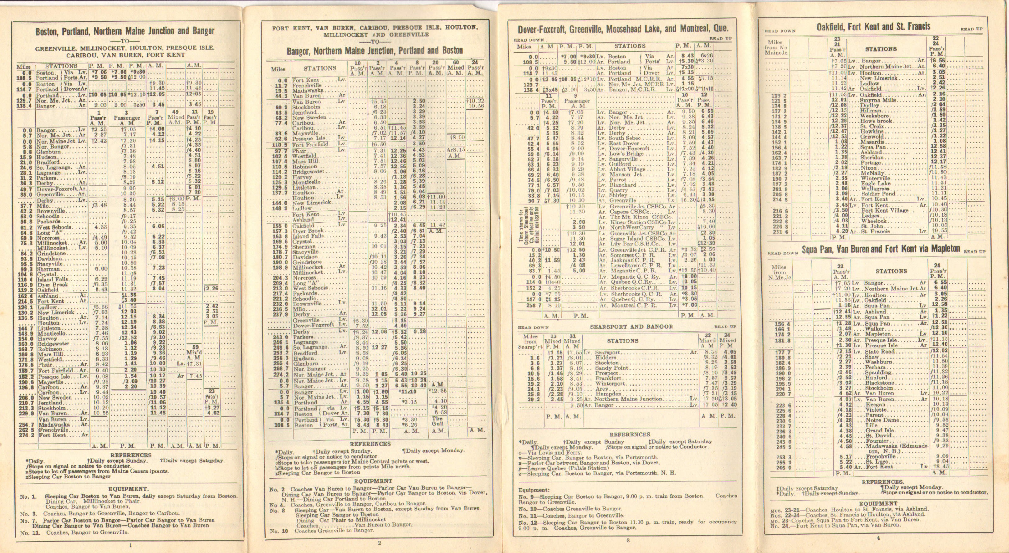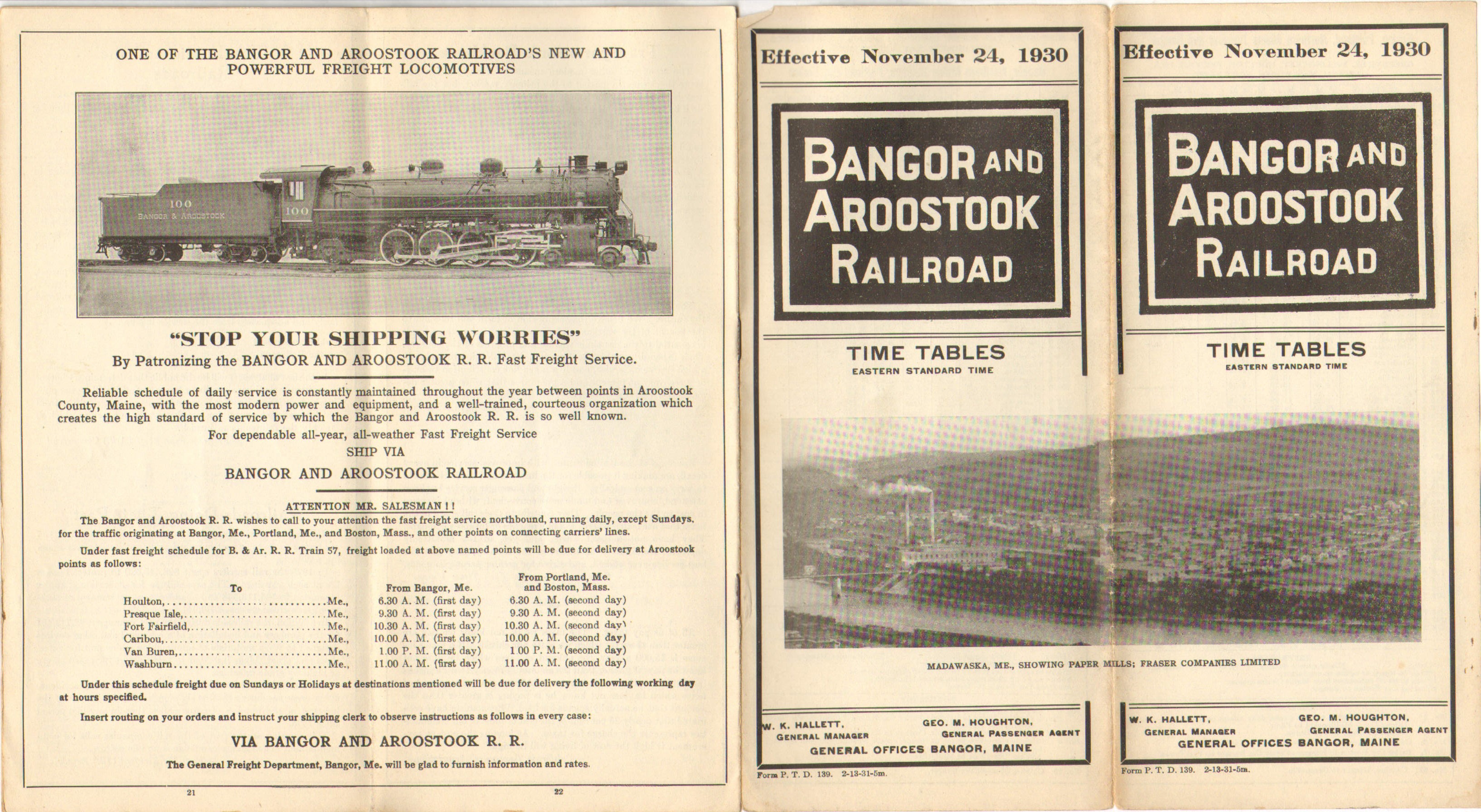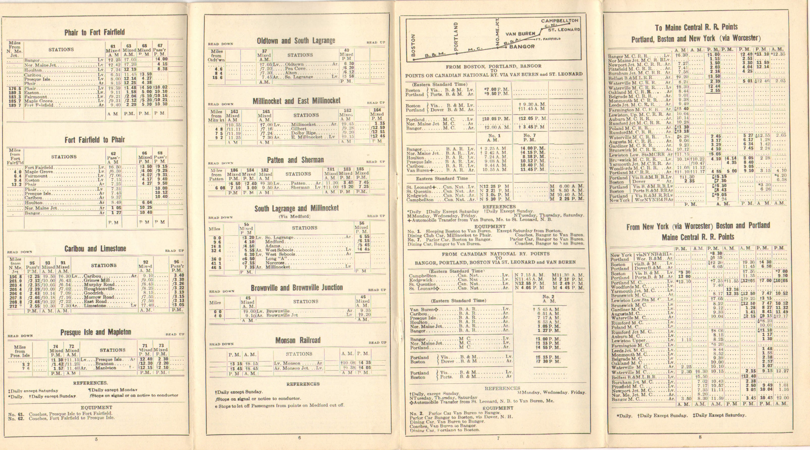 This timetable marks more than a year since the Crash of 1929 and about a year into the depression. The photo across the two covers this time is of the Fraser Paper mill in Madawaska, the inside spread retains the Fast Freight Ad for the third timetable in this collection. One service change, the single mixed train between South LaGrange and Oldtown has been split up - instead of running both directions in the afternoon as the previous timetable indicated, this edition shows a morning mixed from Old Town and an evening return train. Interestingly, the South LaGrange to Millinocket via the Medford Cutoff passenger service a couple of sections down on the same page shows that this service does not match up at all with the Mixed from Old Town. The service on the Main Line however does match up reasonably well with the Mixed to Old Town, with one Northbound in the morning and one Southbound in the evening offering a close connection with the Old Town mixed. Service on the South LaGrange to Old Town line would be discontinued within three years.