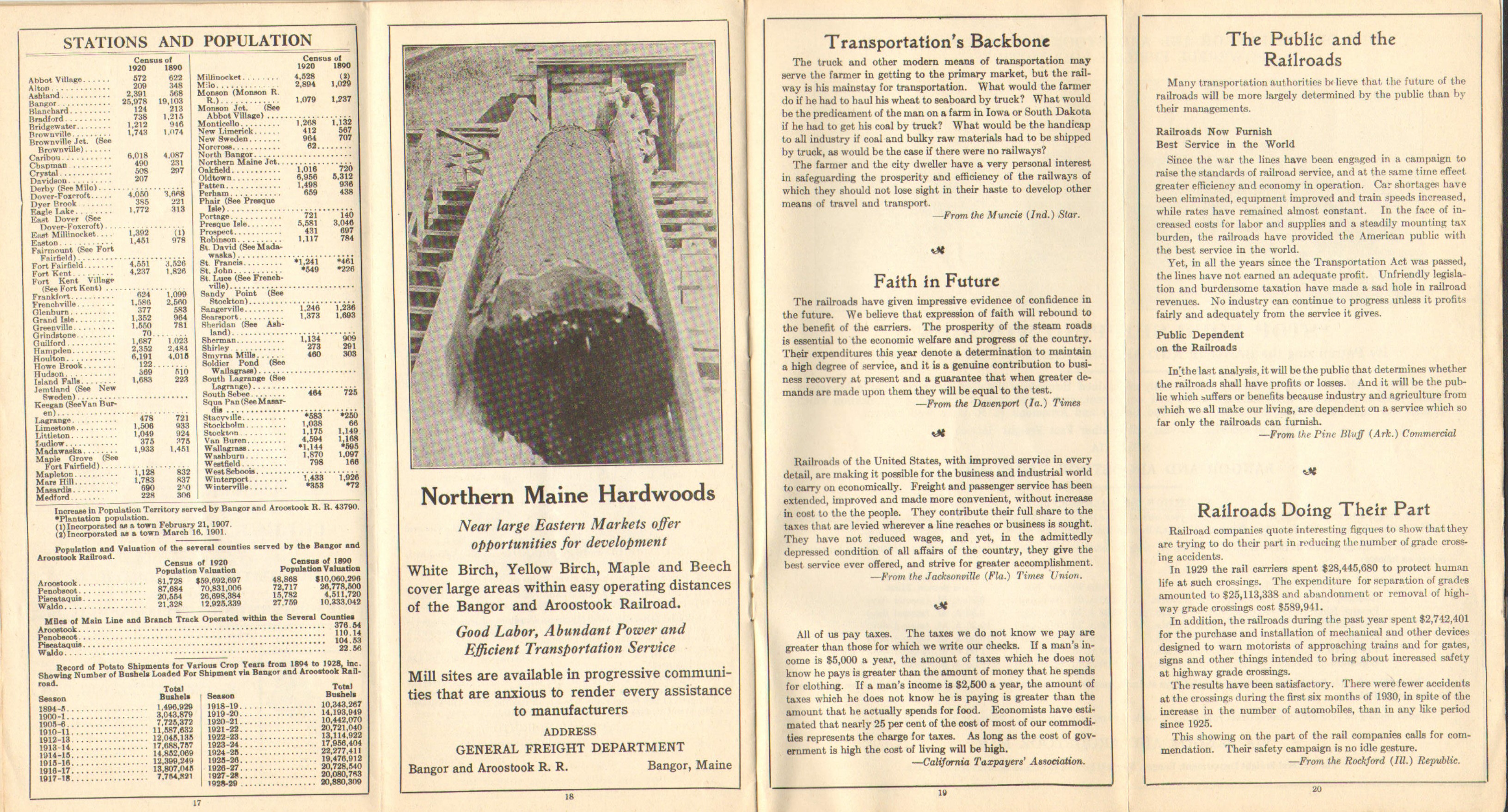 Elsewhere in the timetable, more space is devoted to information about connections on the Maine Central, Boston and Maine and New Haven railroads, taking one anywhere from Portland to New York City. Parlor car and Pullman service is still being pushed, but one could reasonably assume that the volume of passengers was down. Pages 19 and 20 are devoted to several short quotes regarding how good railroads are, how much they pay in taxes and how the railroads will be there no matter what happens in the future. None of these appear to be written by the B&A.