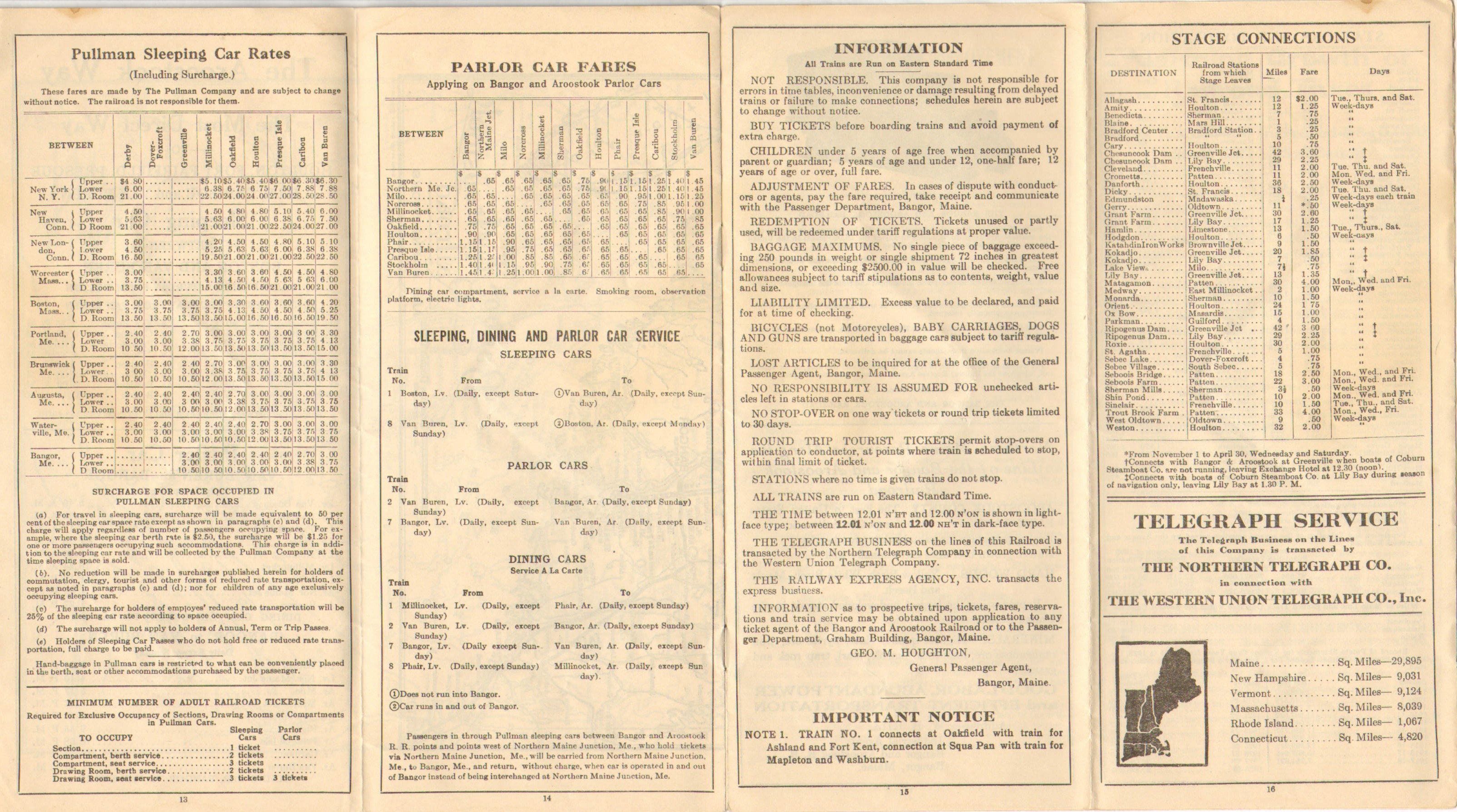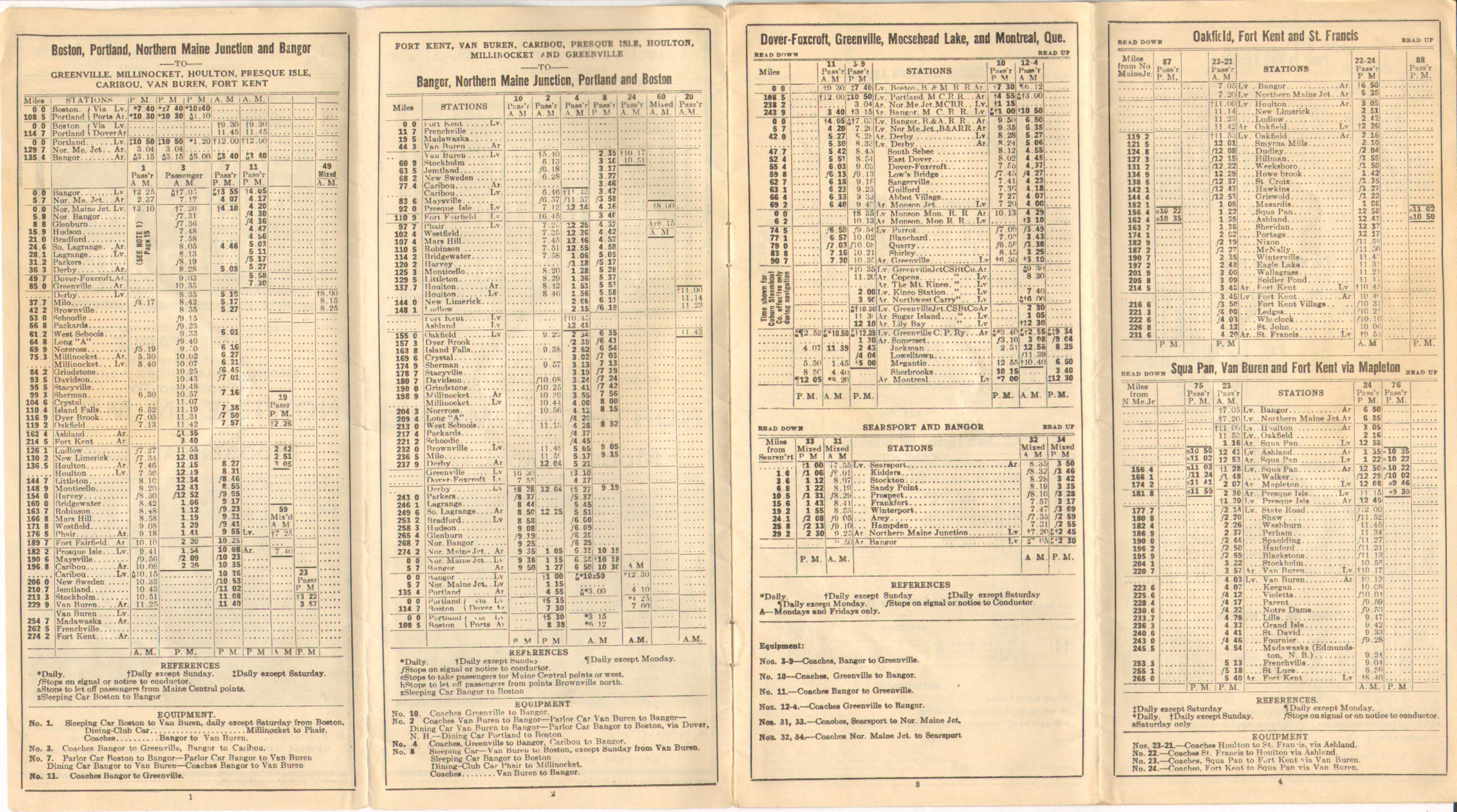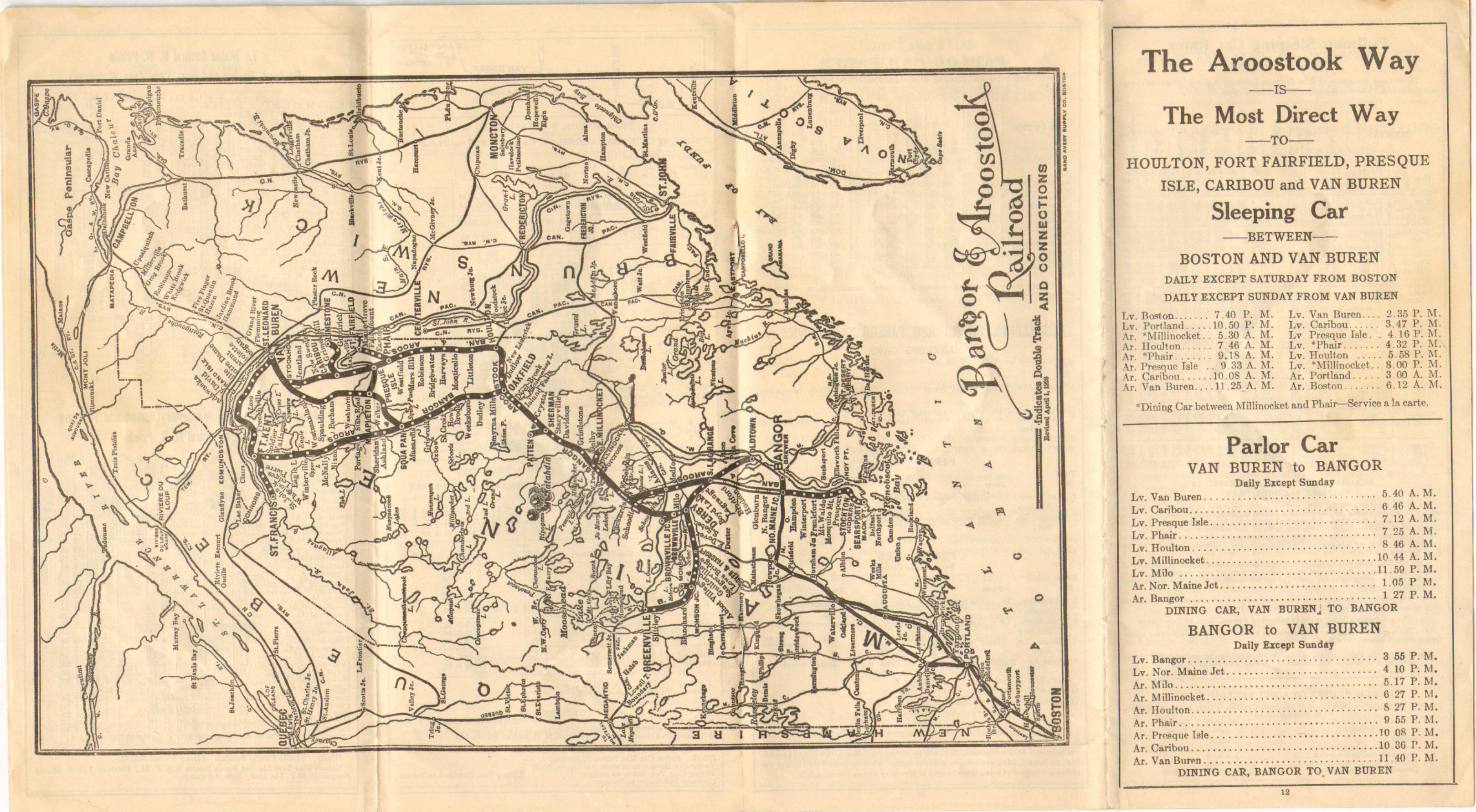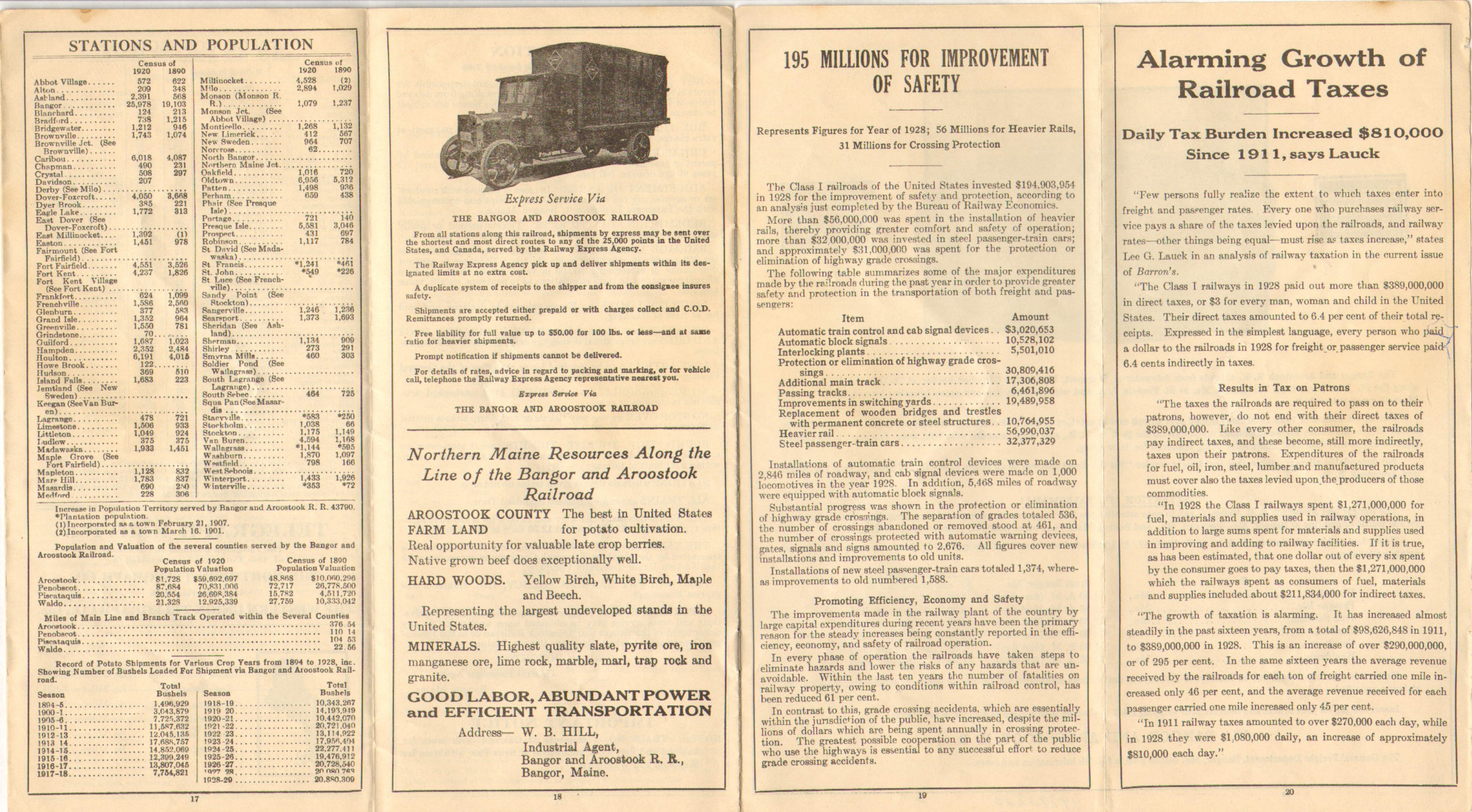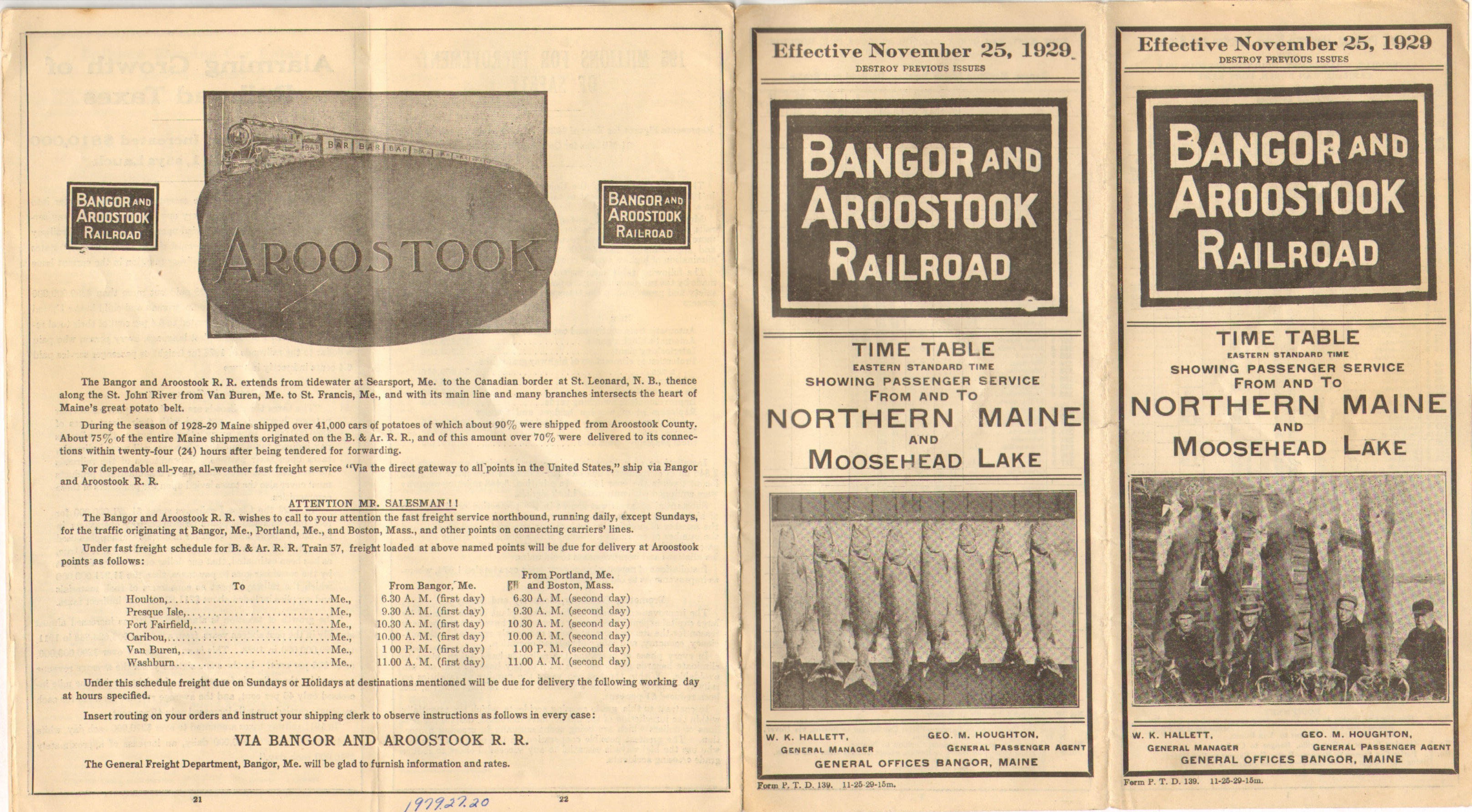 The first timetable in this collection published after the Crash of 1929 and it seems little has changed. Hunting and fishing are on the covers, but the entire inside double page is devoted to promoting the railroad directly, specifically Potato Traffic. In the latter pages are some facts and figures on improvements railroads have made and the 'Alarming' growth of railroad taxes. Perhaps because this timetable was probably authorized for printing around the time of the Crash and because of course no one knew that the Great Depression was coming no changes to service have yet been made.