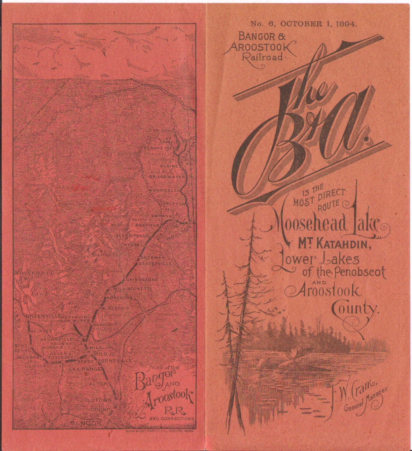 A bit more than three and a half years after the railroad was chartered, regular trains are now running as far a Houlton. Connecting trains to Bangor, Boston and Portland are listed as well. Visually this is much more interesting than the 1893 offering, including a map, the original stylized B&A log and promoting transportation to tourist and hunting areas via Mt. Katahdin and Moosehead Lake.