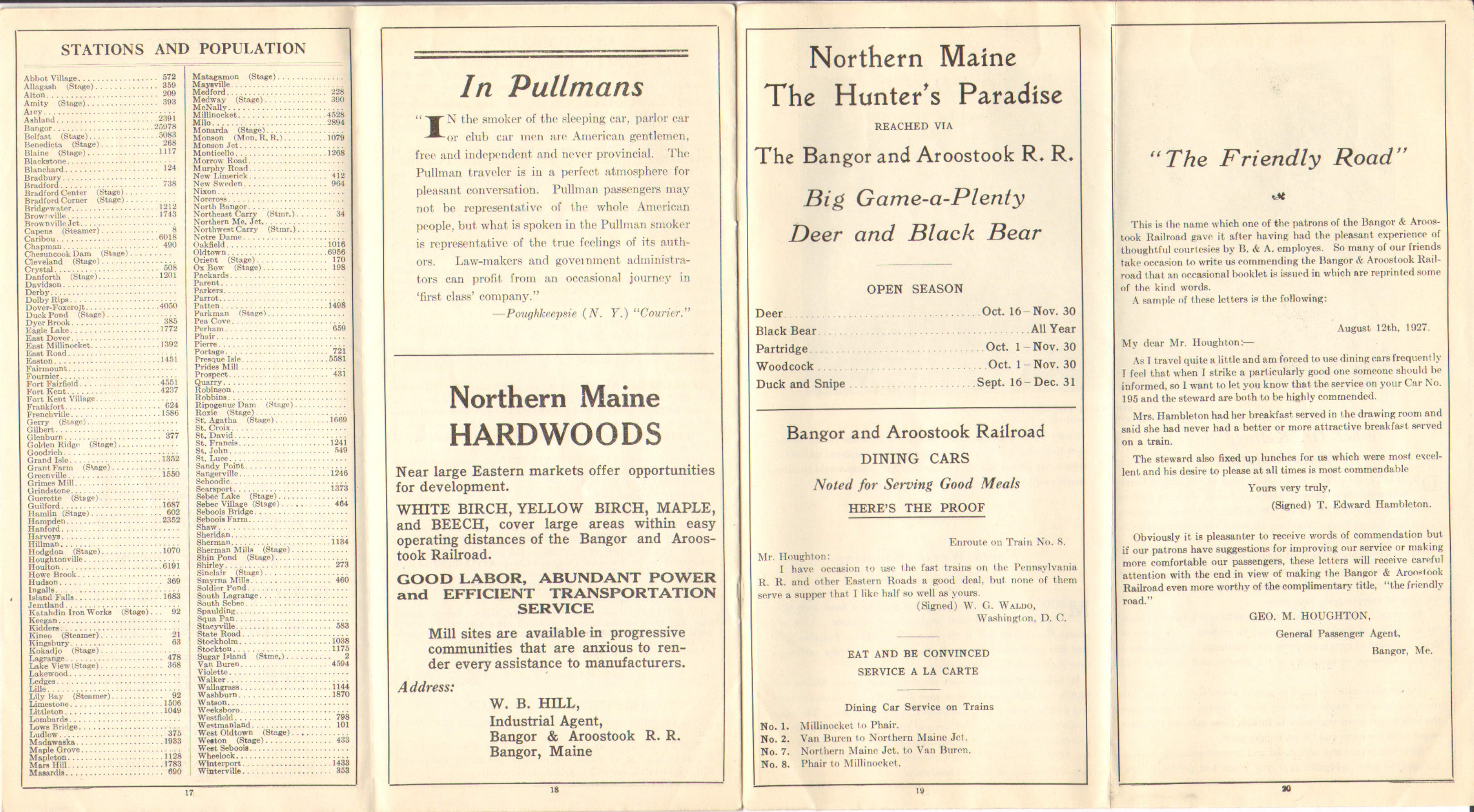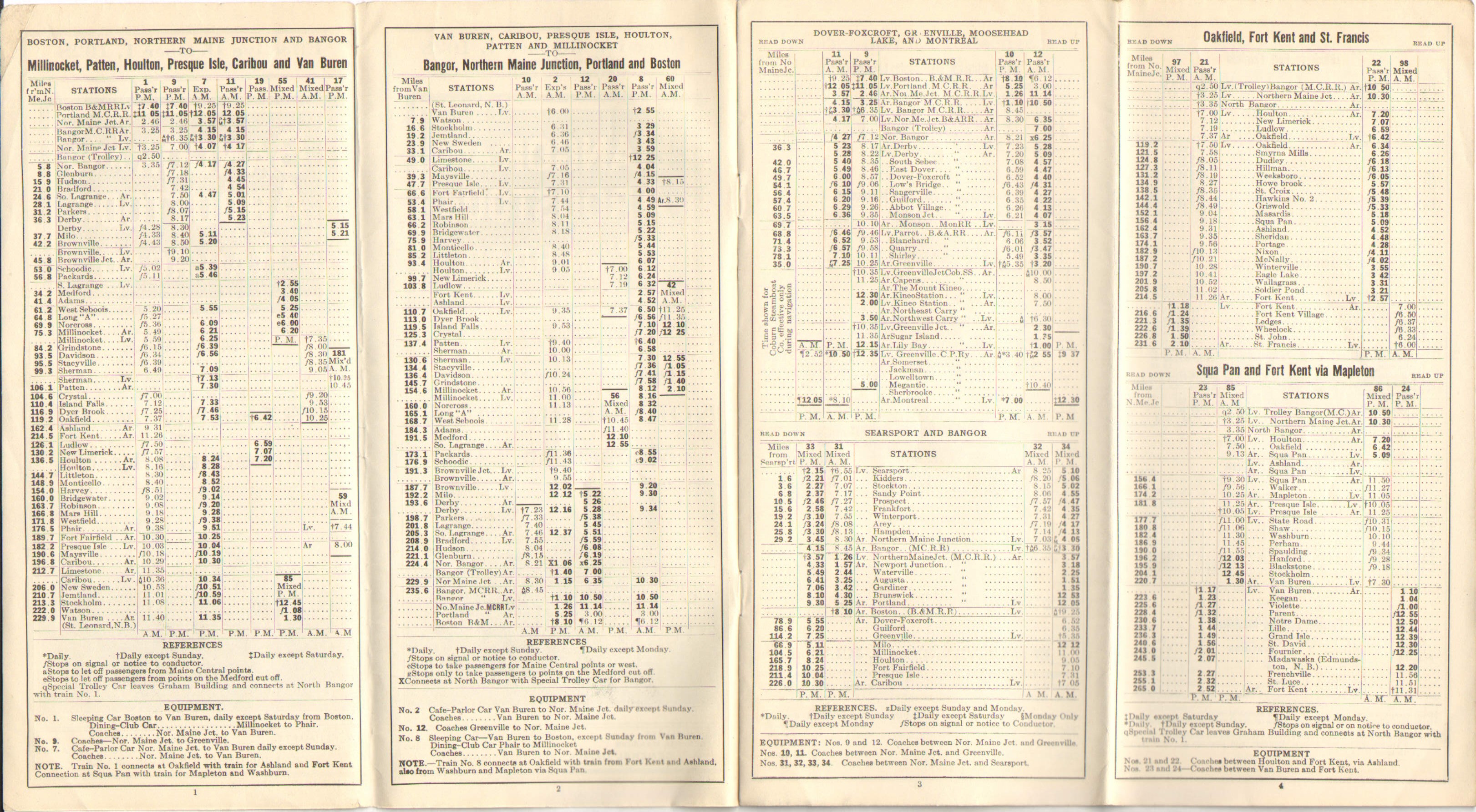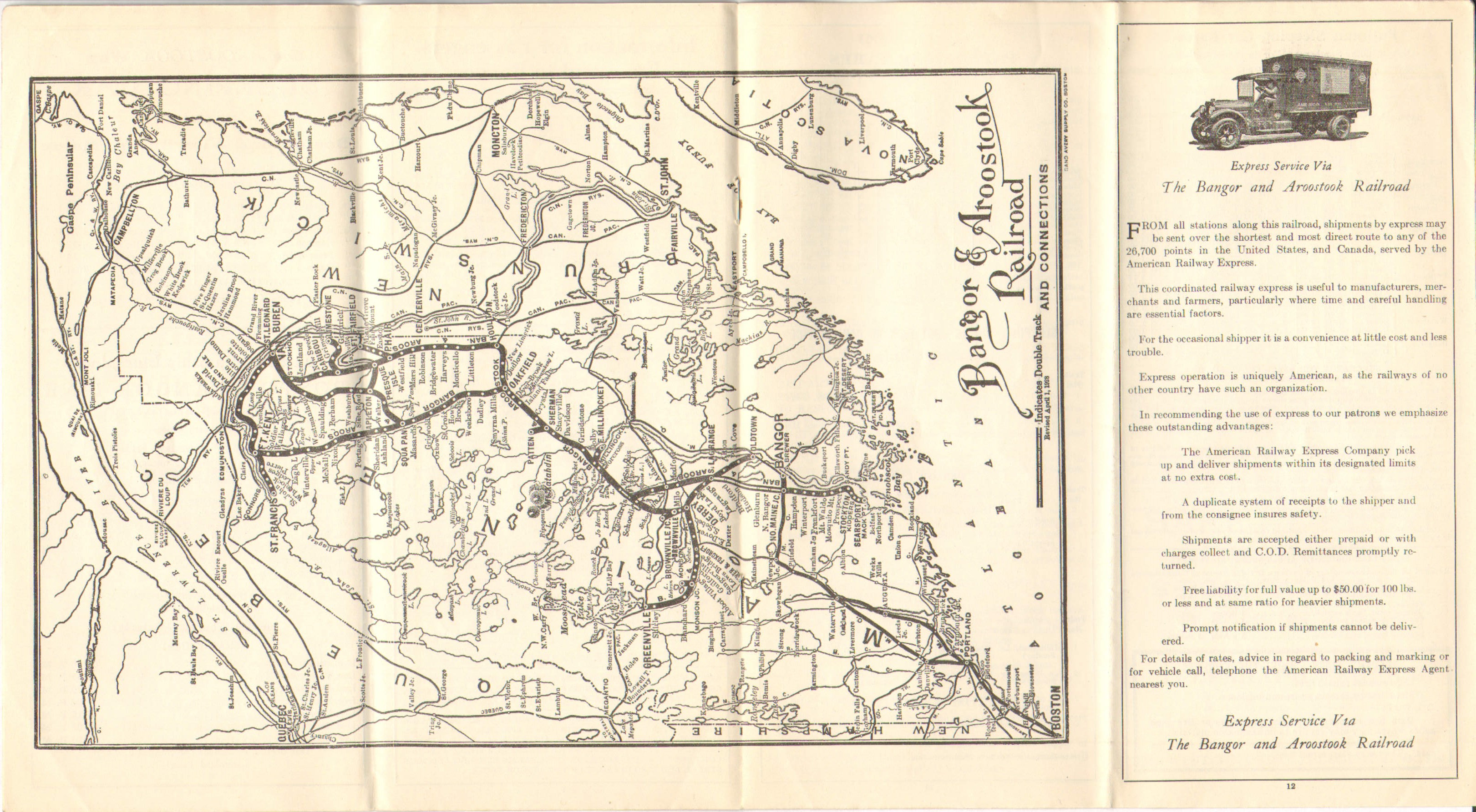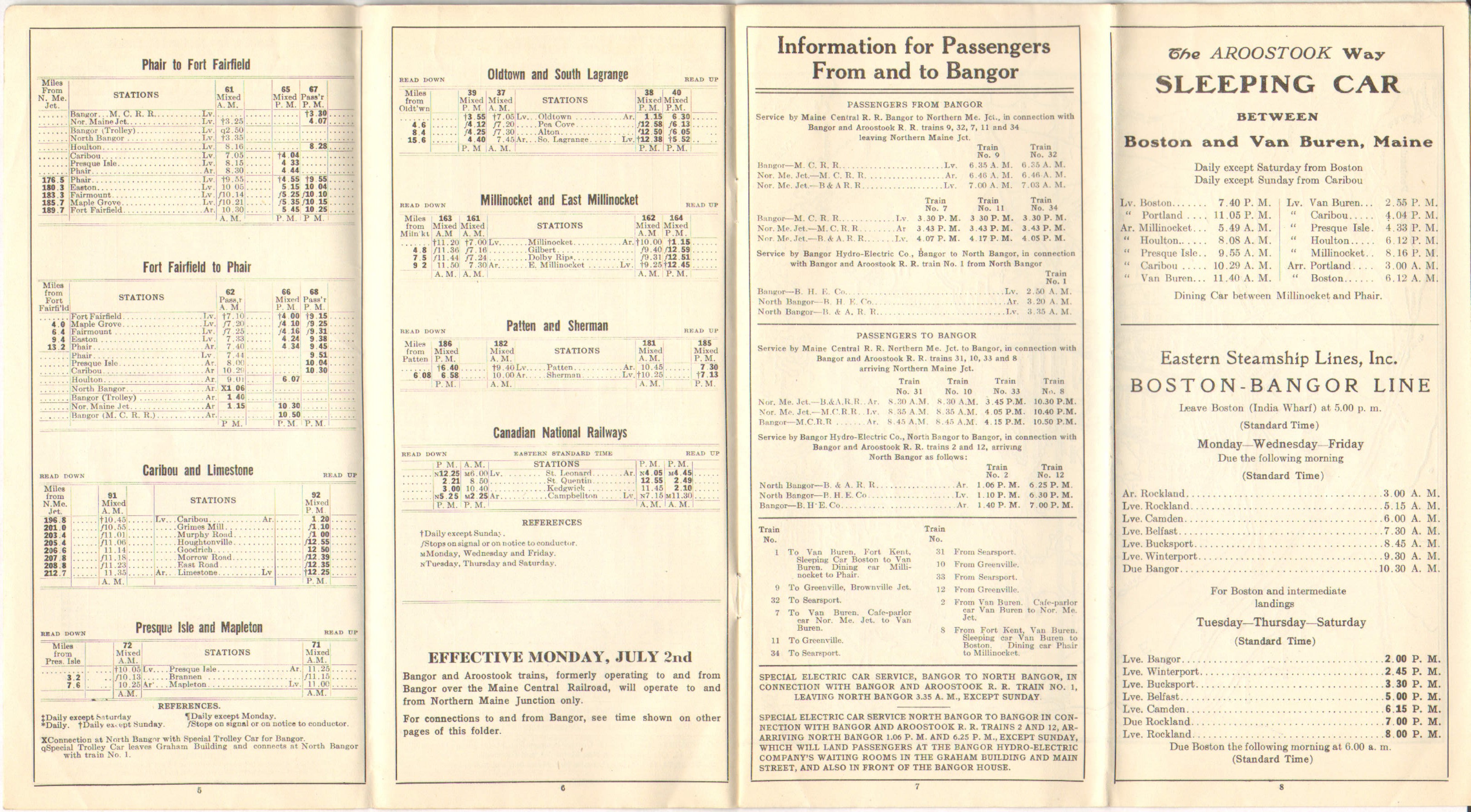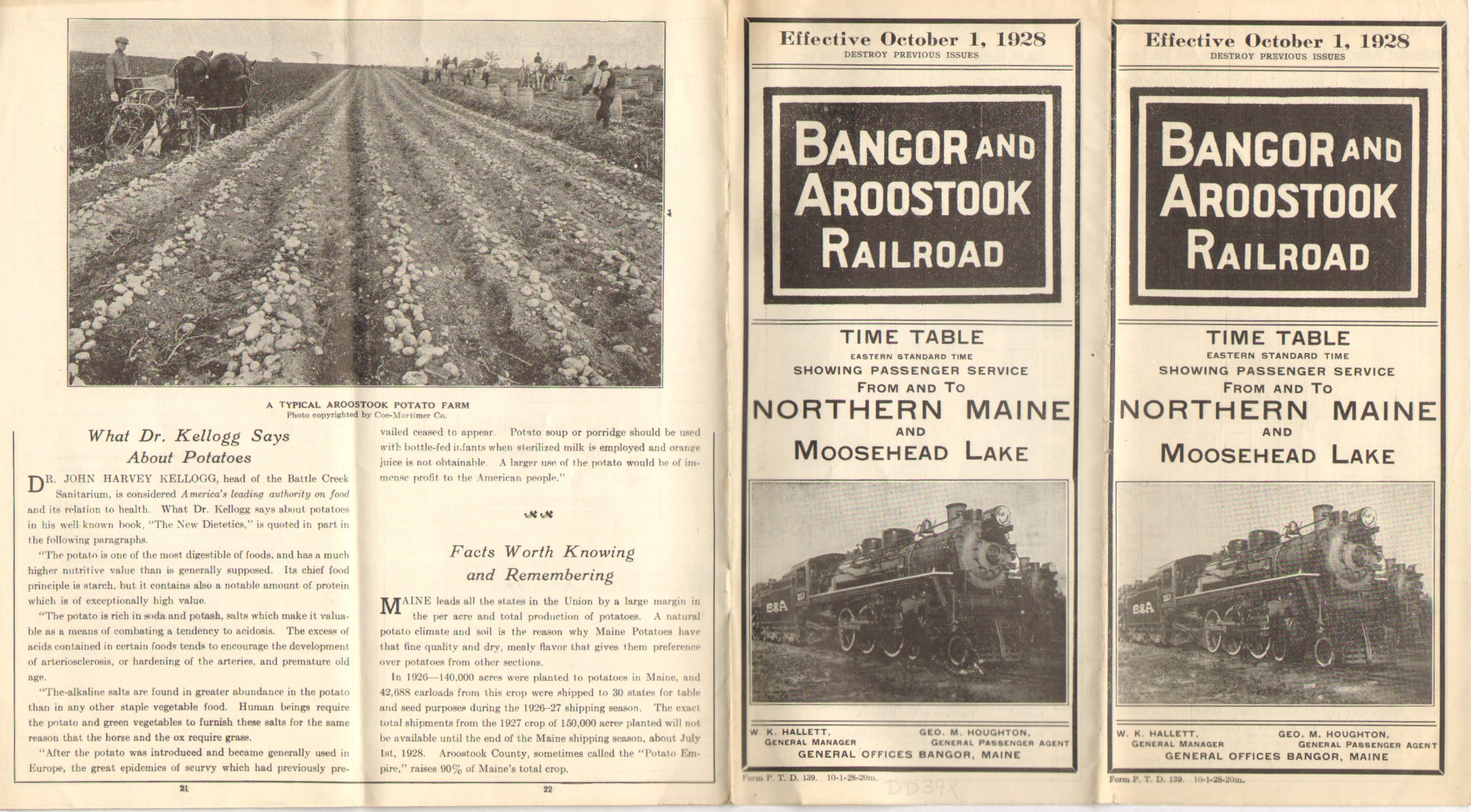 The previous 1928 Timetable, from July 2, appears to have been released purely to advise that there was no longer direct service to and from Bangor Union Station on Bangor and Aroostook trains. This one, October 1, has page 7 devoted entirely to 'Information for Passengers From and to Bangor'. Evidently, the Bangor and Aroostook had made an effort to coordinate with the Bangor Hydro-Electric Company's trolleys. The service to Charleston on the trolley passed under the B&A's Main Line in North Bangor. With the train unable to service Bangor directly, the Hydro was providing a connection to downtown Bangor from North Bangor. Although this location had been serviced by the trolley line since the line was built, one presumes that closer coordination between the two was established. Although the trolley did not get one to Bangor's Union Station, it did get one into the general area.