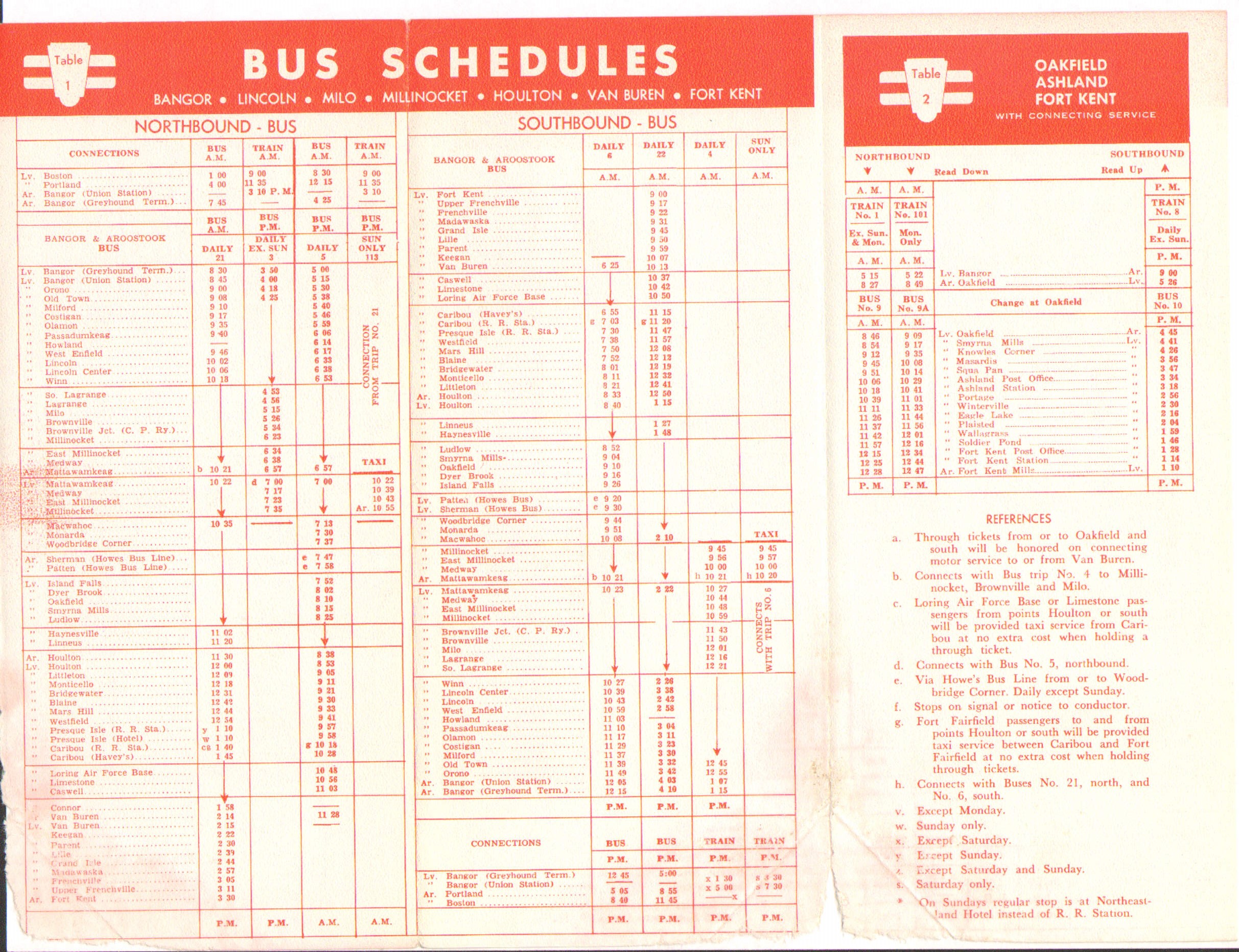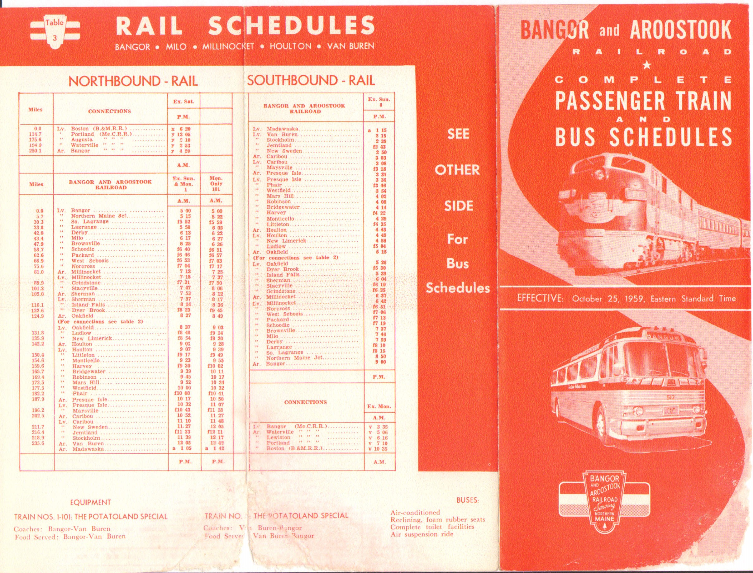 Within a year of this timetable going into effect, the Maine Central would pull all passenger train operations and shut down Bangor Union Station. Although no one knew it, the clock was ticking on passenger rail. The B&A had gone to the Public Utilities Commission in 1959 requesting permission to abandon passenger rail service - that was denied. Declining ridership was nothing new and for the first time the rail and bus timetable is a single tri-fold brochure, double sided. Gone is the map of the State of Maine - gone are all advertisements and information not directly related to the the buses and trains.