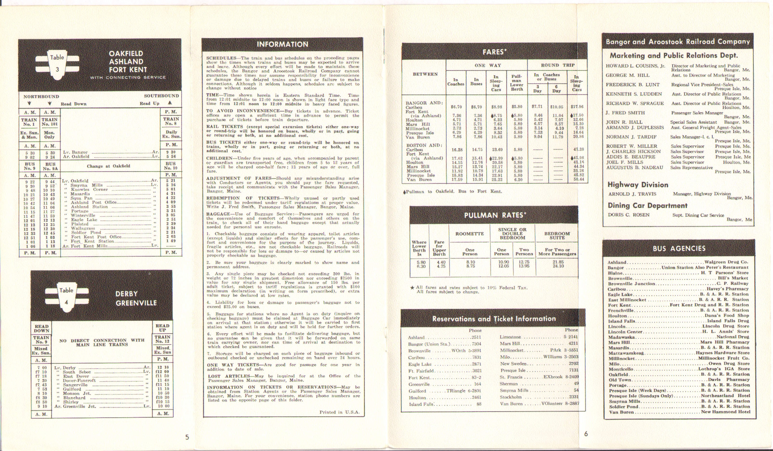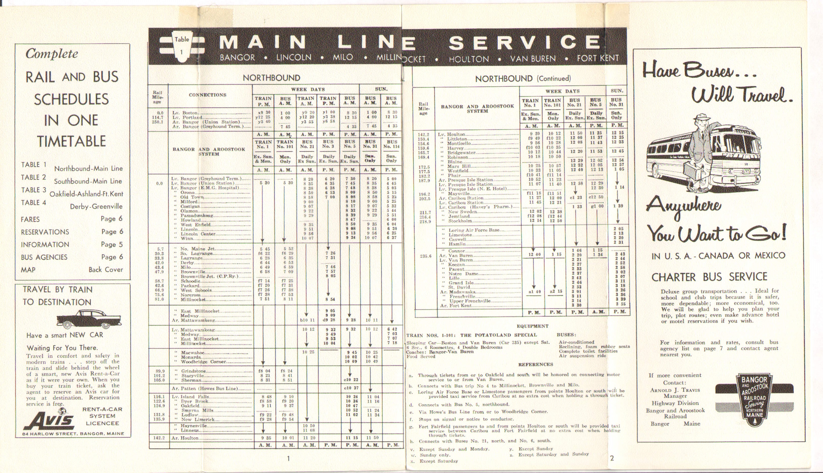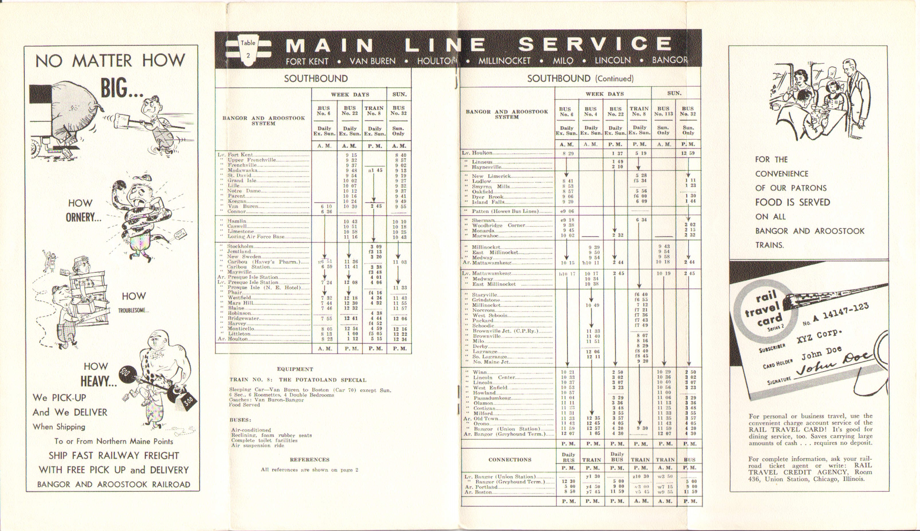 Considering the bright, colorful, treatment the bus only timetable got earlier in 1958 makes the black and white treatment on this one seem odd. When one opens to the timetable page it appears that a shocking number of trains are running. A more detailed look quickly reveals that only one train is running, six days per week. The Potatoland Special is the lone passenger train left. It still offers food service and sleeping car service in both directions, but one wonders how much of that is making money and how much of that is refusing to give up on passenger car service. Perhaps most telling is the advertisement for the Avis Rent-a-Car system, which the B&A was a licensee at this time. Even the railroad has gone into the automobile business. The railroad is promoting the Free Pickup and Delivery service for freight and you can still get a Pullman car on the Potatoland Special.