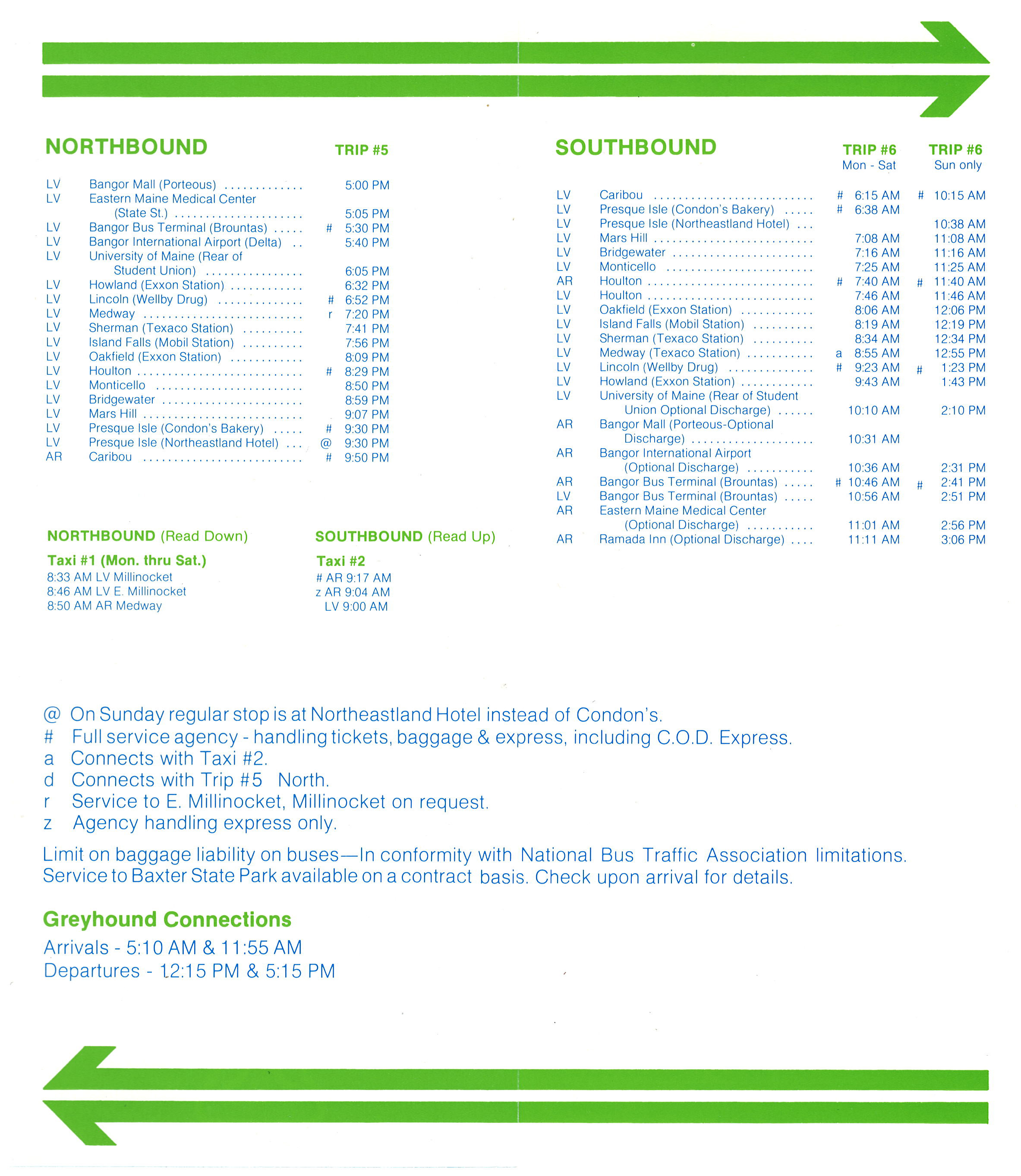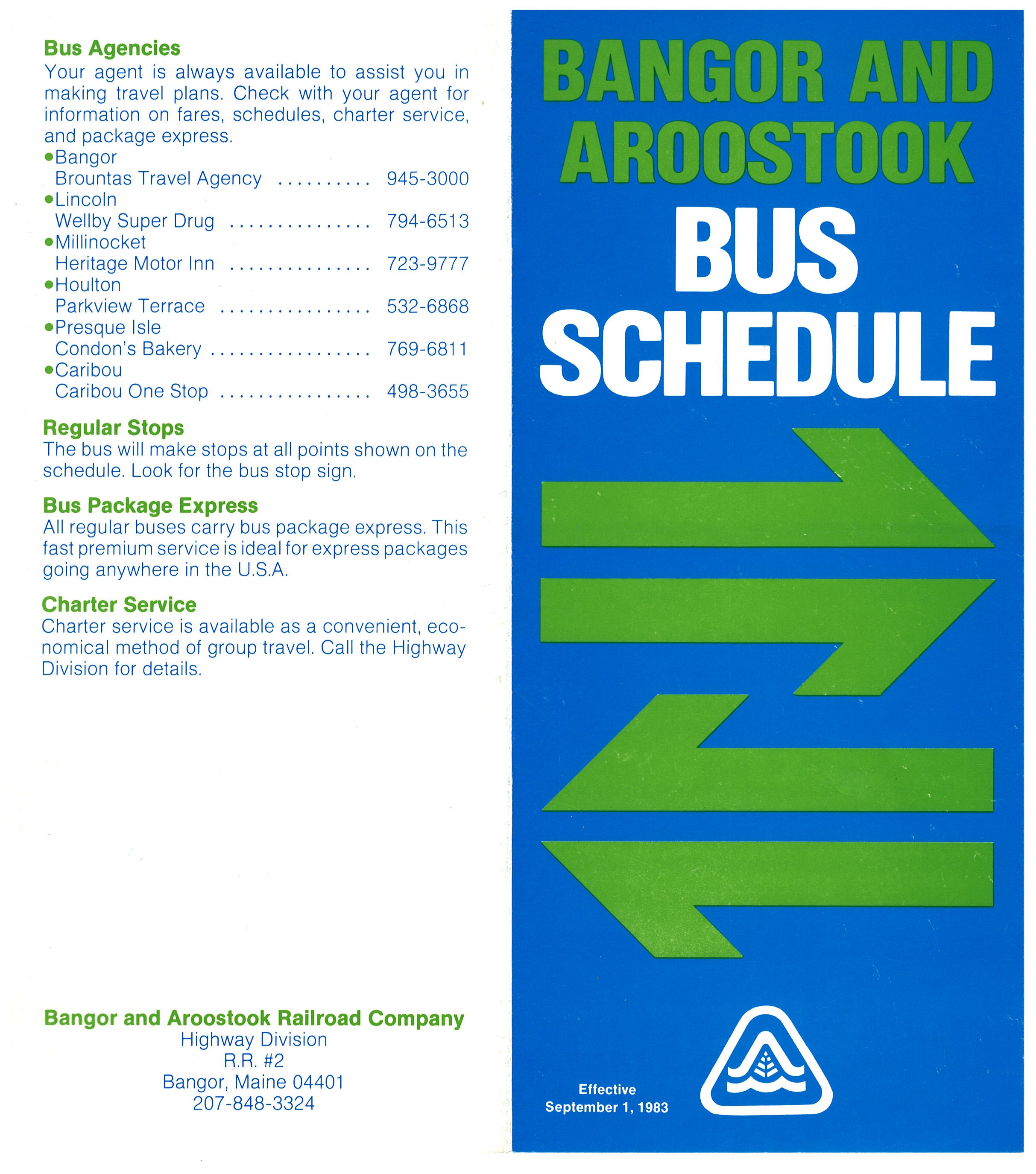 Released less than five months before the Bangor and Aroostook bus service ended, this is the last public timetable ever released by the railroad. Much like the rail service listed in the 1961 timetable - the bus is down to one trip each way, although buses continue to run daily. Although it is a small thing in the grand scheme, this timetable is a different, smaller size of paper compared to those in the past. Further, it is only a sheet folded in half. The graphics are simple and straight forward with no photographs. Cost was obviously a factor on this timetable.