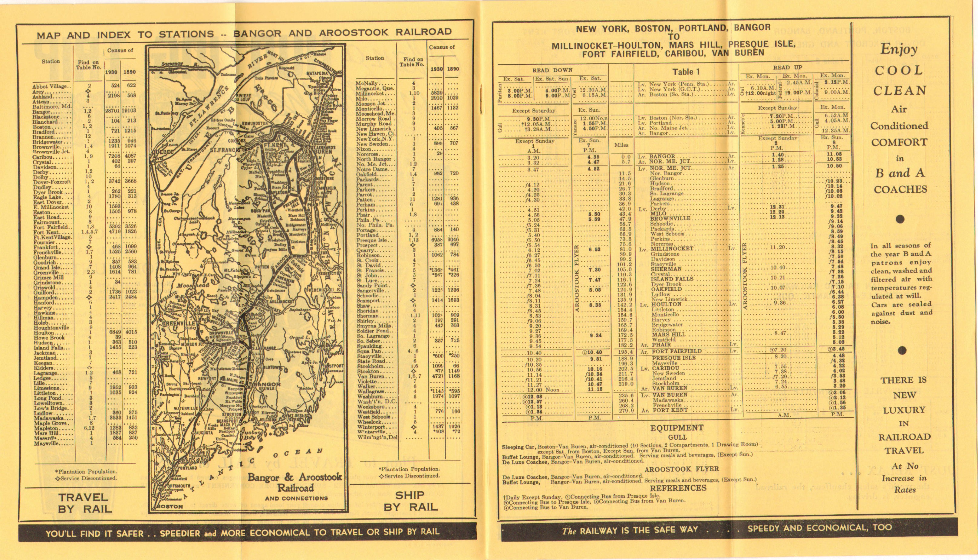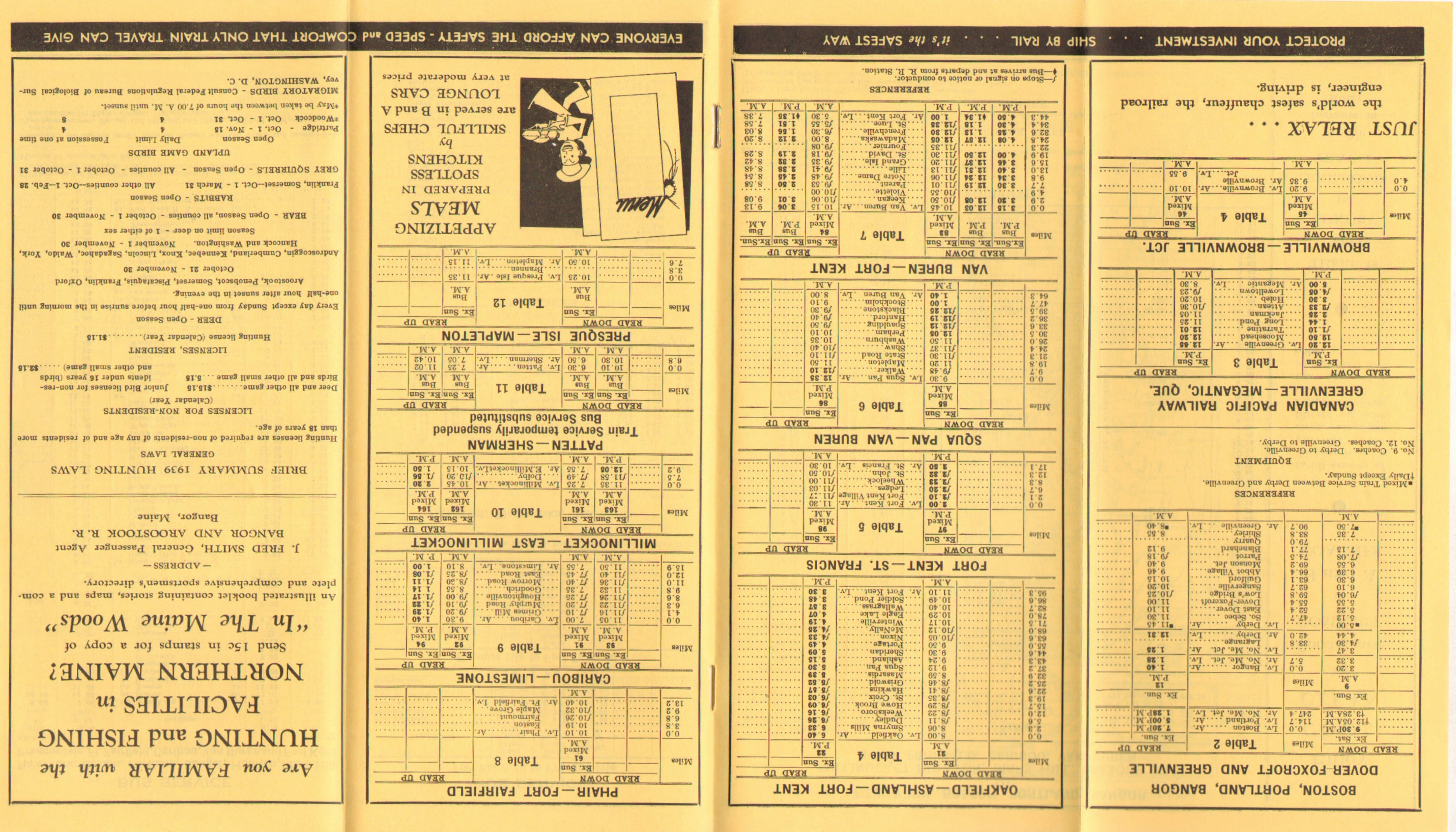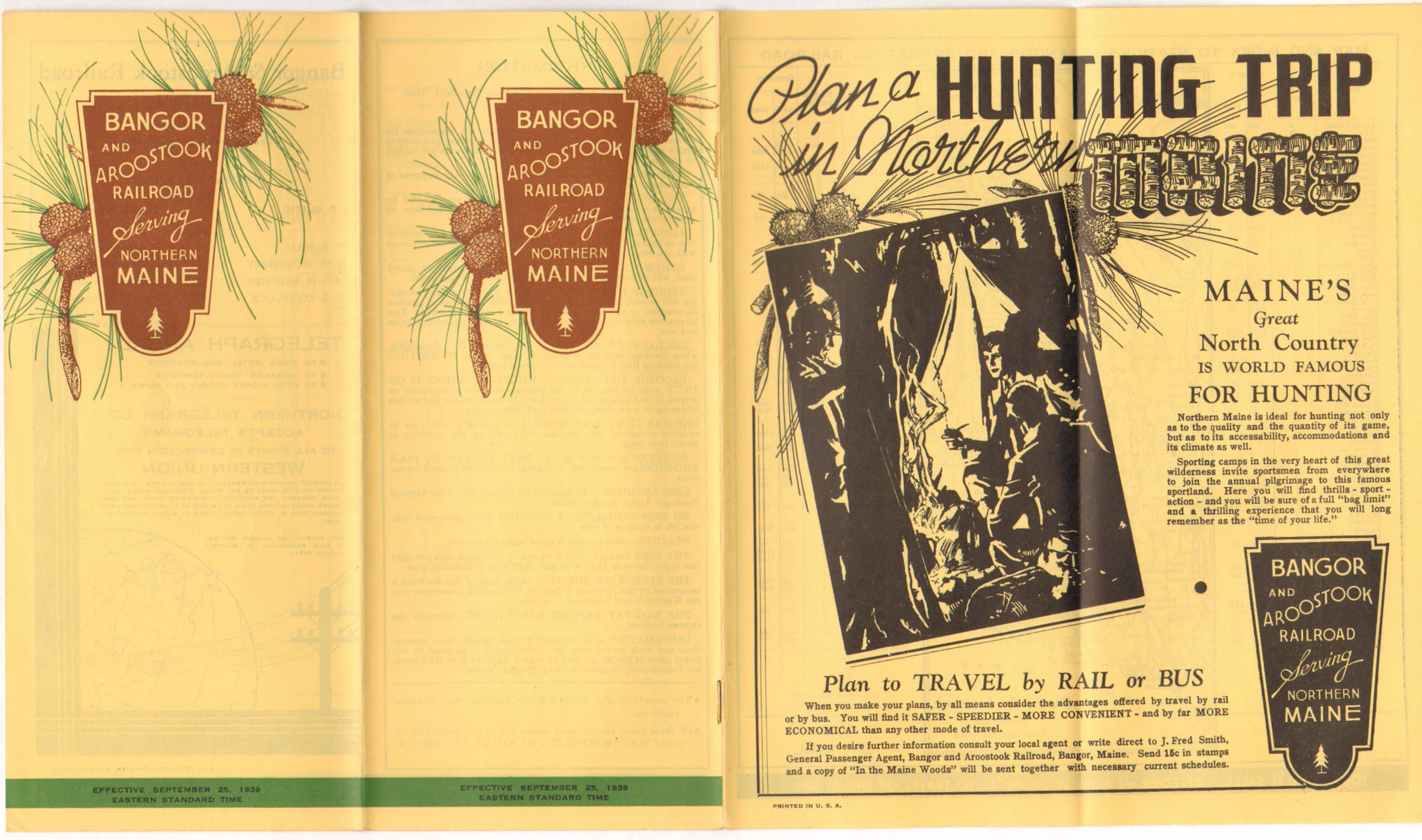 A radical design departure from the previous timetable, this particular cover variation features the railroad's keystone logo in red with with green pine needles behind. Although the logo is the most colorful version we have yet seen, the rest of the cover is, by contrast, rather spartan. The inside double page has an advertisement for hunting in Northern Maine and for the first time in this collection, the phrase 'Plan to travel by rail or bus' appears, putting the buses on even footing with the train. The Station index and map has been radically redesigned, with the station list now surrounding the map. The station list now includes destinations outside the state, Washington D.C. being an obvious one. The timetable on the facing page retains the style from the previous timetable, referencing trains all the way to New York's Penn Station. On the next page, we are offered "Appetizing Meals" at "very moderate prices" in B&A lounge cars. In the Maine Woods is still available, but unlike the last time it was mentioned in a timetable, the price has increased, to 15 cents, up from 10 cents.